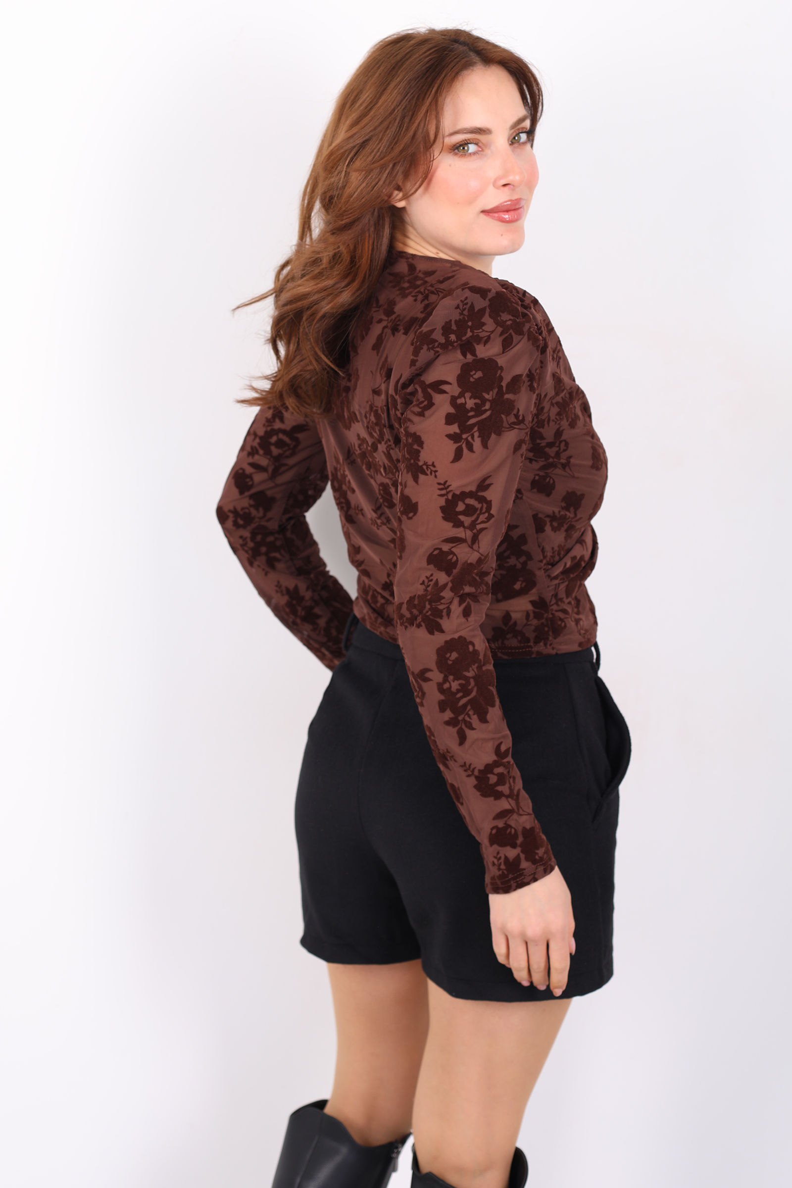 Bu kahverengi tül bluz, kadife desenli dokusu ve zarif güpür detaylarıyla sofistike bir hava sunar. Kruvaze yaka tasarımı, omuz ve boyun hattını estetik şekilde çerçeveler; hafifçe dökülen tül kumaş ise hem hareket özgürlüğü hem de feminen bir duruş sağlar. Günlük stilinizde jean pantolon ve rahat ayakkabılarla modern bir kombin yaratabilir, etek veya kumaş pantolonla daha özel davetlere uygun şıklık elde edebilirsiniz. Kahverenginin sıcak tonu, mevsimsel trendlerle uyumlu olarak gardırobunuza elegan bir dokunuş ekler.