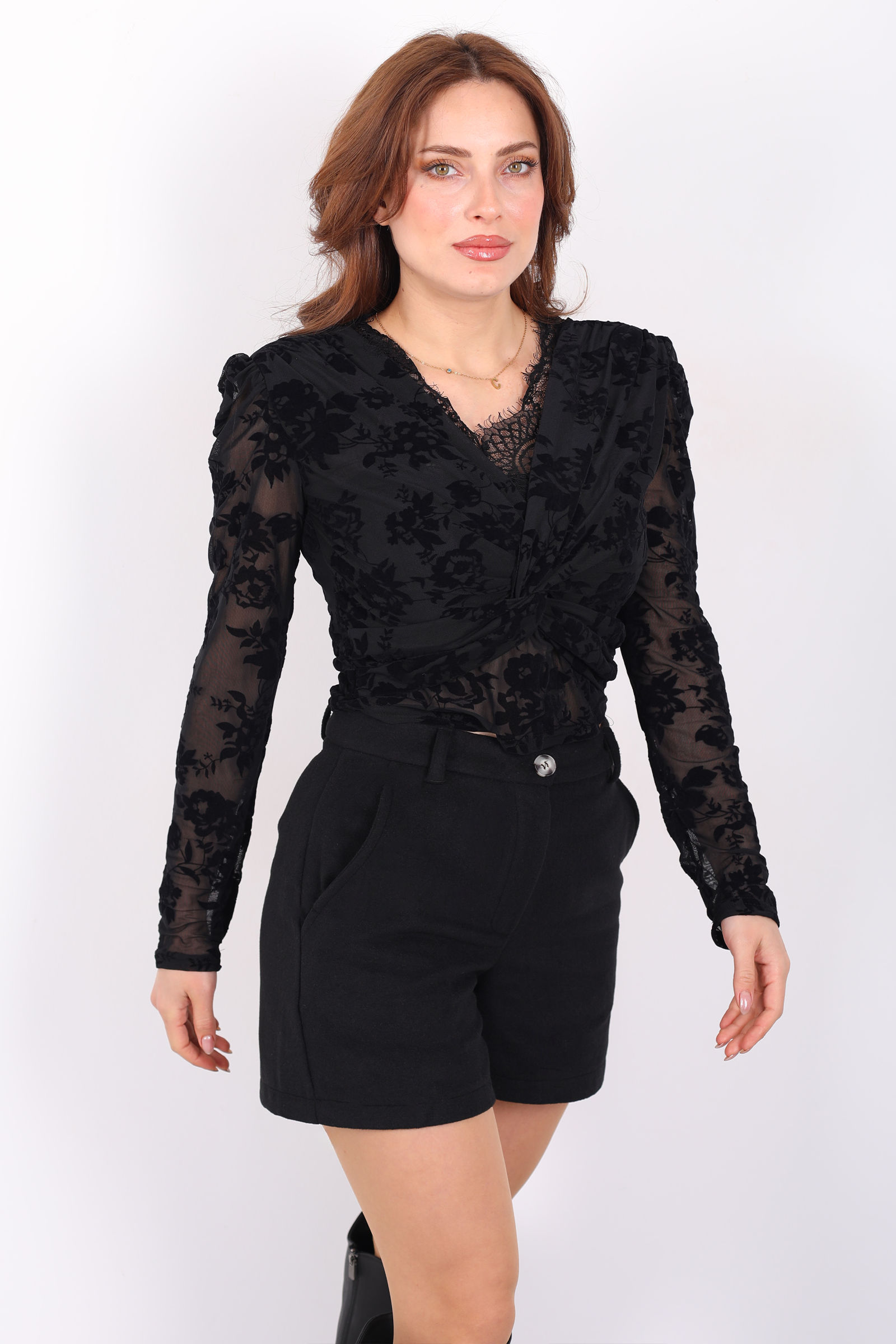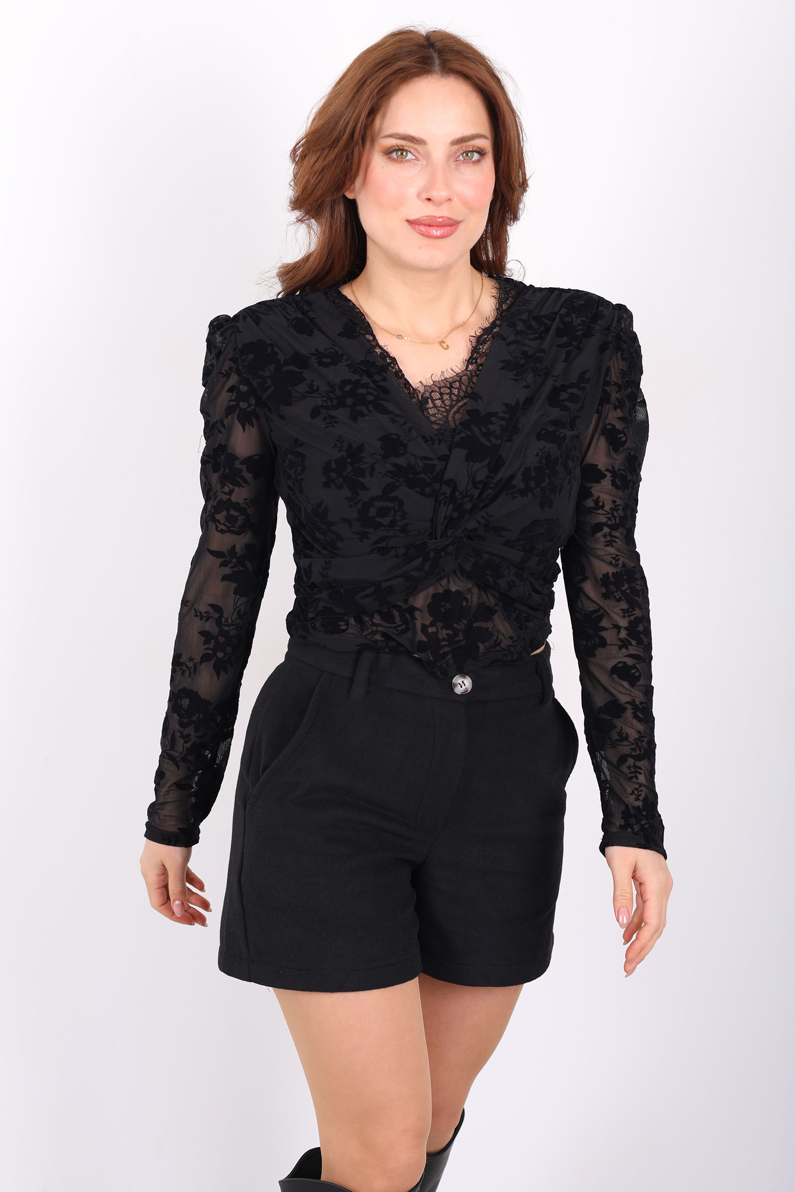 Kadife desenlerin tül kumaşla buluştuğu bu siyah bluz, kruvaze yaka formu ve güpür dokunuşlarıyla güçlü bir şıklık sunar. Hafif yapısı sayesinde gün boyu konfor sağlarken, transparan tül üzerindeki kadife detaylar tasarıma derinlik katar. Kruvaze yaka, üst bedeni zarif gösterirken güpür detaylar feminen bir karakter kazandırır. Siyah rengin zamansız duruşu sayesinde kumaş pantolonlarla klasik, jean ile daha modern ve iddialı kombinler oluşturabilirsiniz. Özel günlerden günlük şıklığa kadar geniş bir kullanım alanı sunan bu bluz, stilinizi öne çıkarır.