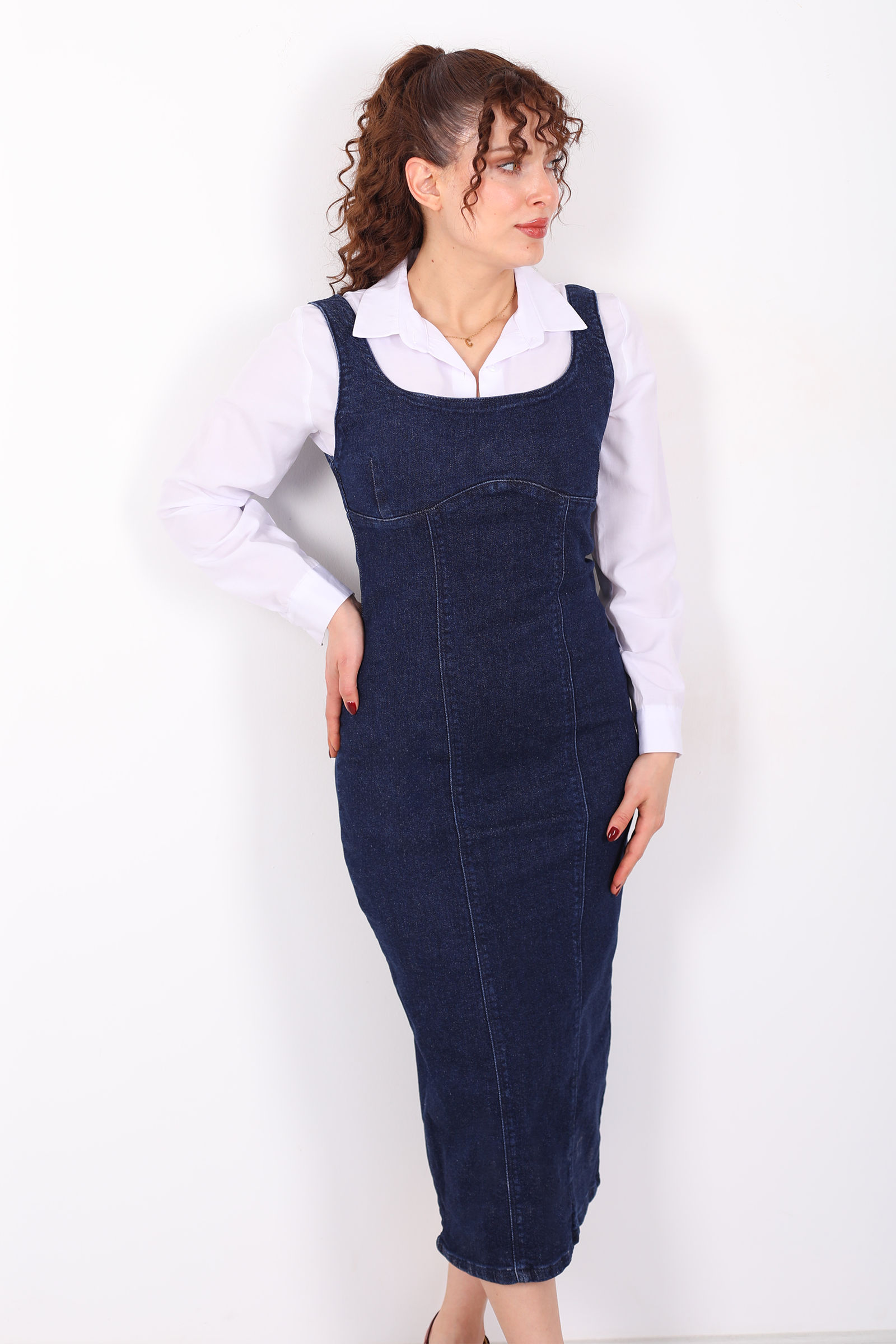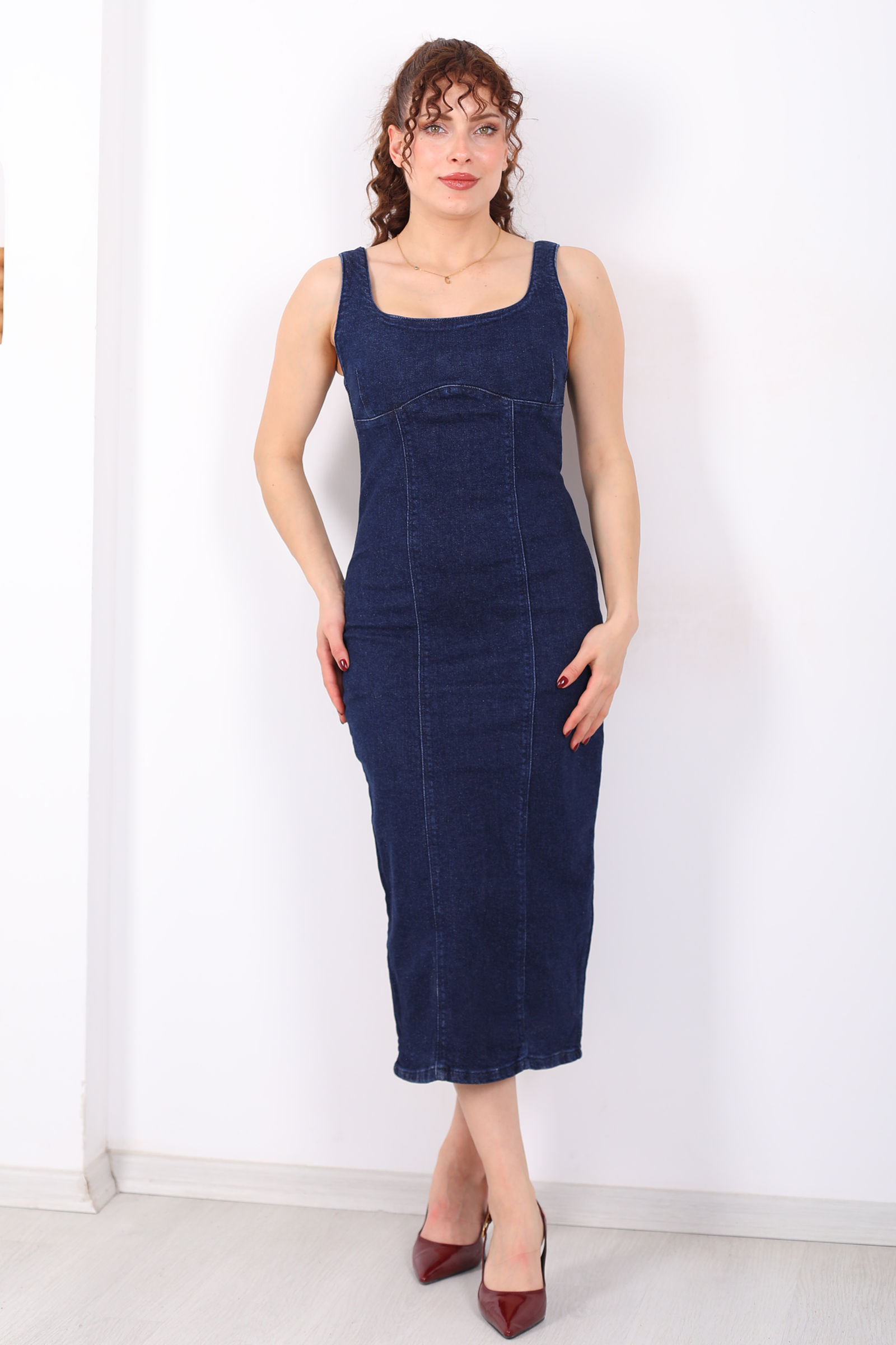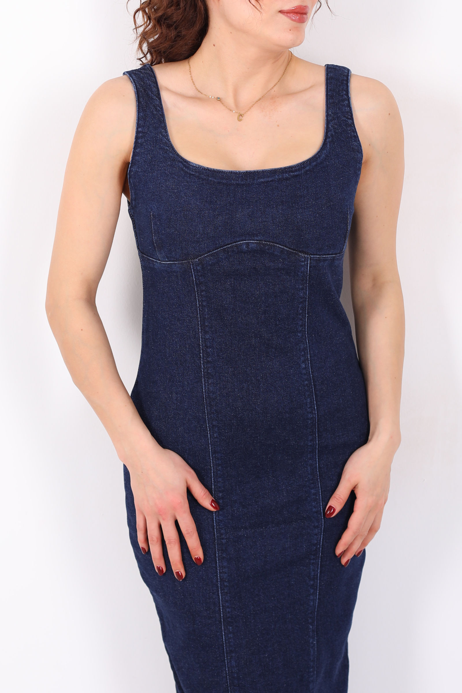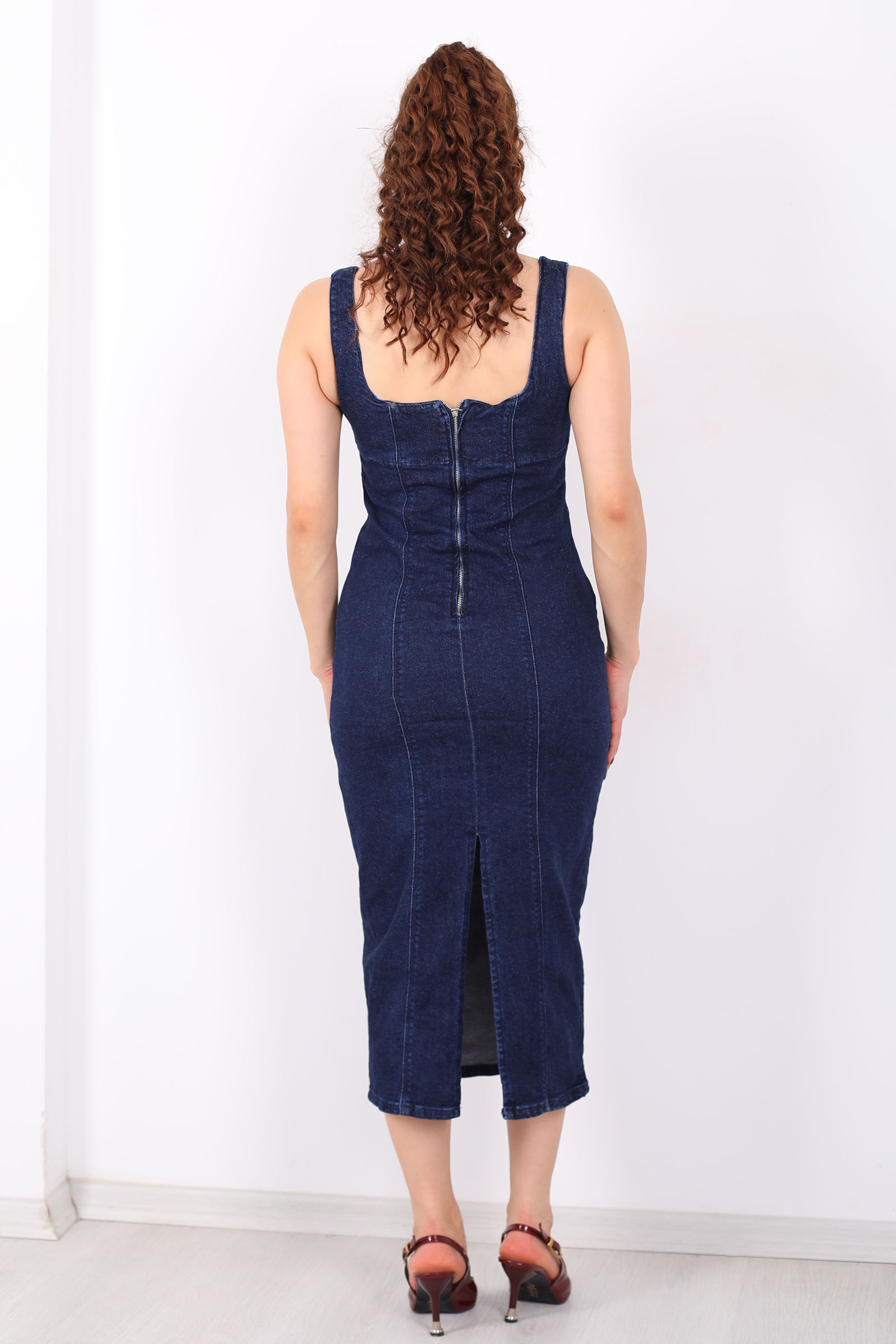 Kalın Askılı Arkası Yırtmaçlı Mavi Kar Yıkama Midi Kadın Kot Elbise