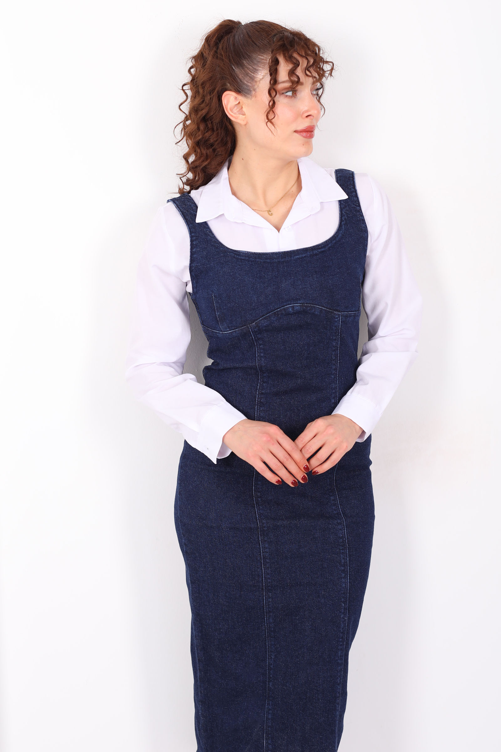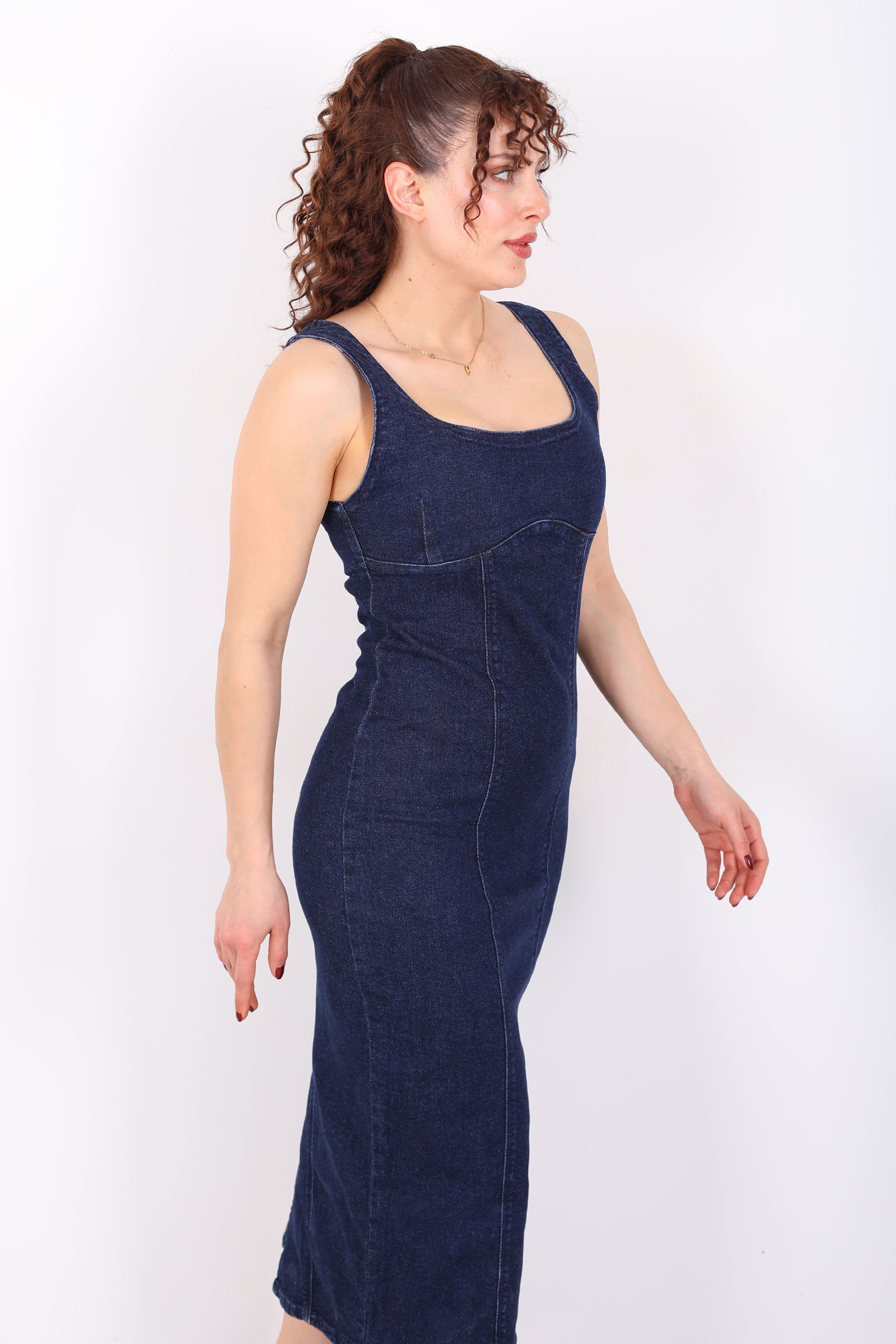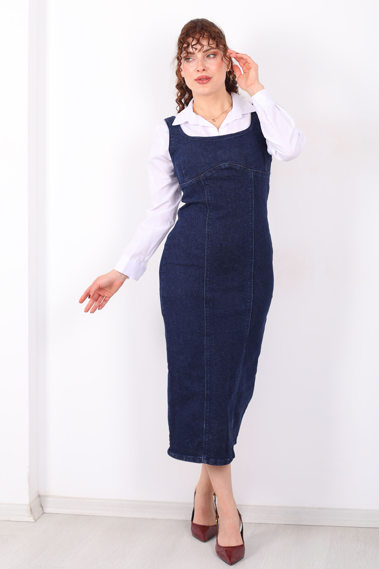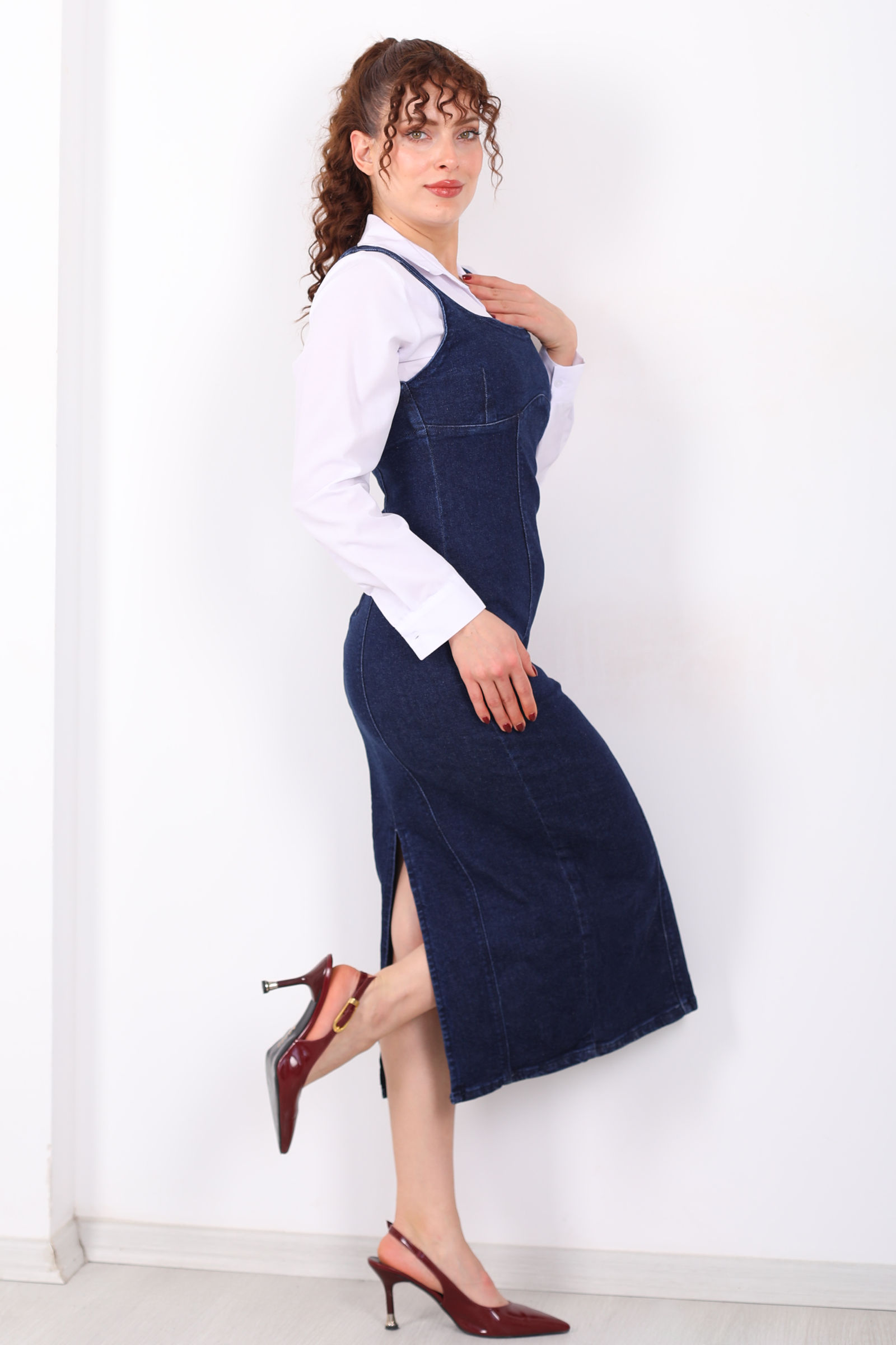 Kalın Askılı Arkası Yırtmaçlı Mavi Kar Yıkama Midi Kadın Kot Elbise