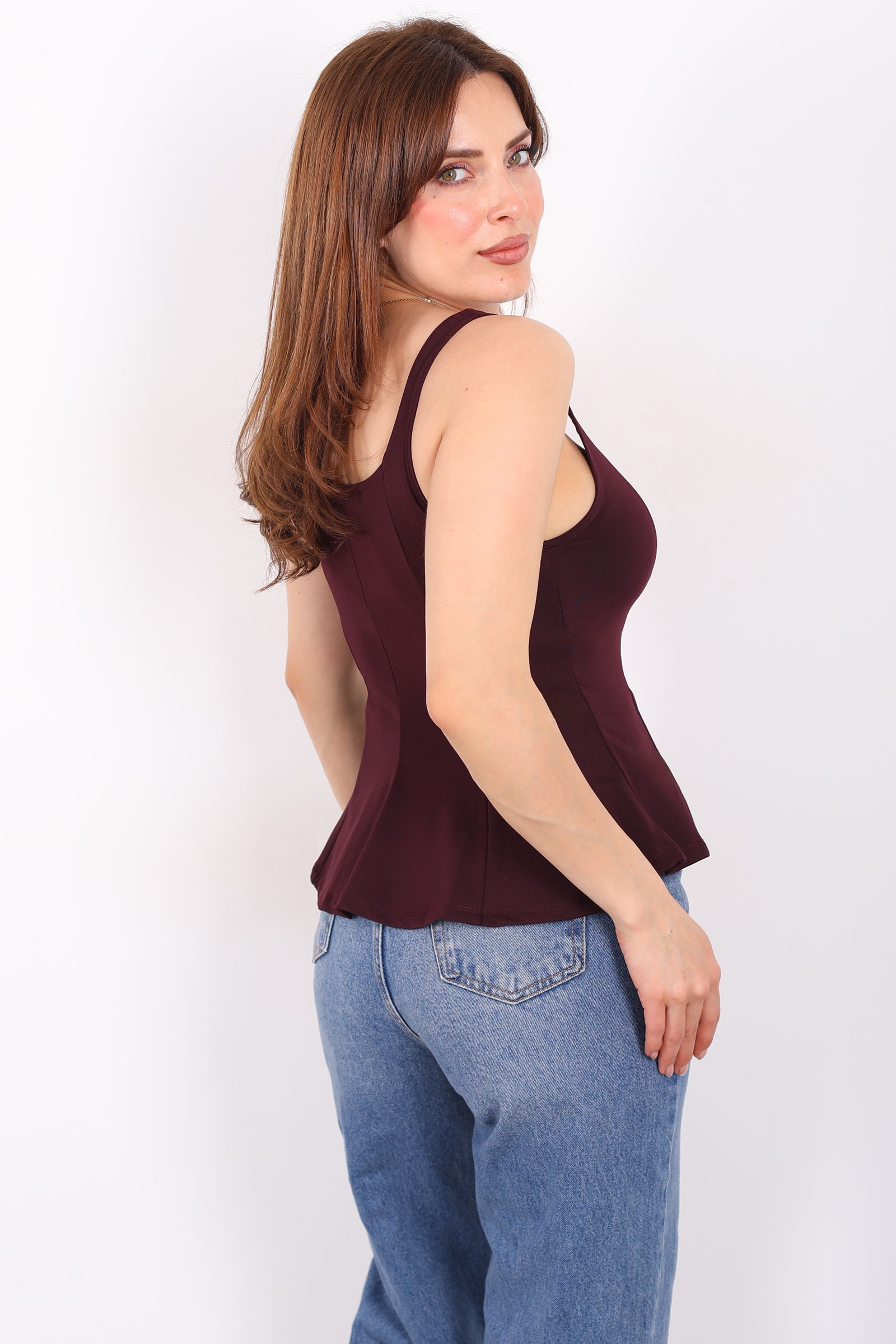 Kalın Askılı U Yaka Kadın Mürdüm Peplum Bluz