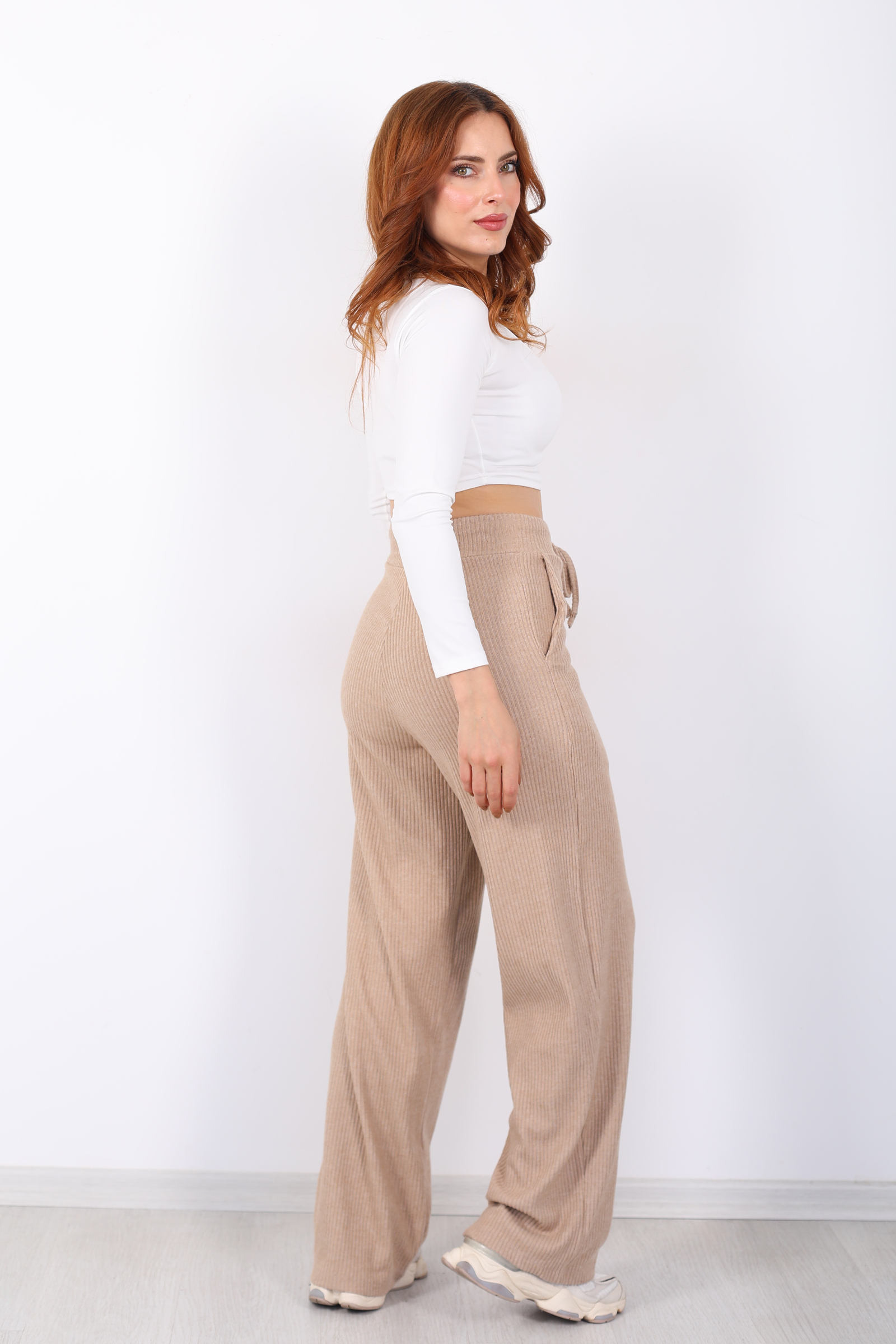 Kalın Fitilli Cepli Bej Kadın Örme Pantolon