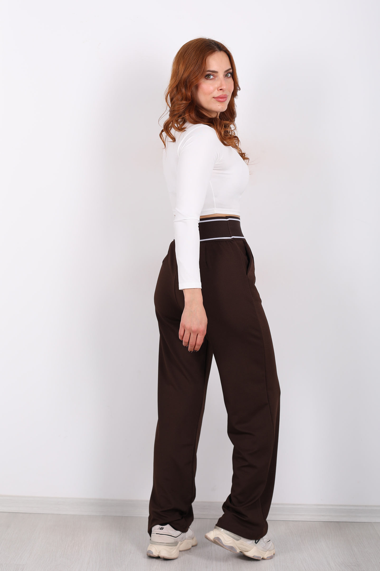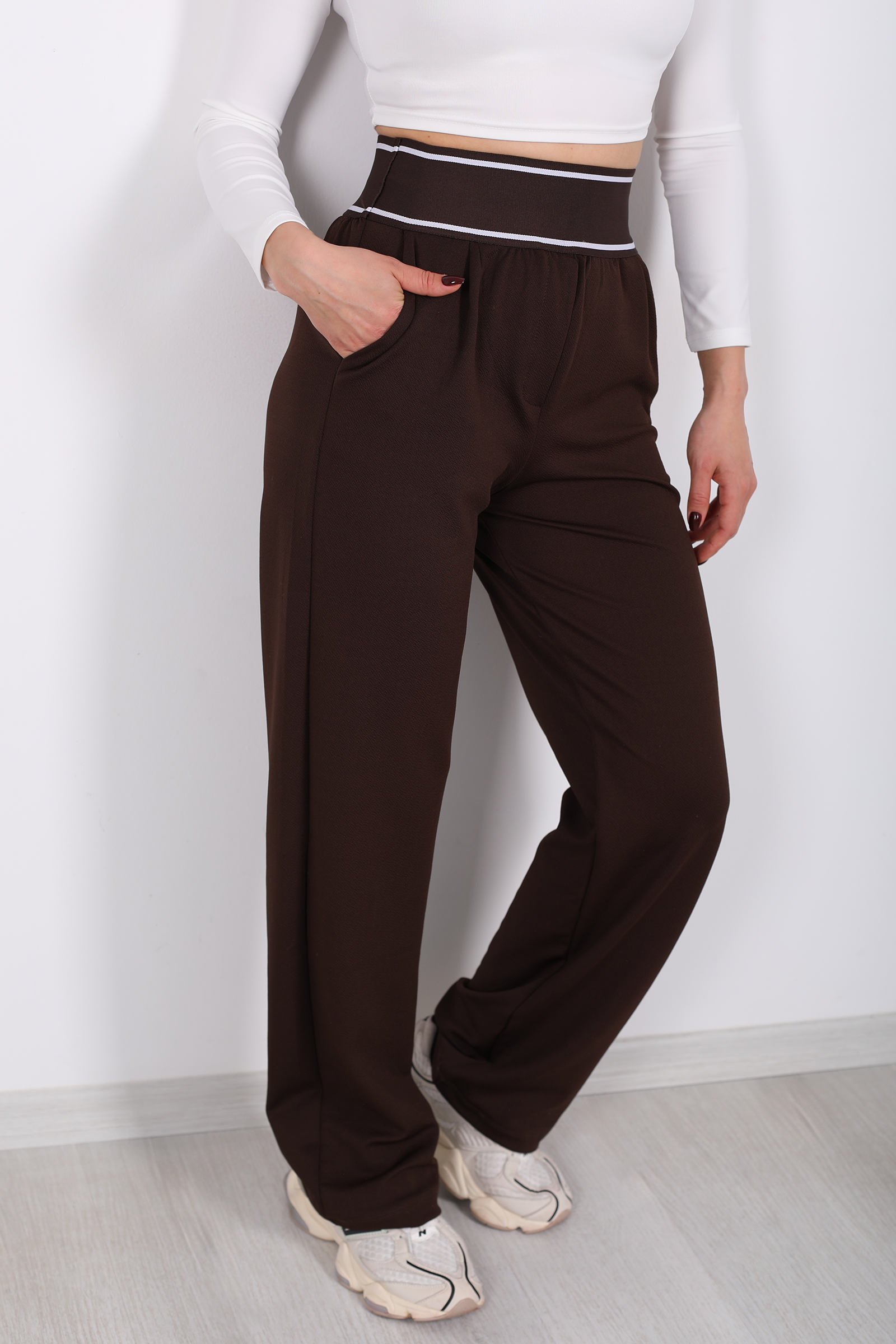 Kalın Lastikli Bol Paça Kadın Kahverengi Venedik Pantolon