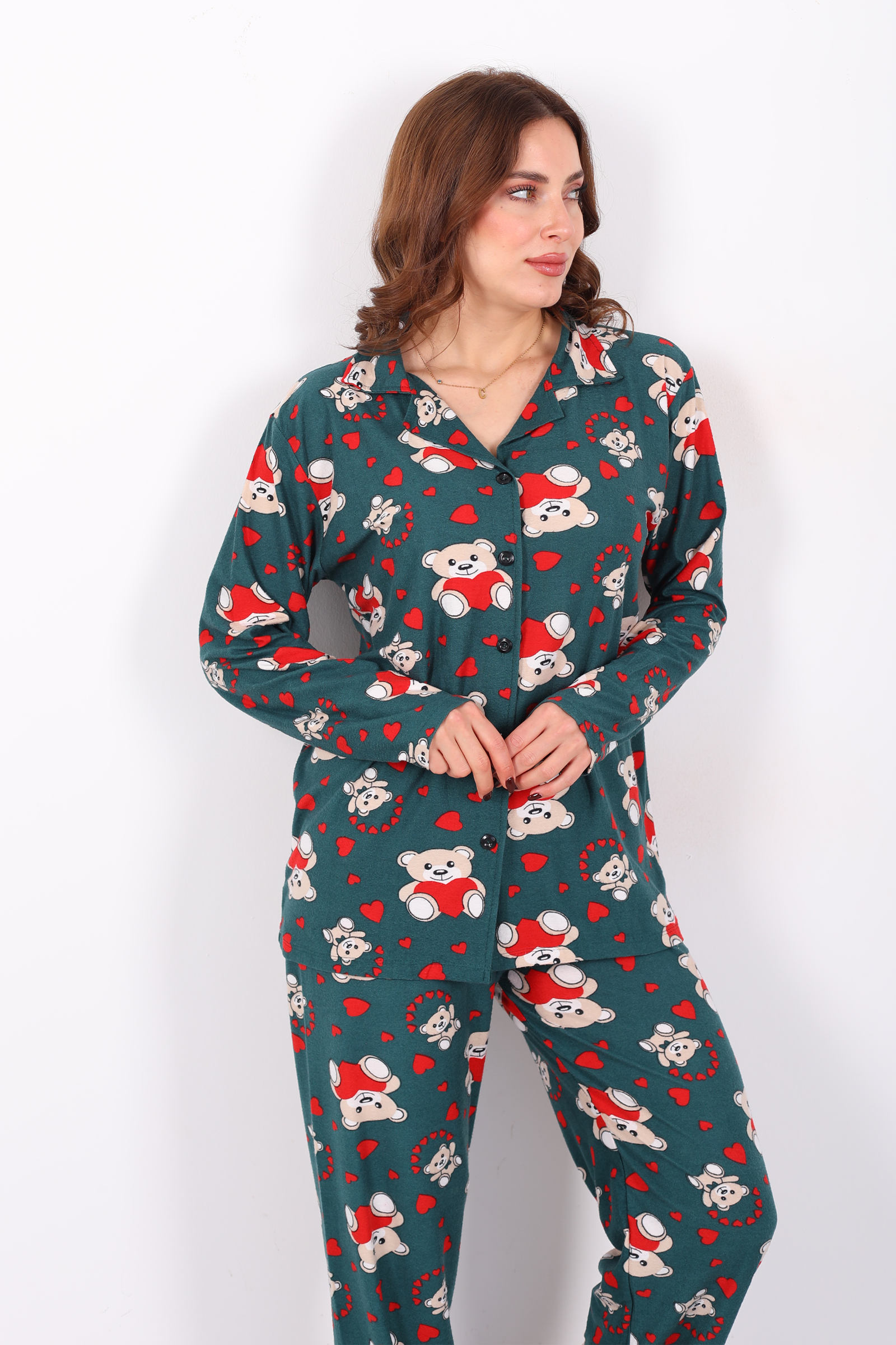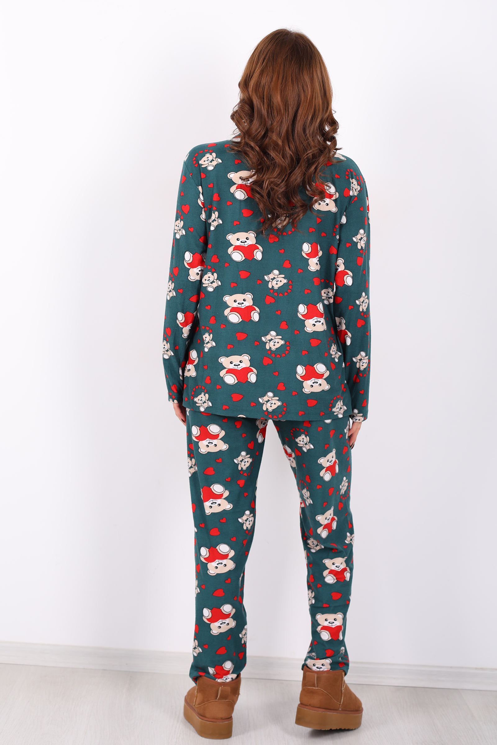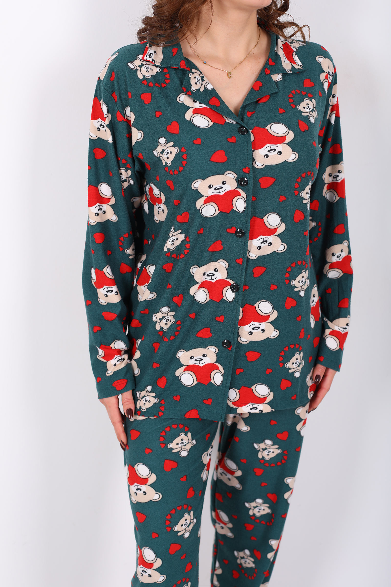 Kalp Ayıcık Desenli Haki Kadın Gömlek Pijama Takım