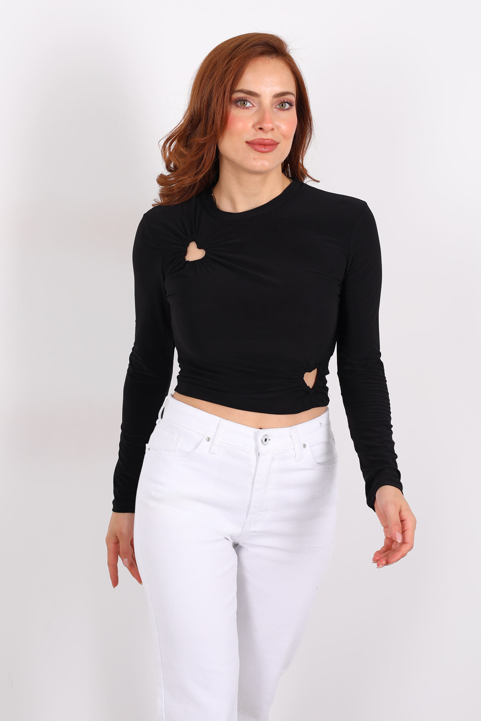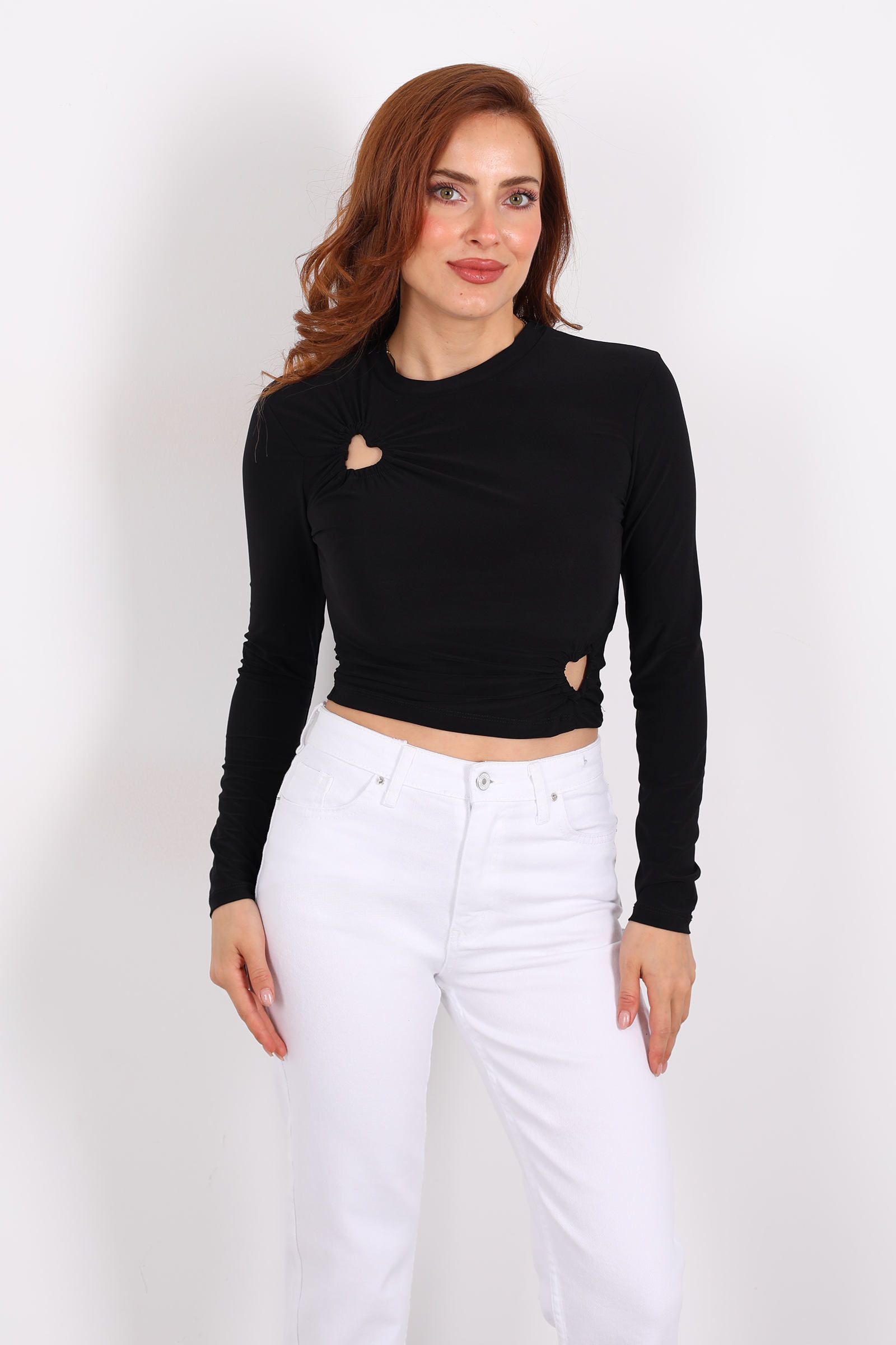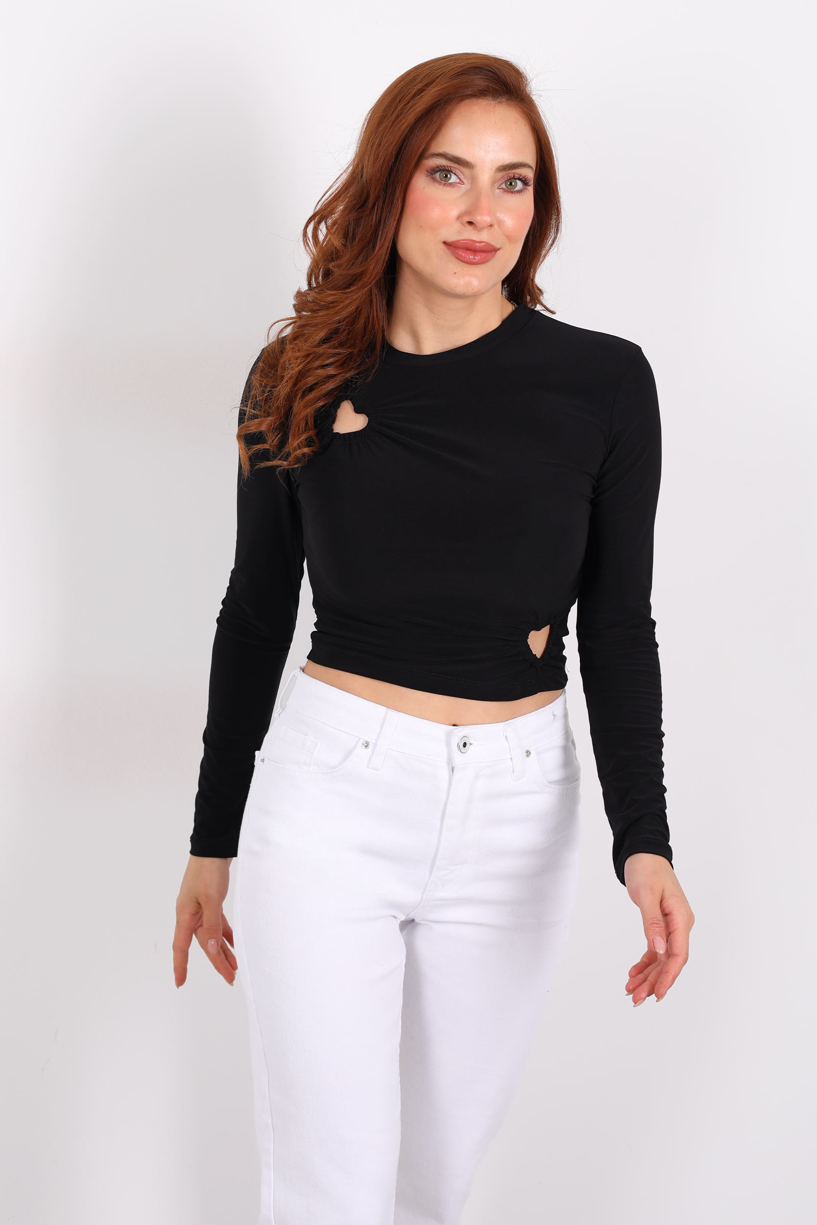 Siyahın zamansız şıklığı ile kalp detayının samimi dokunuşunu bir araya getiren bu bluz, hem romantik hem güçlü bir ifade sunuyor. Gardırobunuzda klasik parçaları duygusal bir enerjiyle yeniden canlandırmak isteyenler için ideal.Yüksek bel jean + sneaker + zarif zincir kolye ile sade ama etkileyici bir kombin.