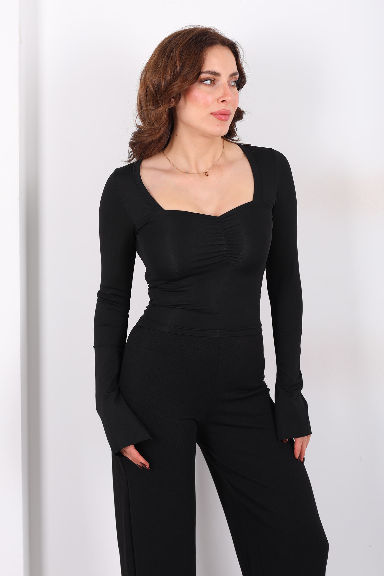 Kalp Yaka İspanyol Kol Kadın Siyah Bluz