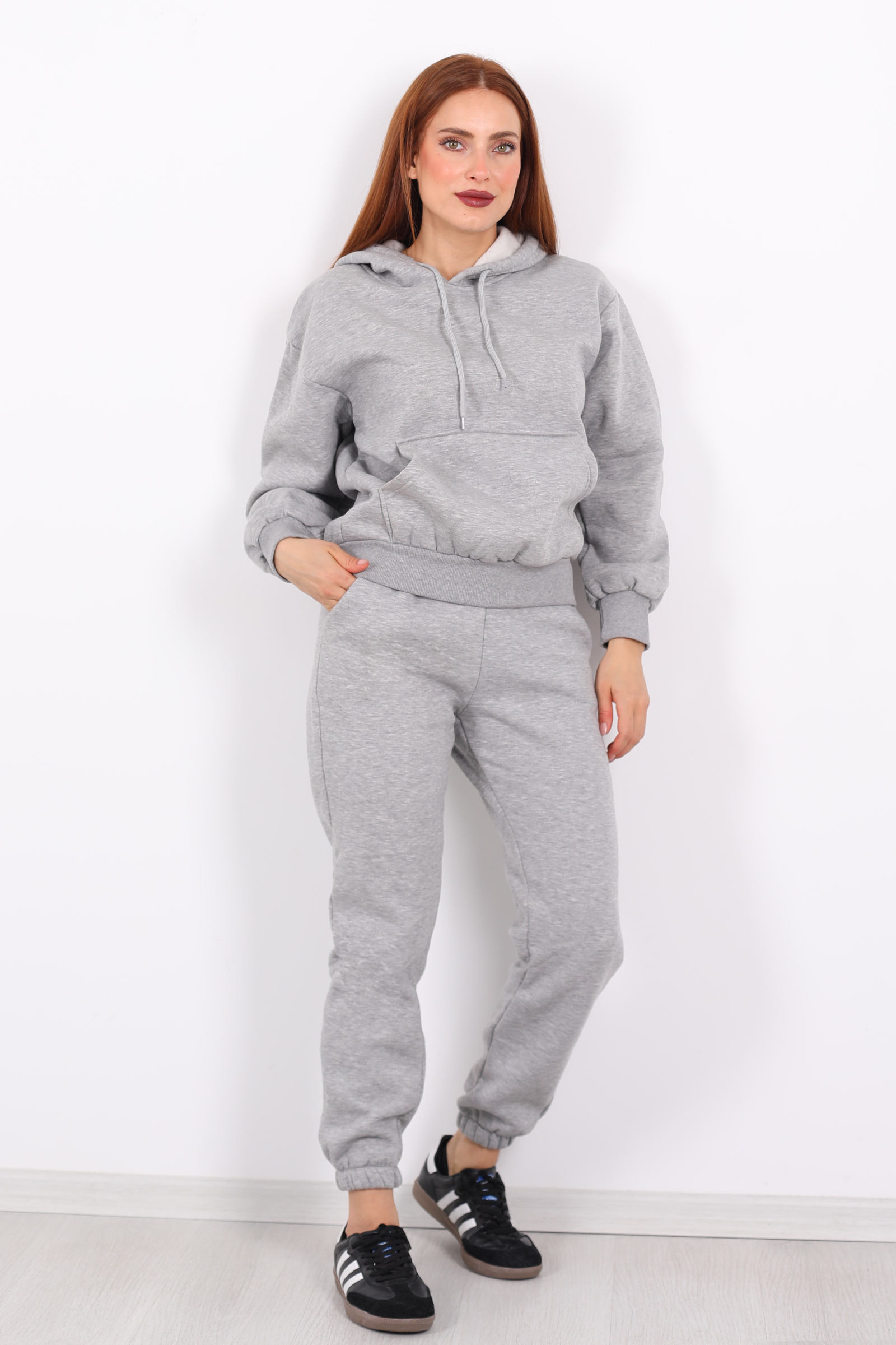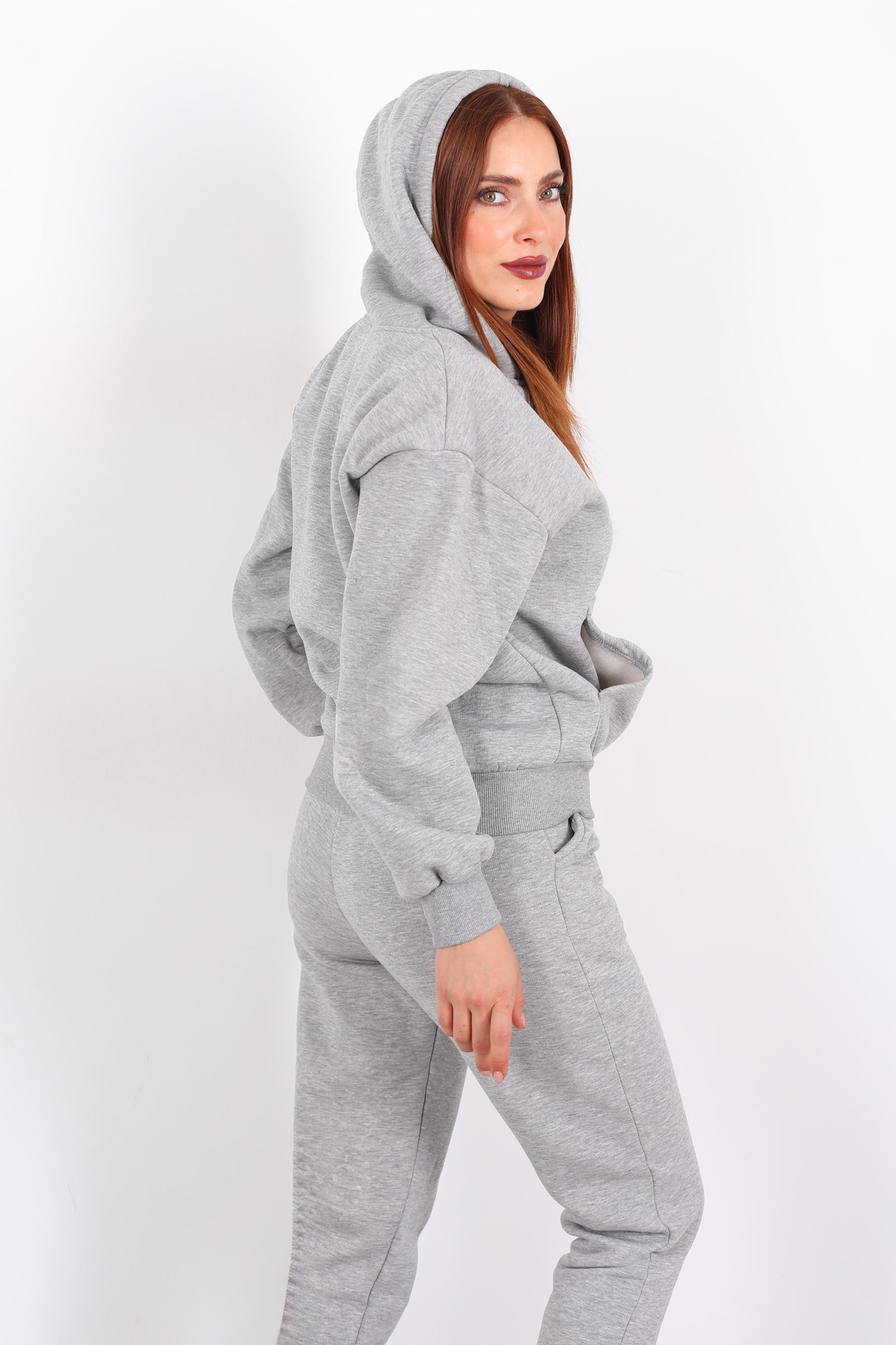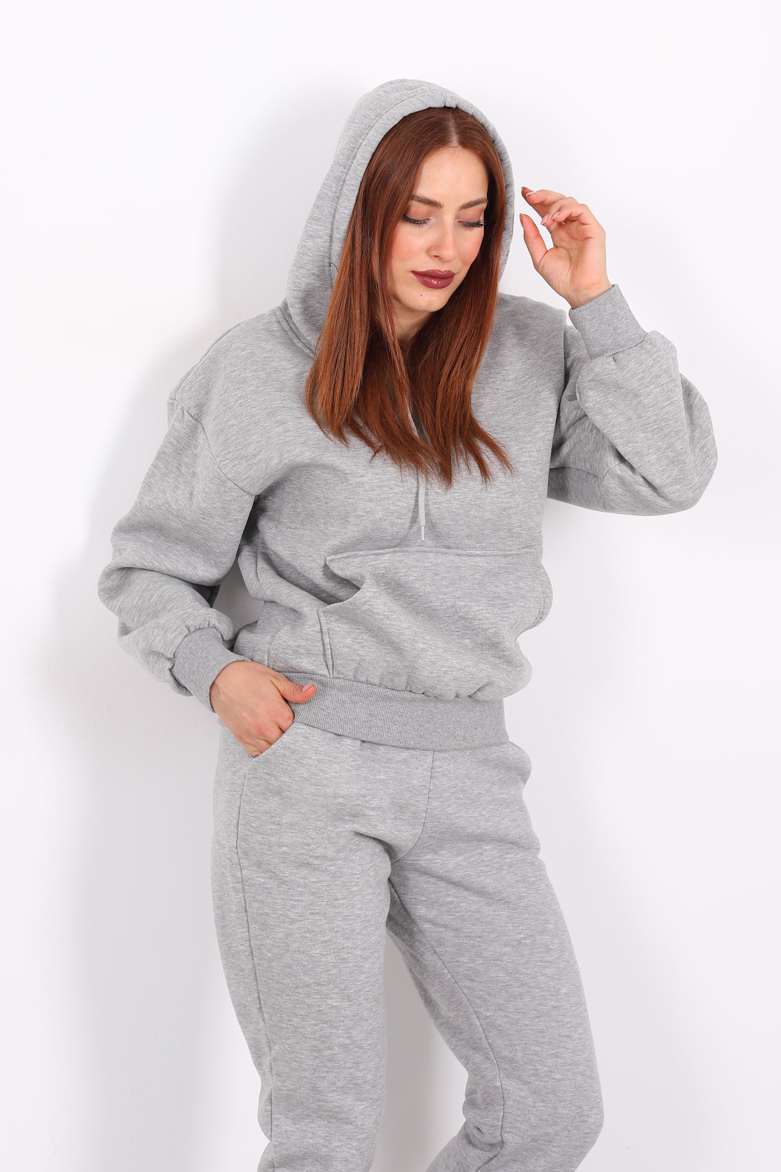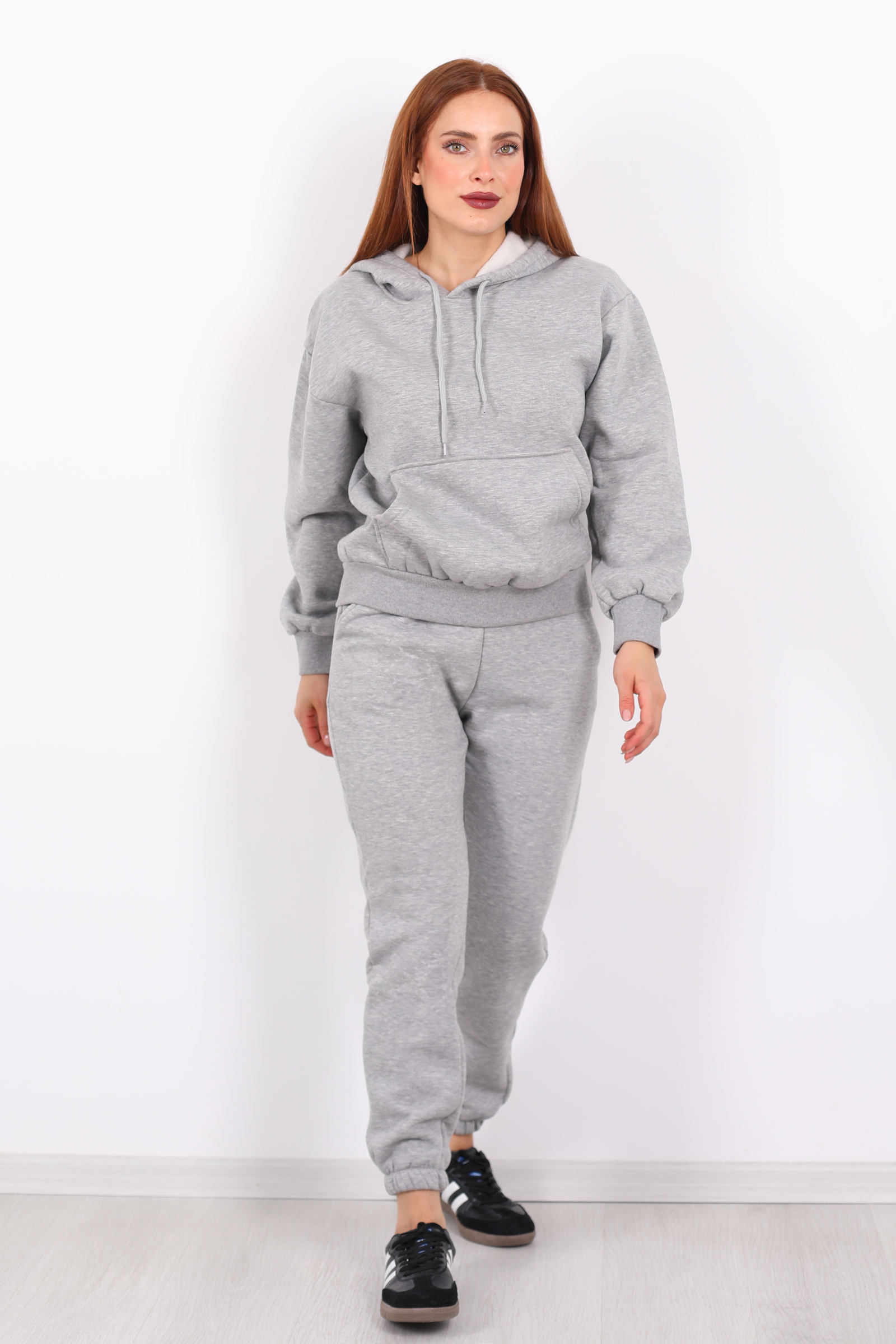 Kanguru Cepli Kapüşonlu Kadın Gri Üç İplik Sweat Takım