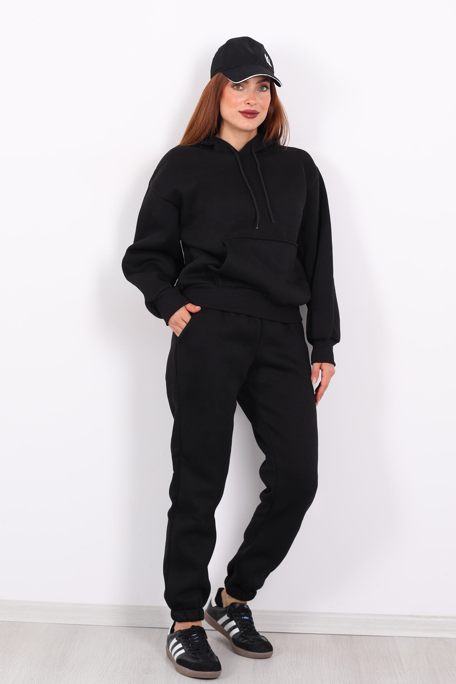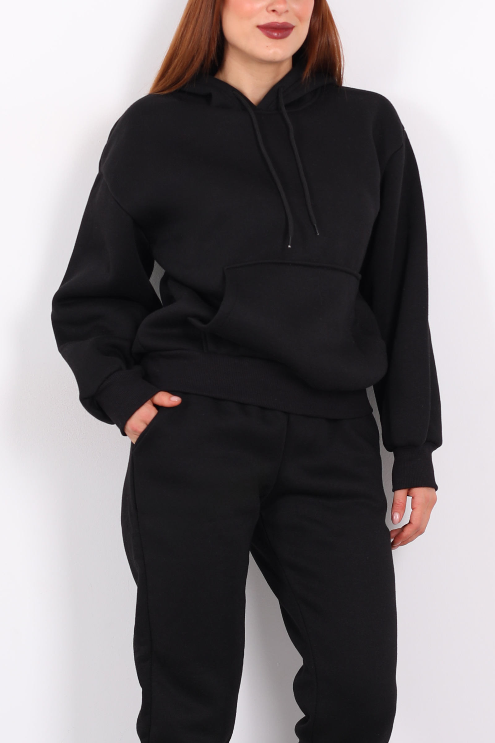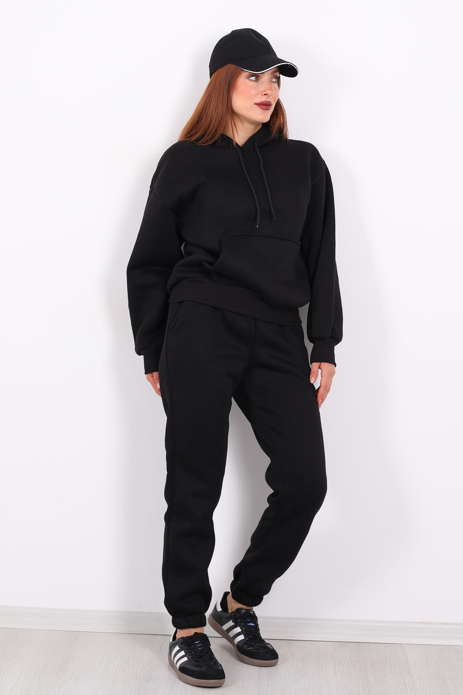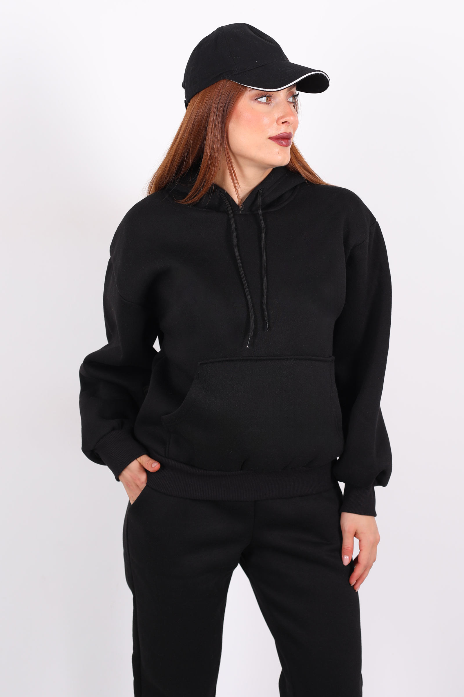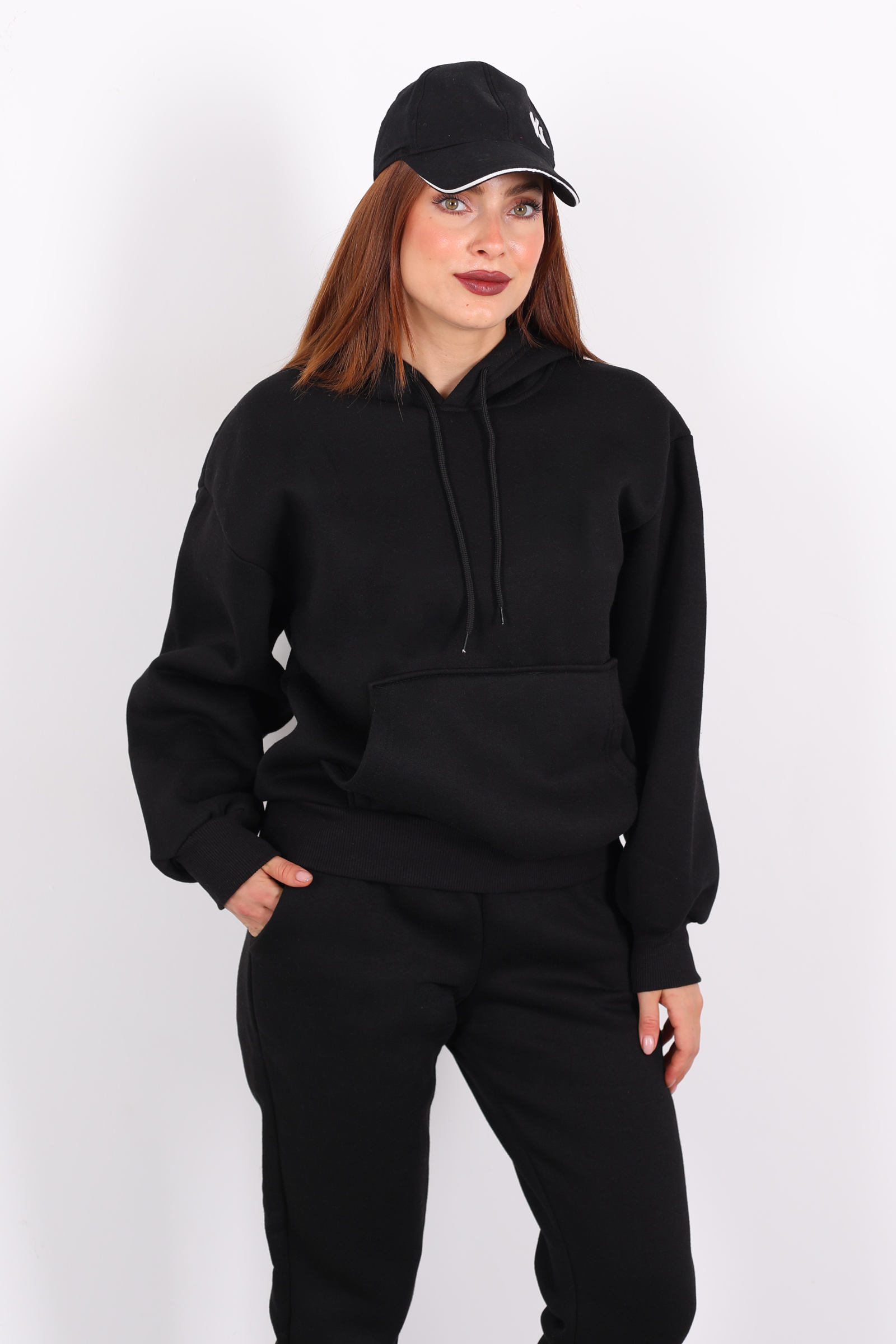 Kanguru Cepli Kapüşonlu Kadın Siyah Üç İplik Sweat Takım