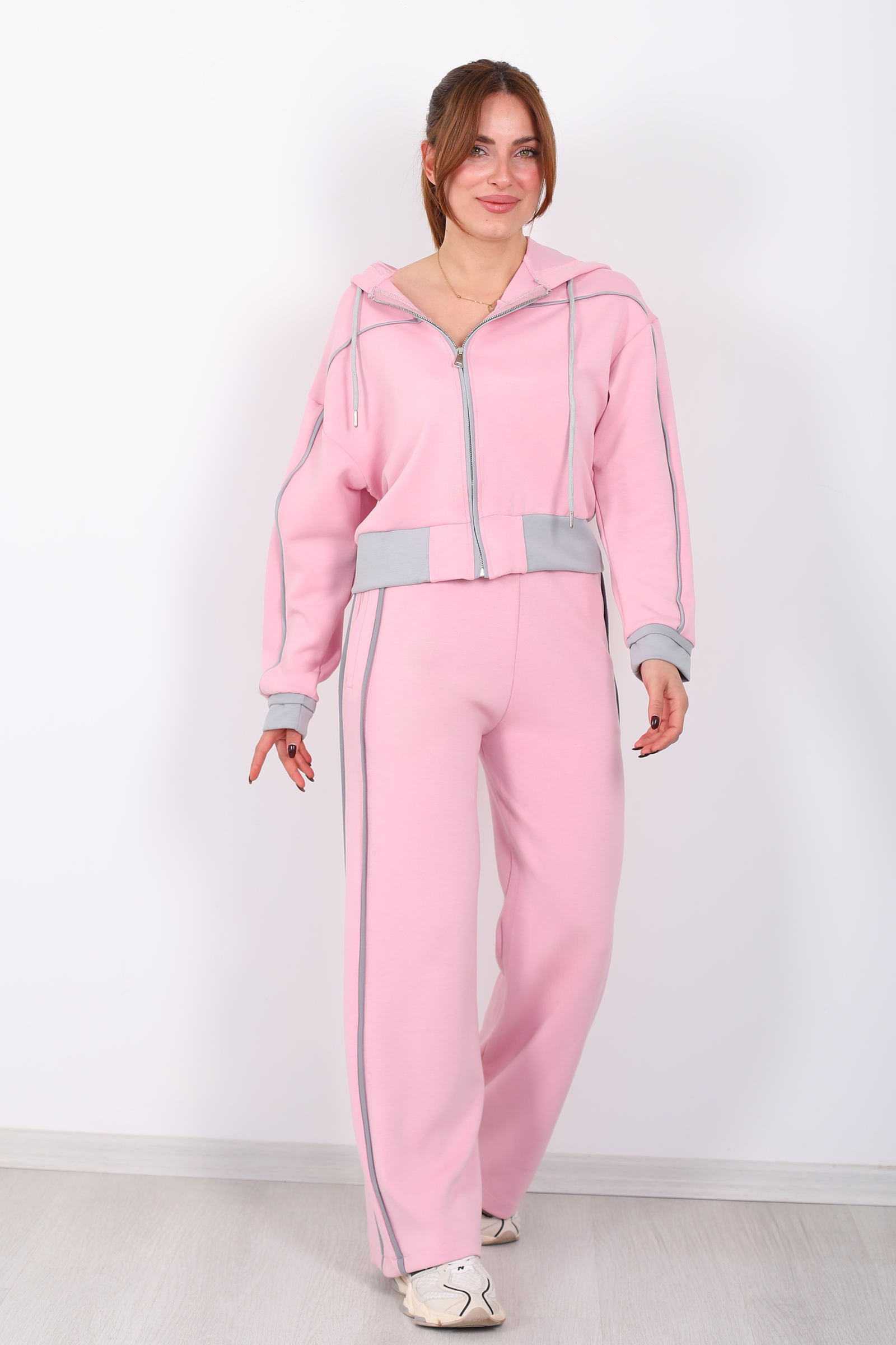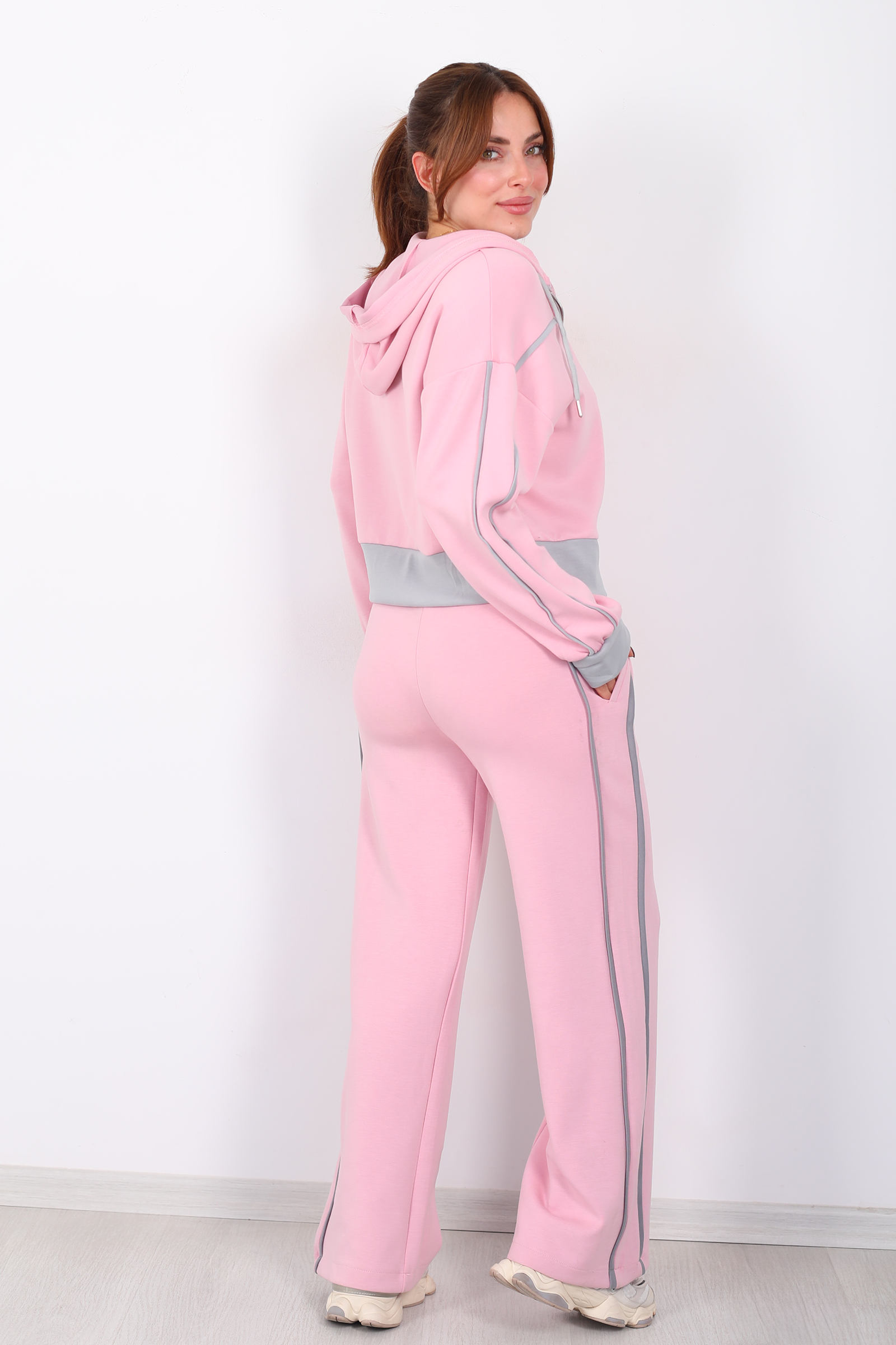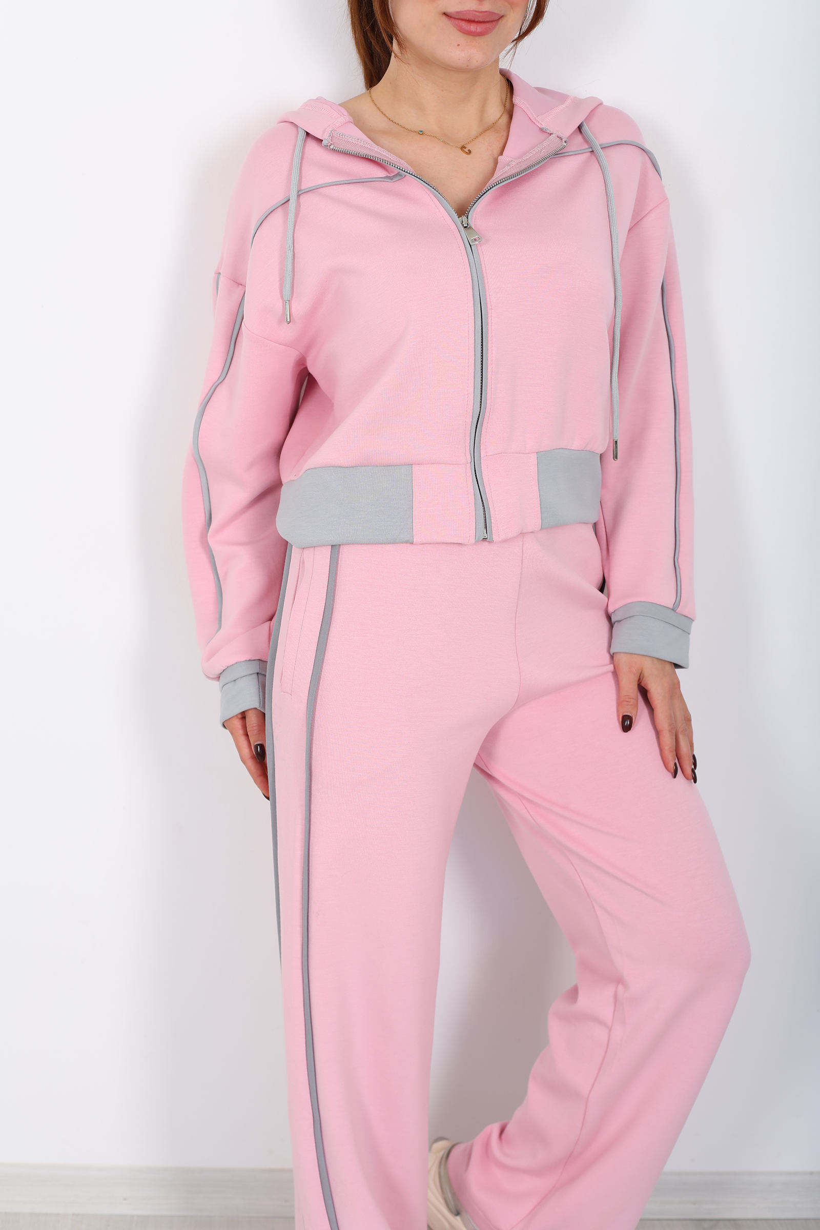 Pembe kadın modal takımı, kapüşonlu üst ve zarif ara biyeli tasarımıyla stilinize şehirli ve modern bir dokunuş katmak için tasarlandı. Modal kumaşın yumuşak ve nefes alan yapısı, tüm gün rahatlık sağlar; günlük kombinlerde hem spor bir hava hem de feminen bir duruş sunar.Pantolon ve üstün ahenkli uyumu, pembe tonunun enerjisiyle birleşerek gardırobunuzda fark edilir bir parça haline gelir. İster cool sneaker’larla gündelik bir stil yaratın, ister minimal aksesuarlarla zarif bir görünüm seçin