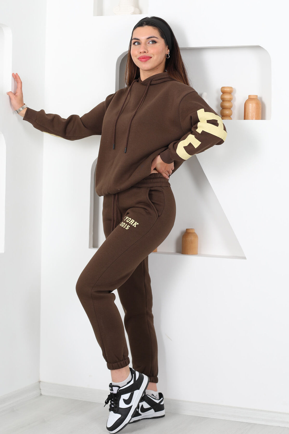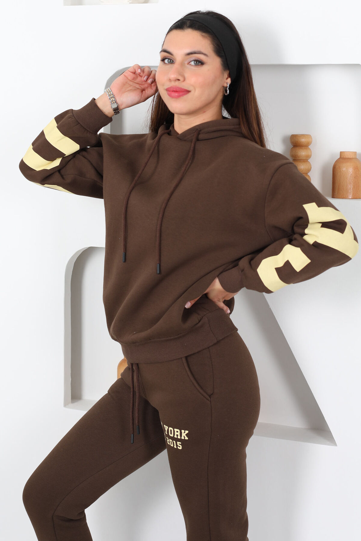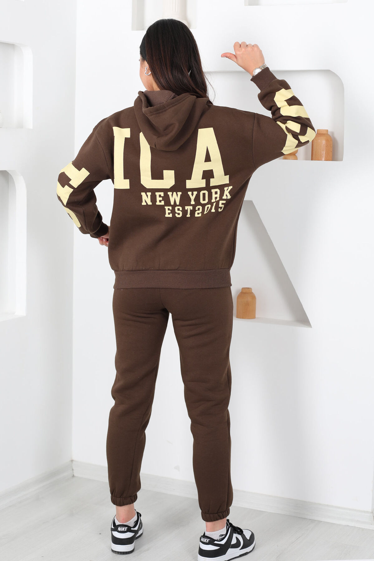 Toprak tonlarının sıcaklığı tam da gardırobunuzu saracak; bu kahverengi kapüşonlu baskılı üç ip takım, hem konforu hem karakteri yüksek düzeyde sunuyor. Takımın üst parçasındaki kapüşon birleşimi ve baskılı detaylar, görünüşe sportif bir hava katarken altındaki paça dar kalse bile hareket özgürlüğü sunar; bel kısmındaki lastik konforu artırır.Kahverenginin kendine has derin tonu sayesinde krem, bej ya da siyah aksesuarlarla kombinlendiğinde hem sofistike hem dengeli bir görünüm elde edilir.