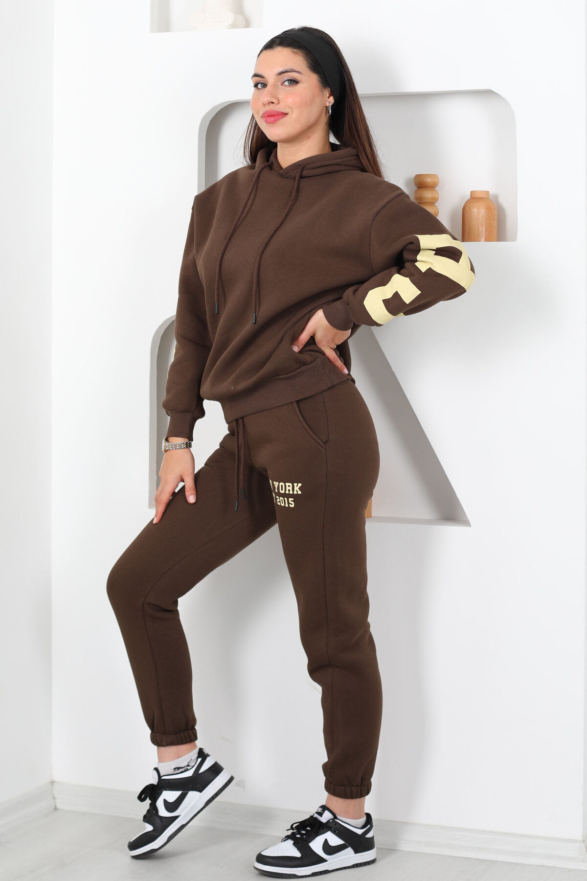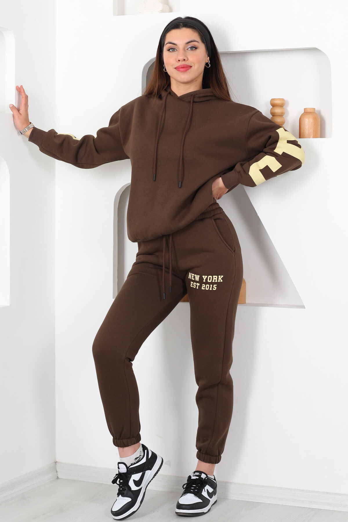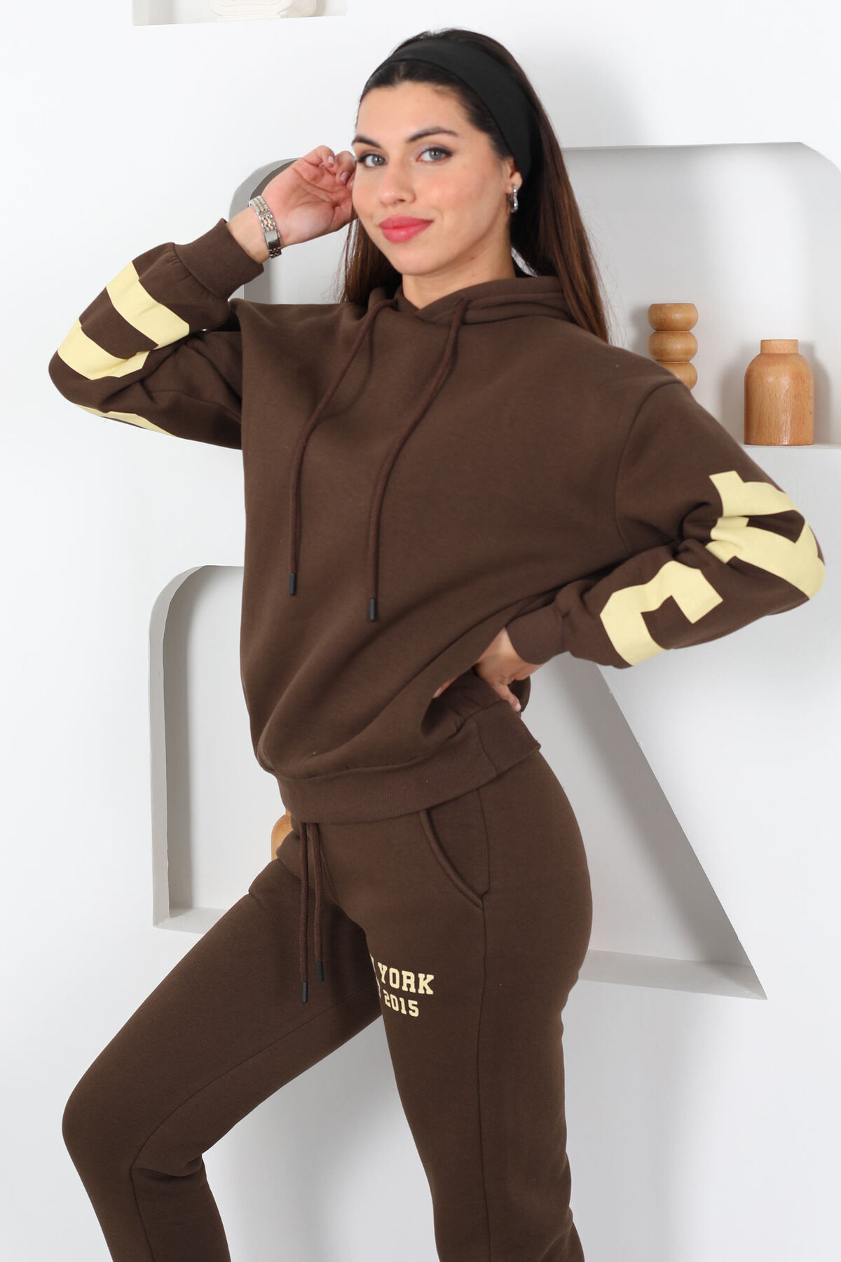 Toprak tonlarının sıcaklığı tam da gardırobunuzu saracak; bu kahverengi kapüşonlu baskılı üç ip takım, hem konforu hem karakteri yüksek düzeyde sunuyor. Takımın üst parçasındaki kapüşon birleşimi ve baskılı detaylar, görünüşe sportif bir hava katarken altındaki paça dar kalse bile hareket özgürlüğü sunar; bel kısmındaki lastik konforu artırır.Kahverenginin kendine has derin tonu sayesinde krem, bej ya da siyah aksesuarlarla kombinlendiğinde hem sofistike hem dengeli bir görünüm elde edilir.