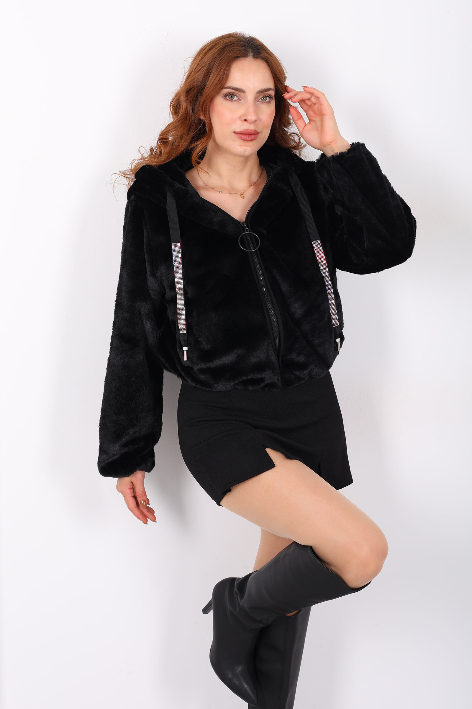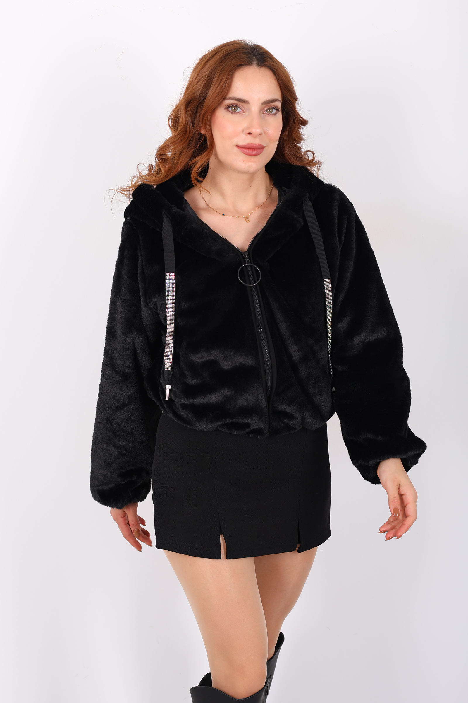 Kapüşonlu Beli Lastikli Siyah Kadın Peluş Mont