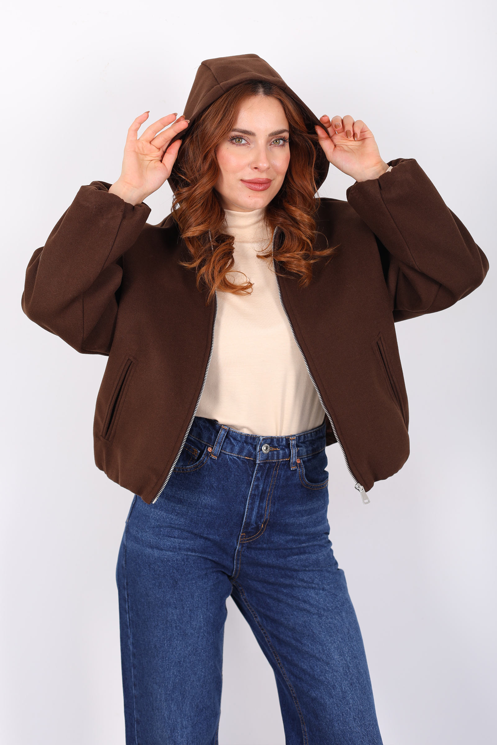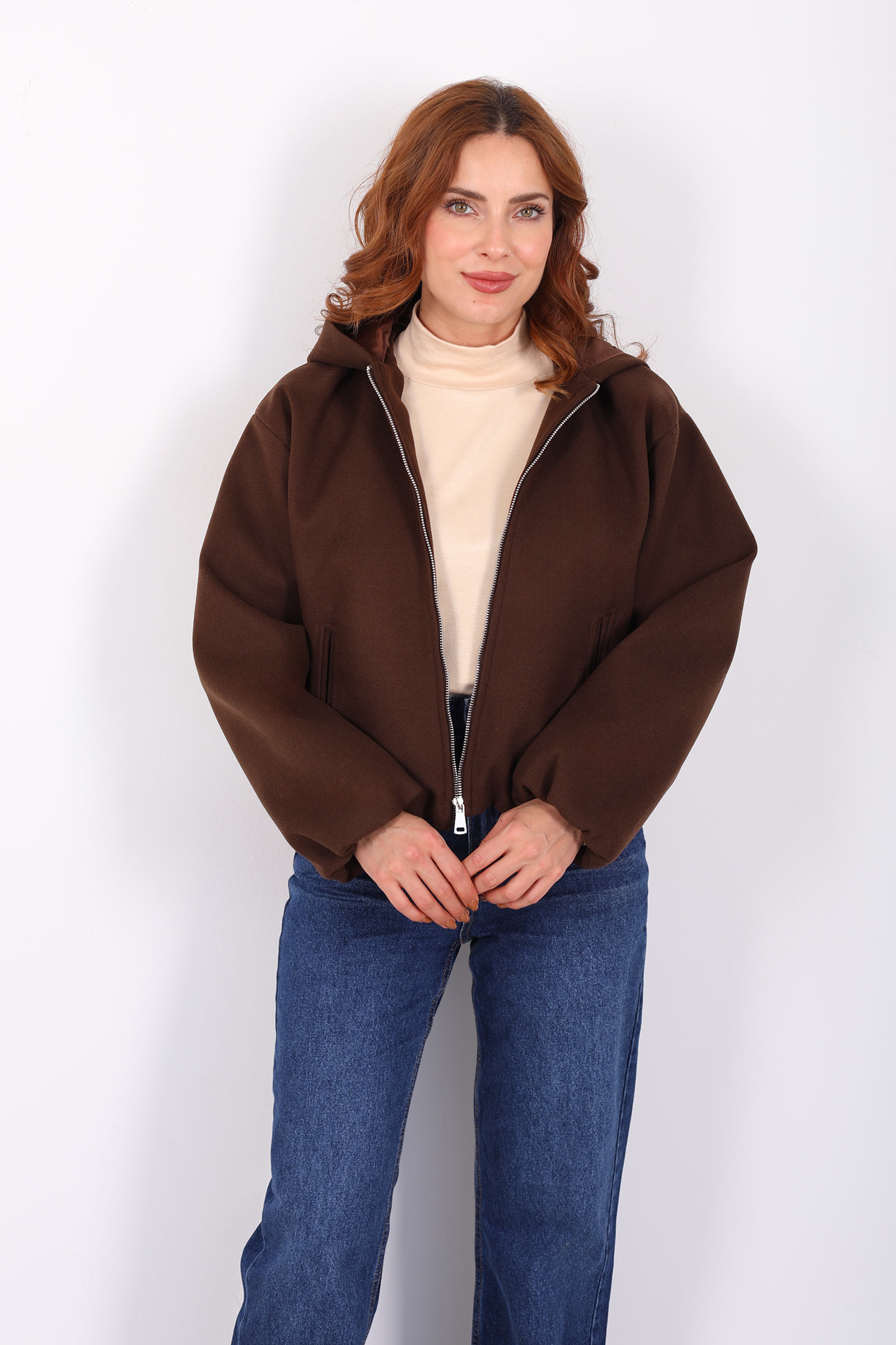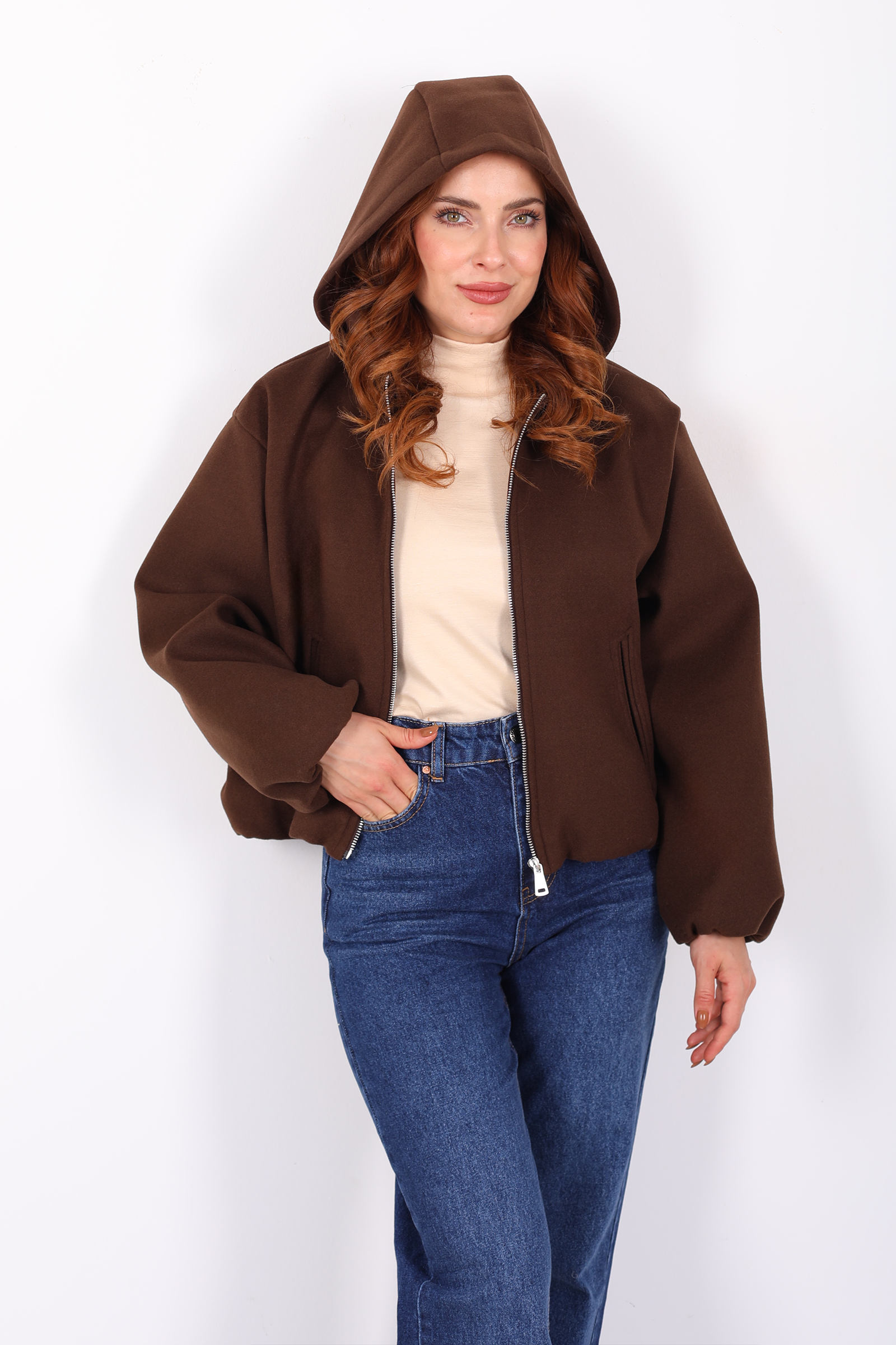 Kapüşonlu Çift Cepli Acı Kahve Kadın Kaşe Kaban