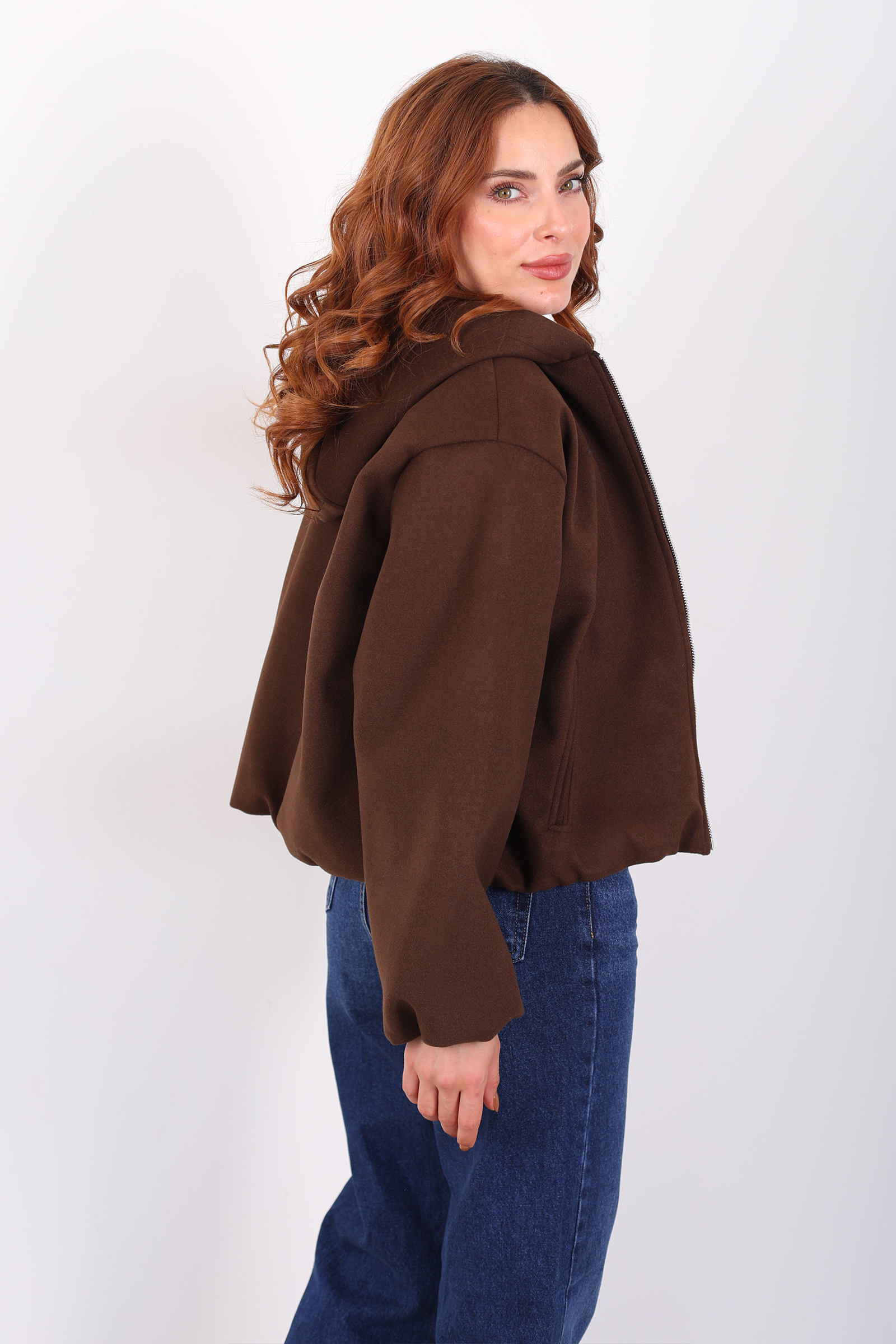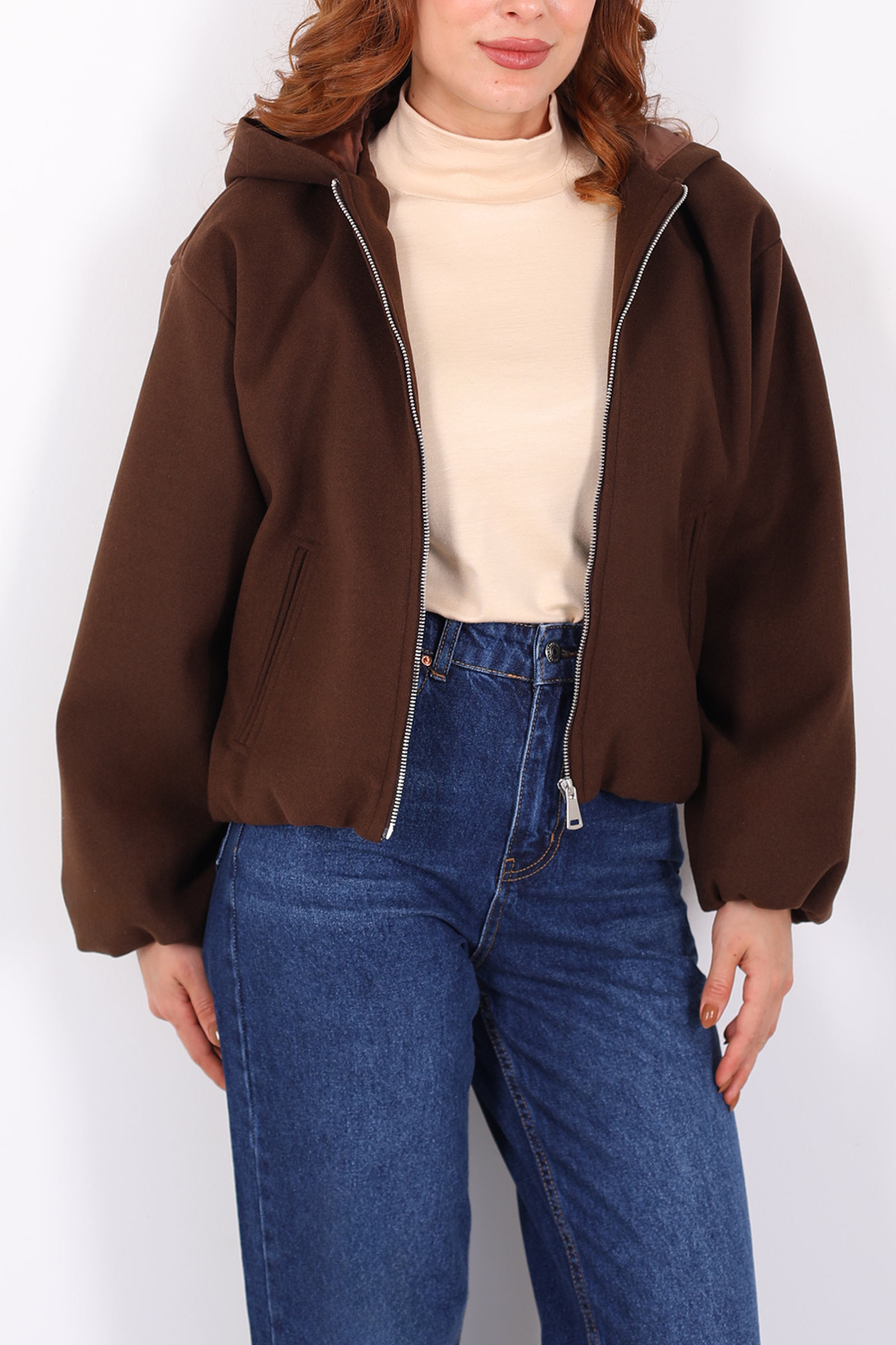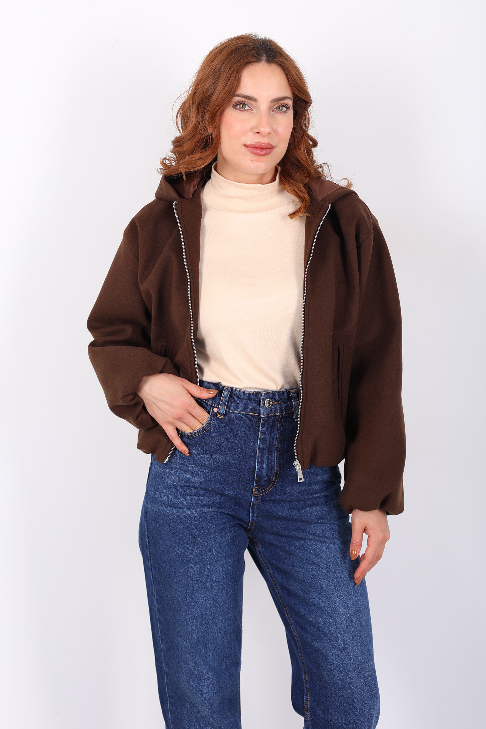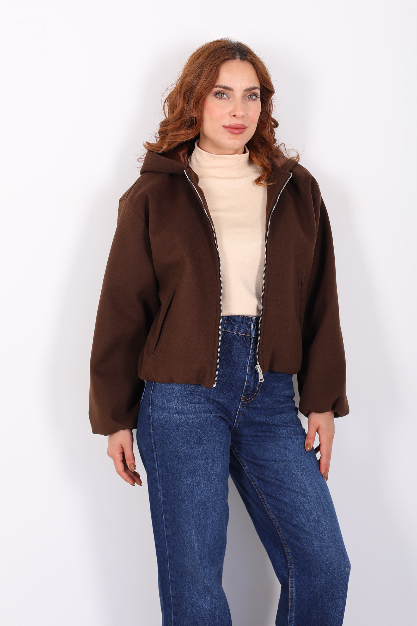 Kapüşonlu Çift Cepli Acı Kahve Kadın Kaşe Kaban