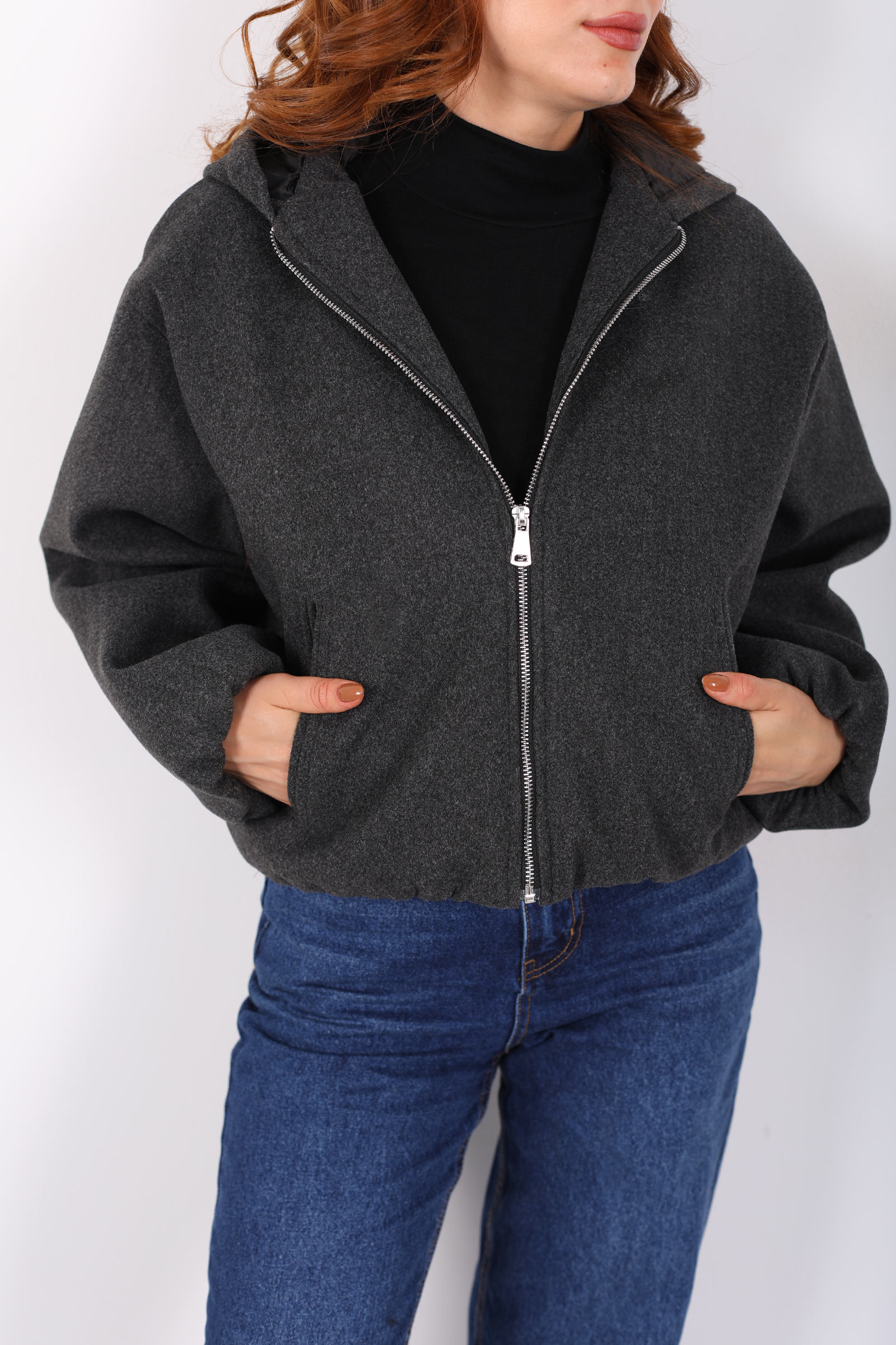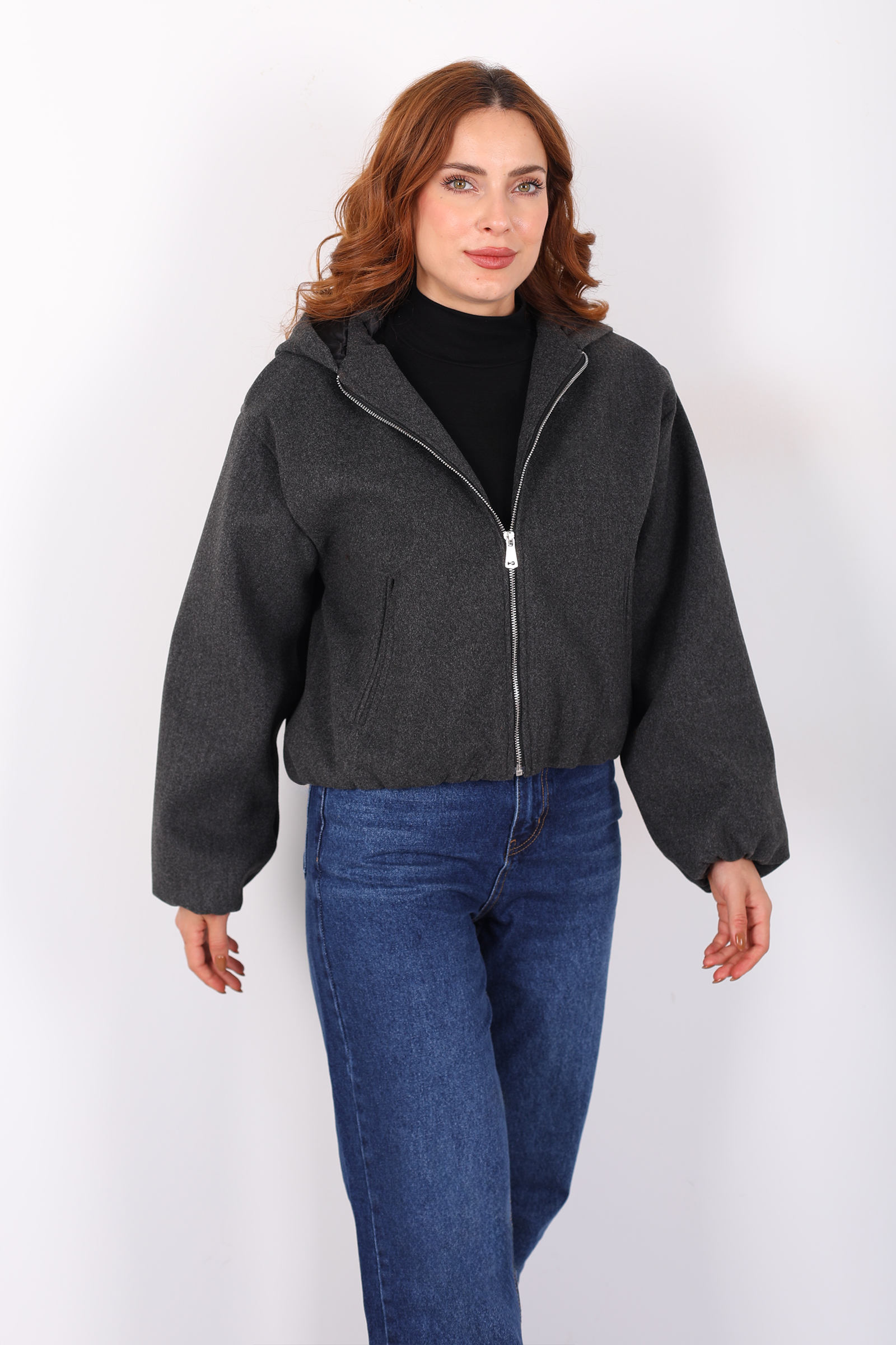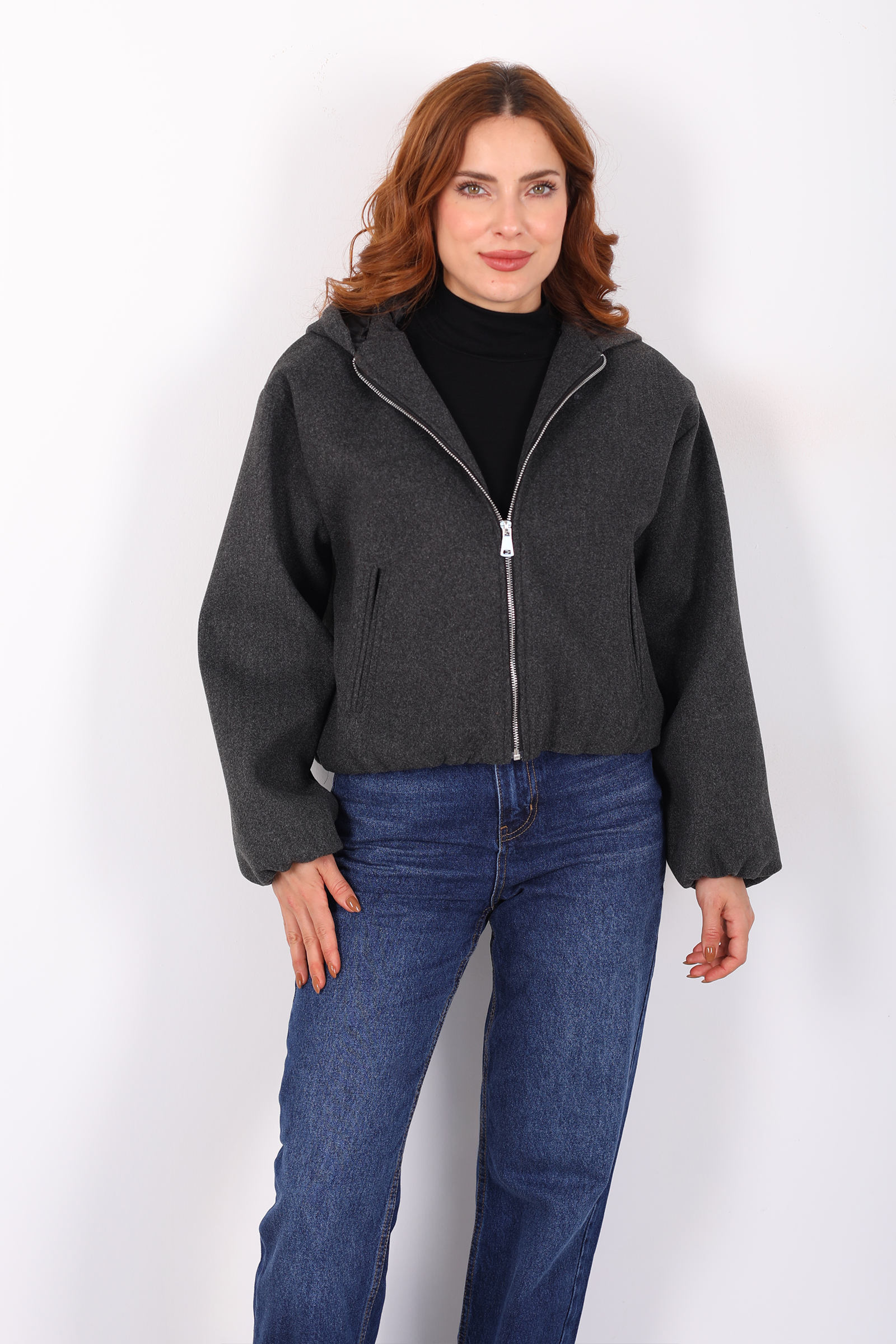 Kapüşonlu Çift Cepli Füme Kadın Kaşe Kaban