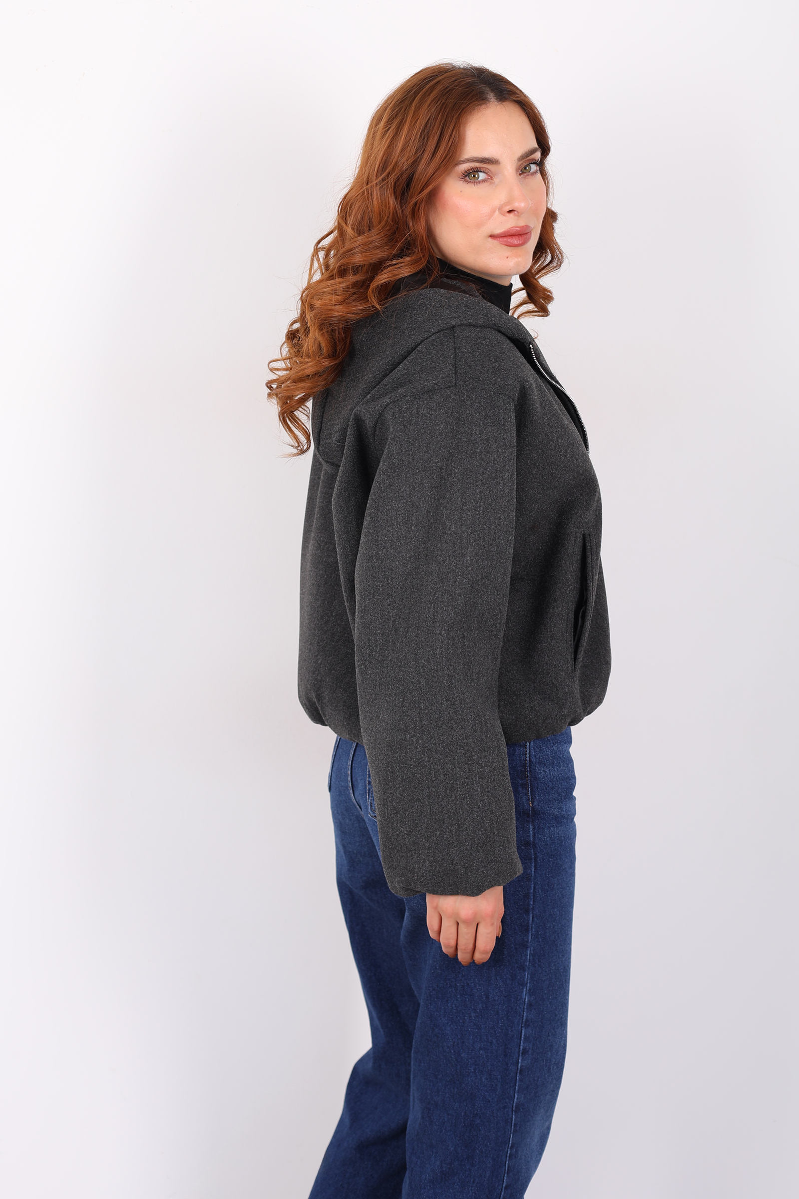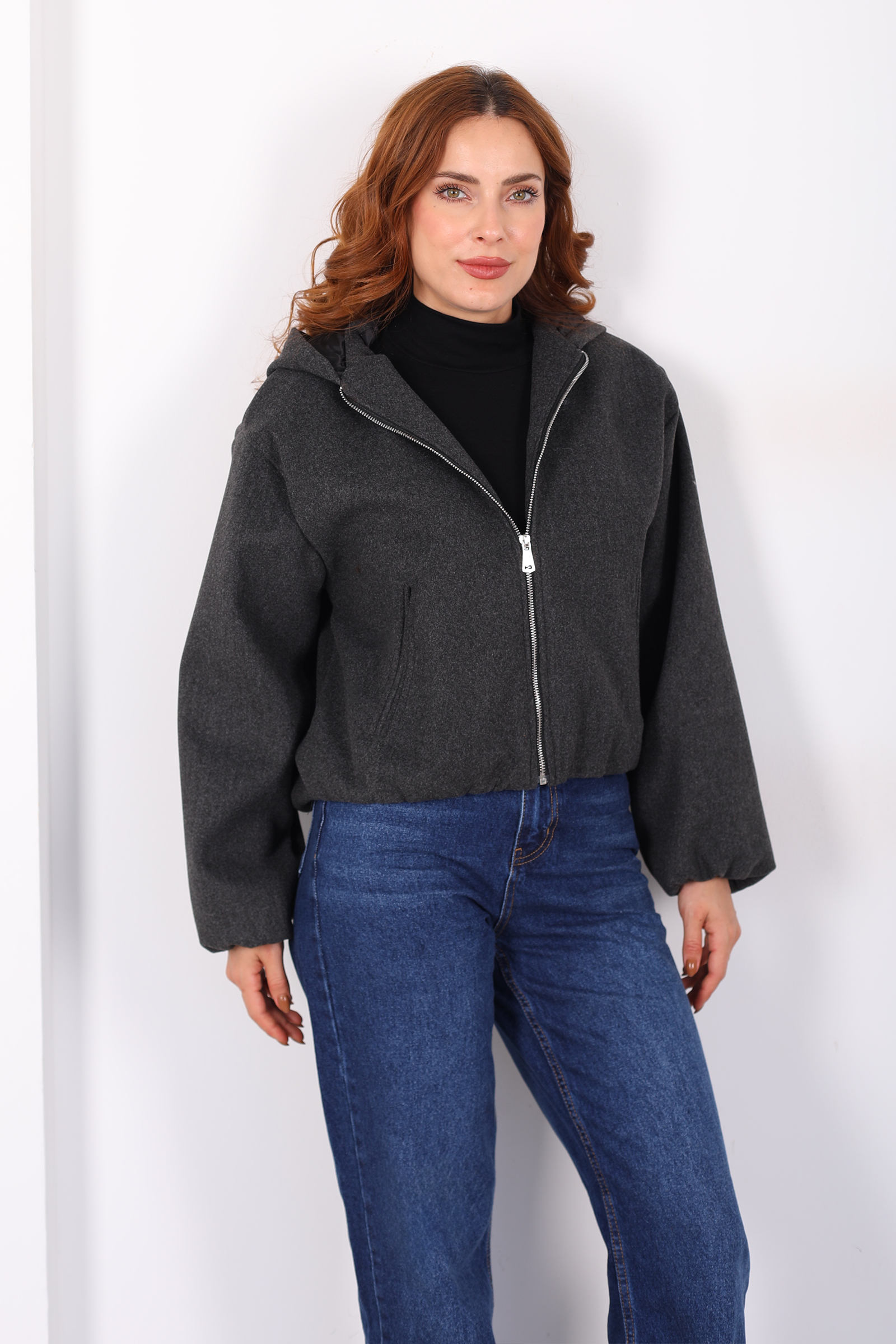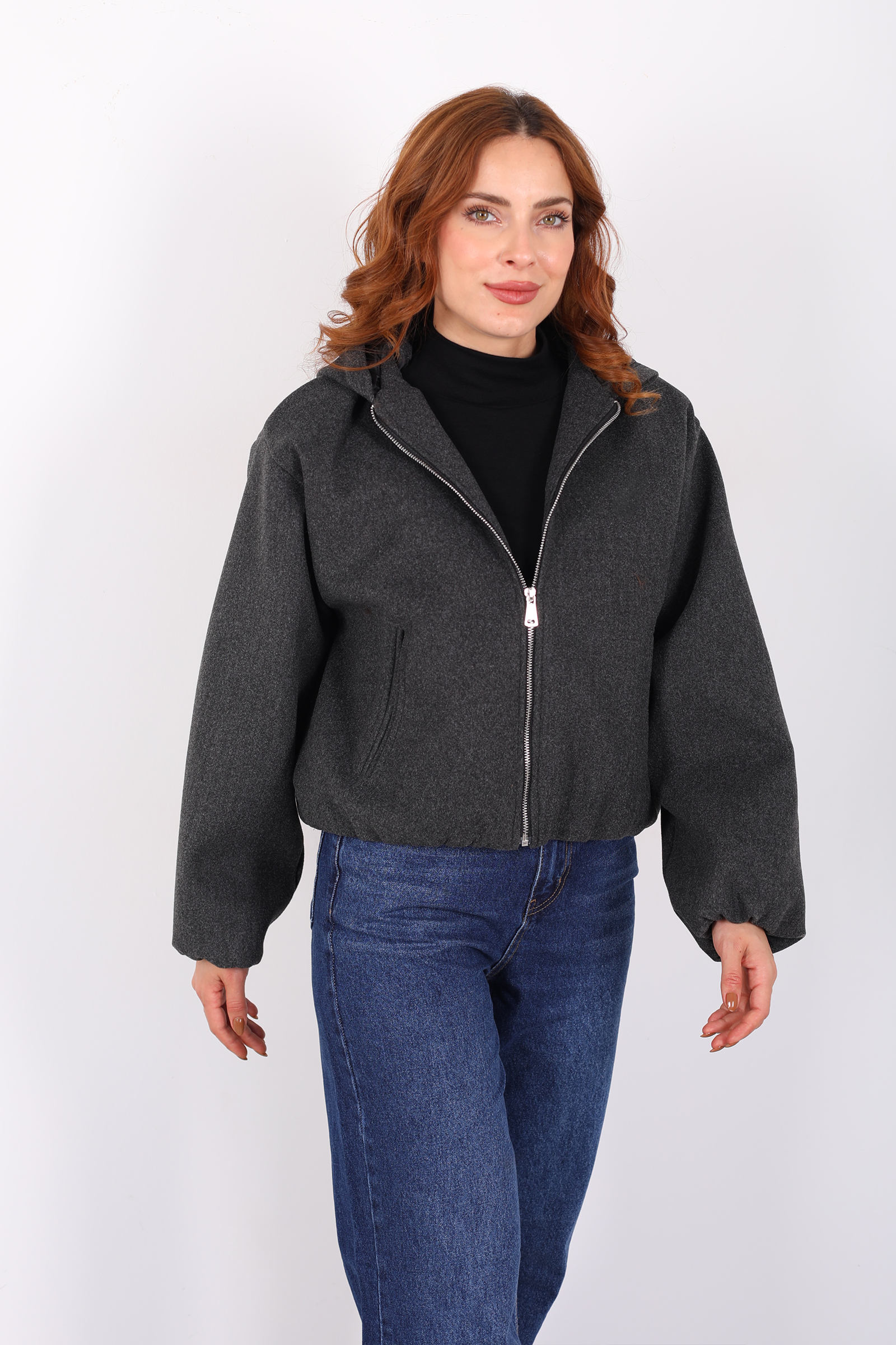 Kapüşonlu Çift Cepli Füme Kadın Kaşe Kaban