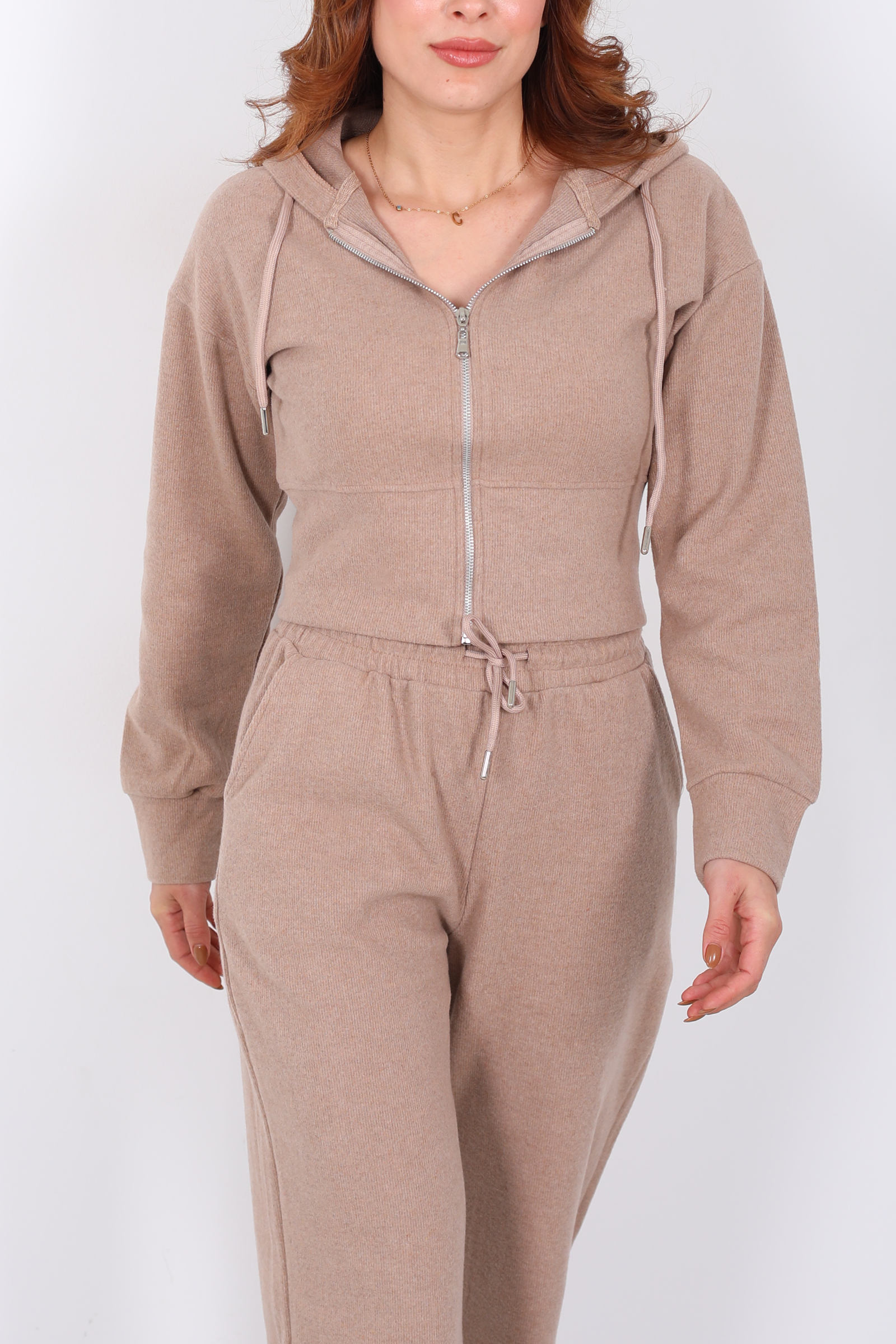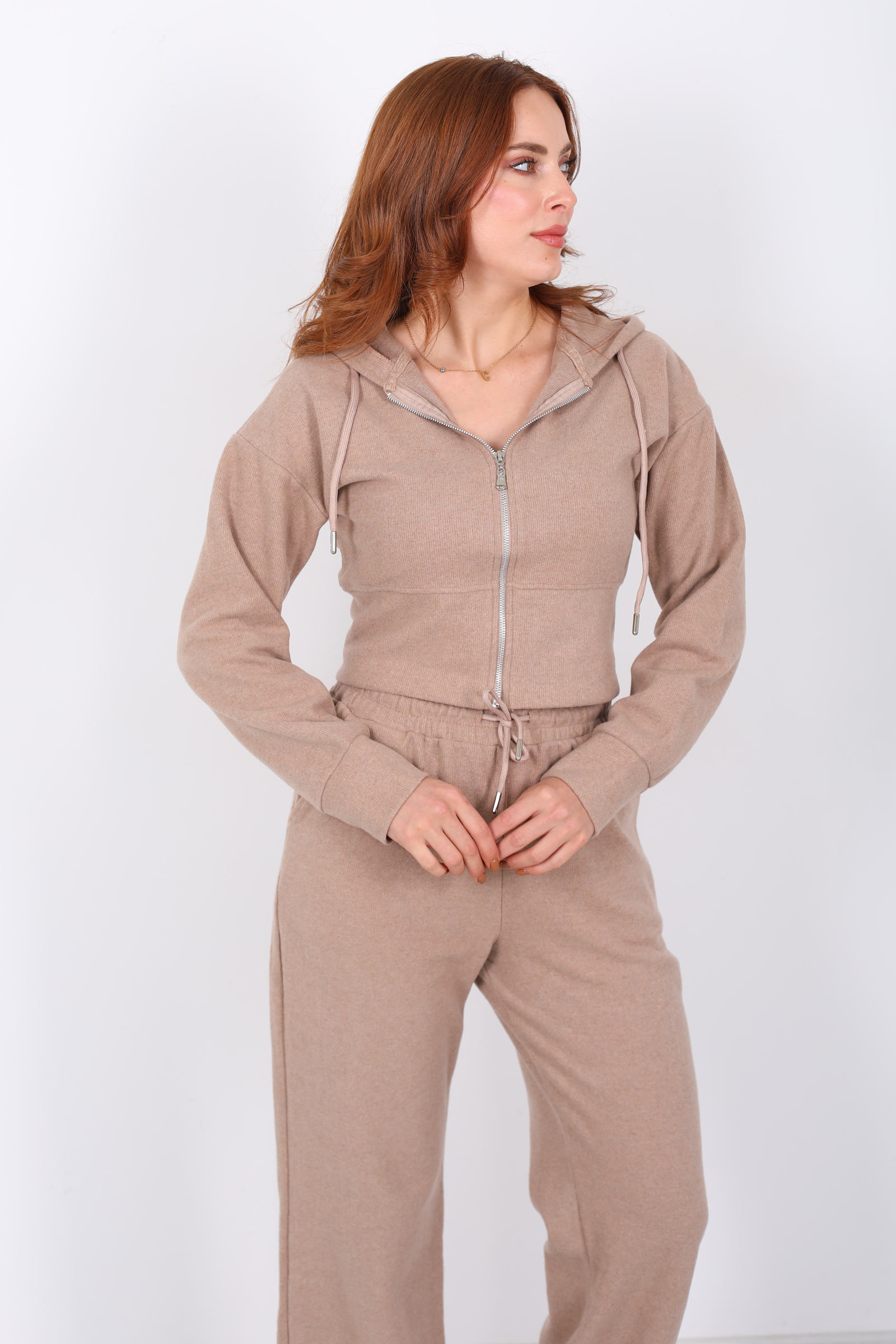 Kapüşonlu Fermuarlı Camel Kadın Selanik Takım