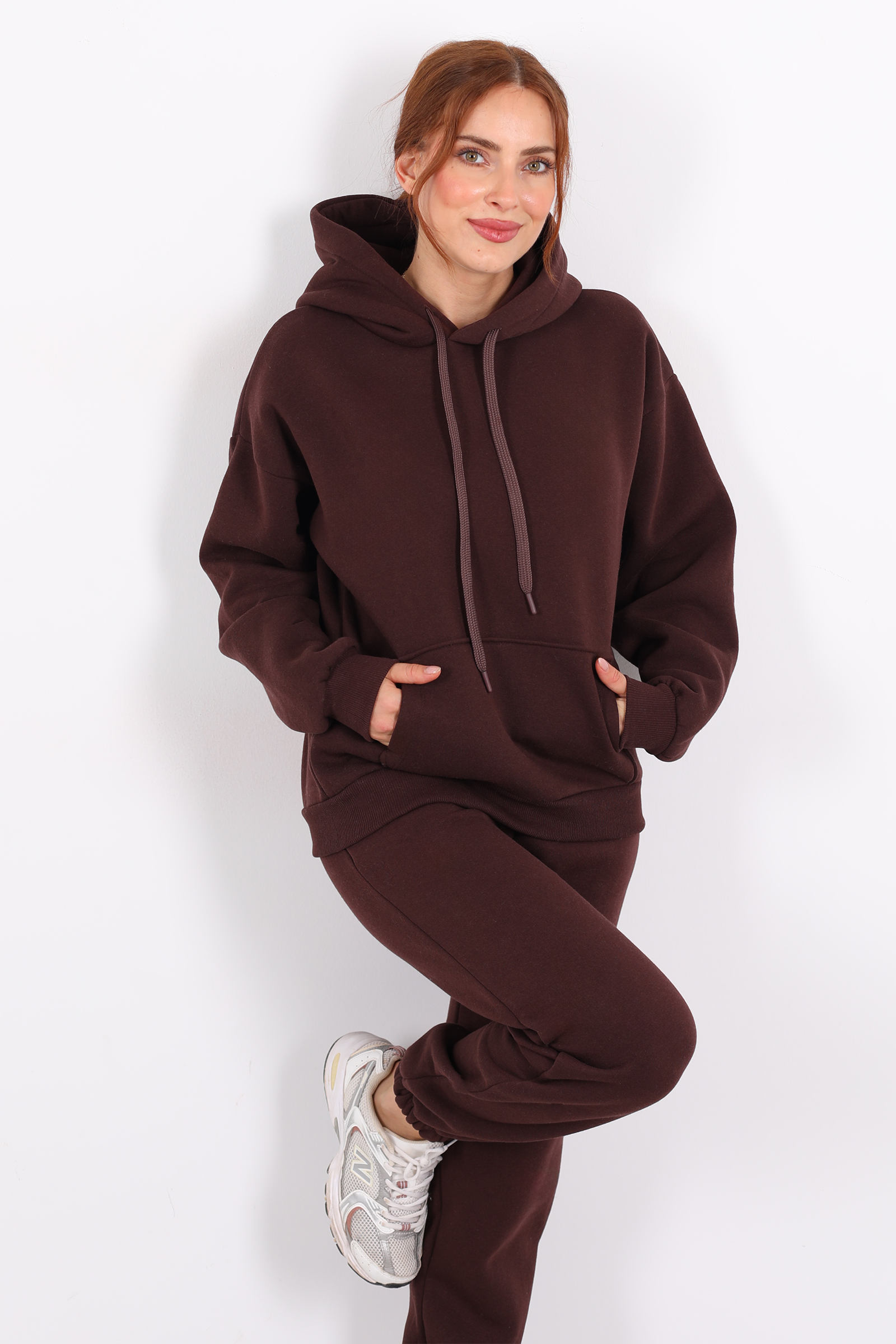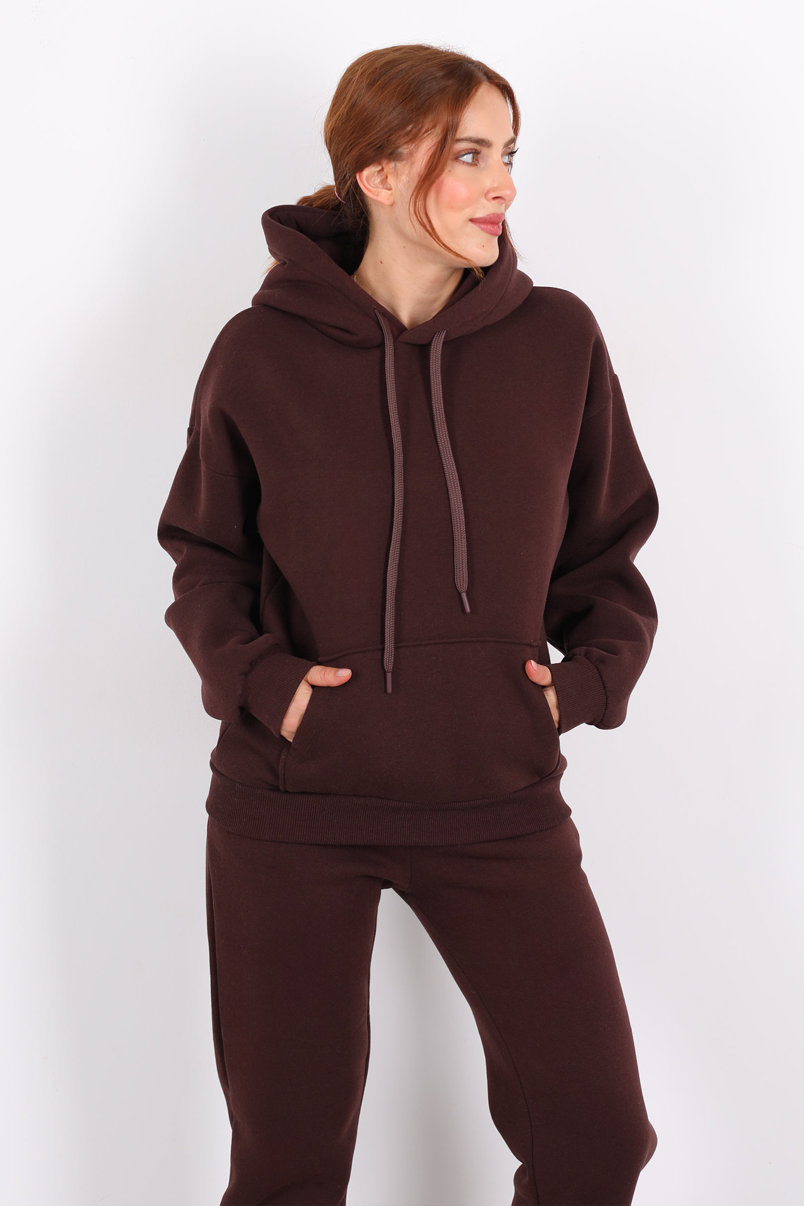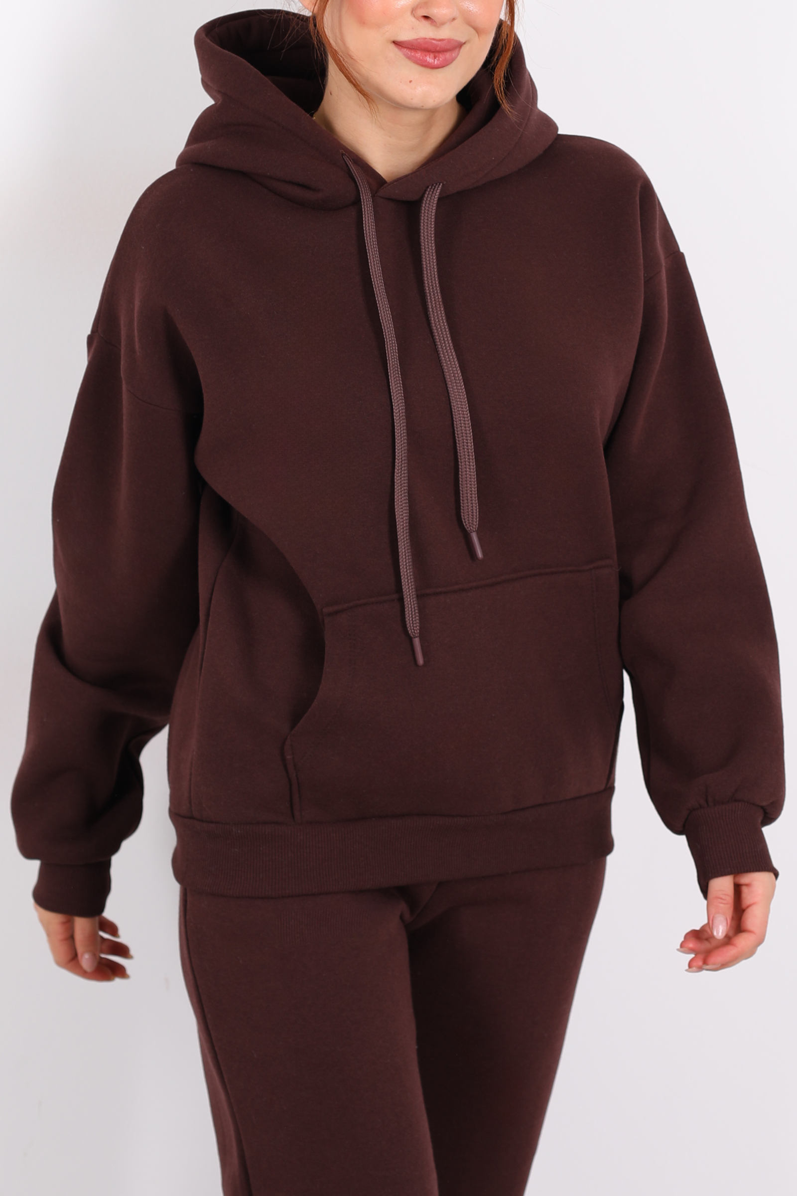 Bu kapüşonlu kanguru cepli sweat, açık kahve tonuyla sıcak, samimi bir hava taşıyor. Günlük hayatında hem konforunu hem tarzını önemseyen kadınlar için tasarlanmış dengeli bir parça.Tercih edilen kumaş büyük olasılıkla üç iplik örme yapısında bu yapı, sweatshirtlere kalınlık ve dayanıklılık kazandırır. Üç iplik kumaşlar, hem dış yüzeyin sağlam hem iç yüzeyin yumuşak olmasını sağlar.İnce bir trençkot veya bomber ceket üzerine giyerek şehirli ve modern bir katman etkisi yaratabilirsiniz.