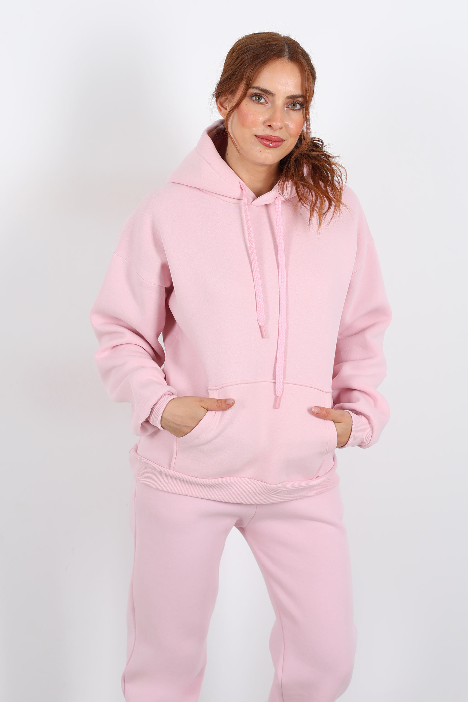 Pastel pembe rengiyle enerjik ve şık bir duruş sergileyen bu kapüşonlu sweatshirt, günlük tarzınıza hem rahatlık hem de feminen bir dokunuş katıyor. Kapüşon ve kanguru cepli tasarımı, soğuk günlerde koruma ve pratiklik sağlarken, yumuşak kumaşı cilt dostu bir konfor sunuyor.