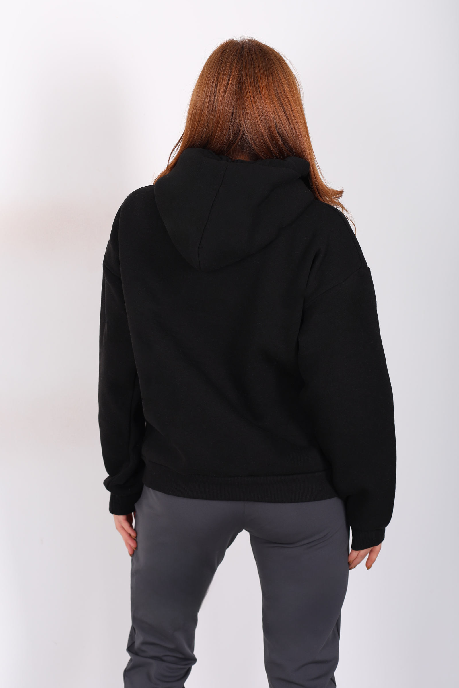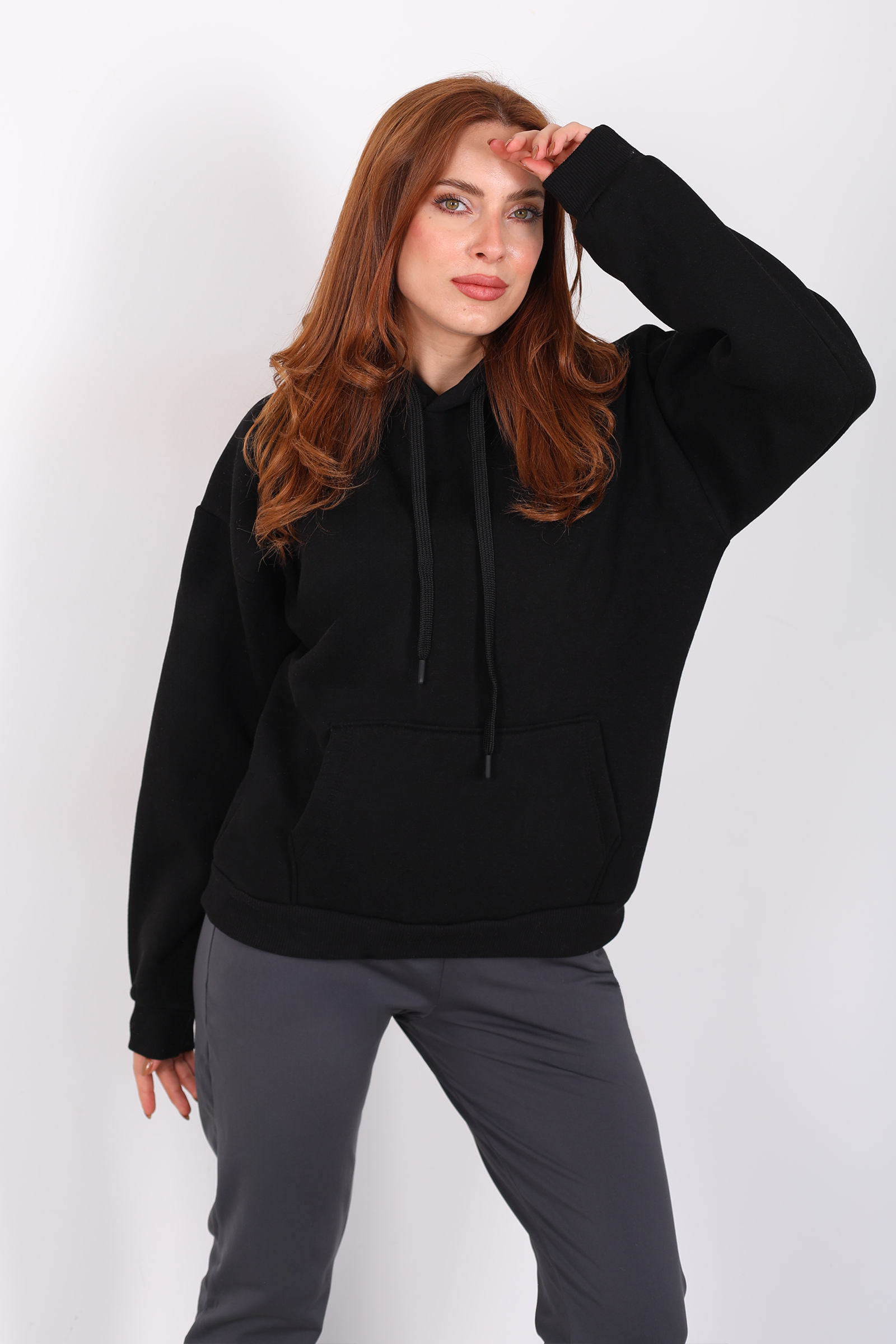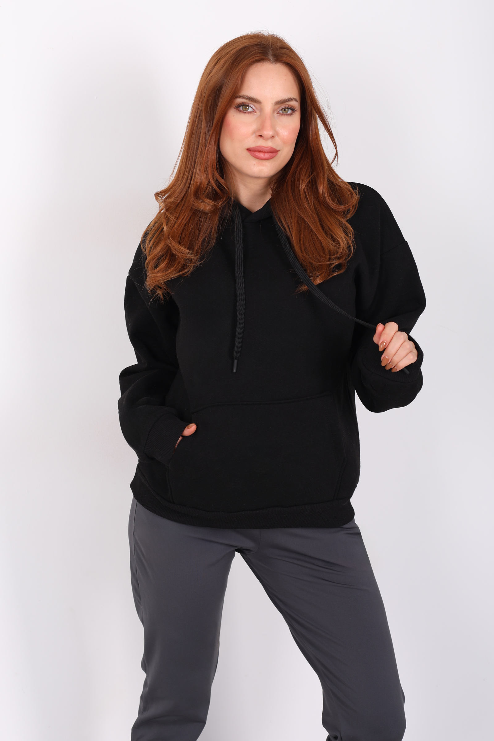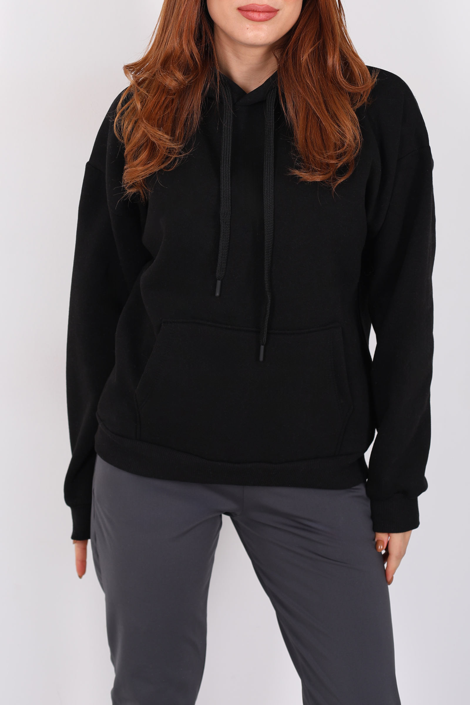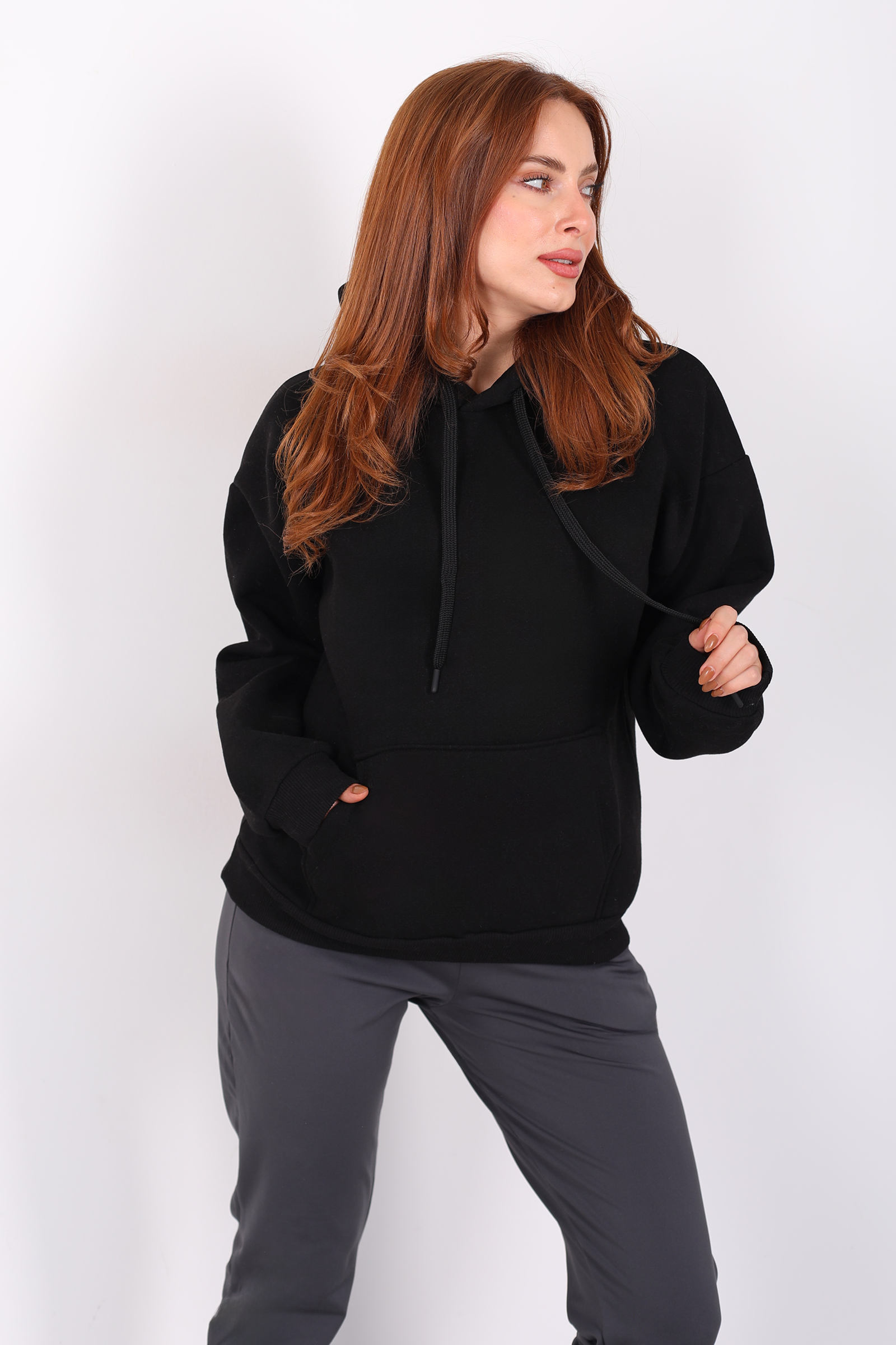Kapüşonlu Kanguru Cepli Siyah Kadın Sweat