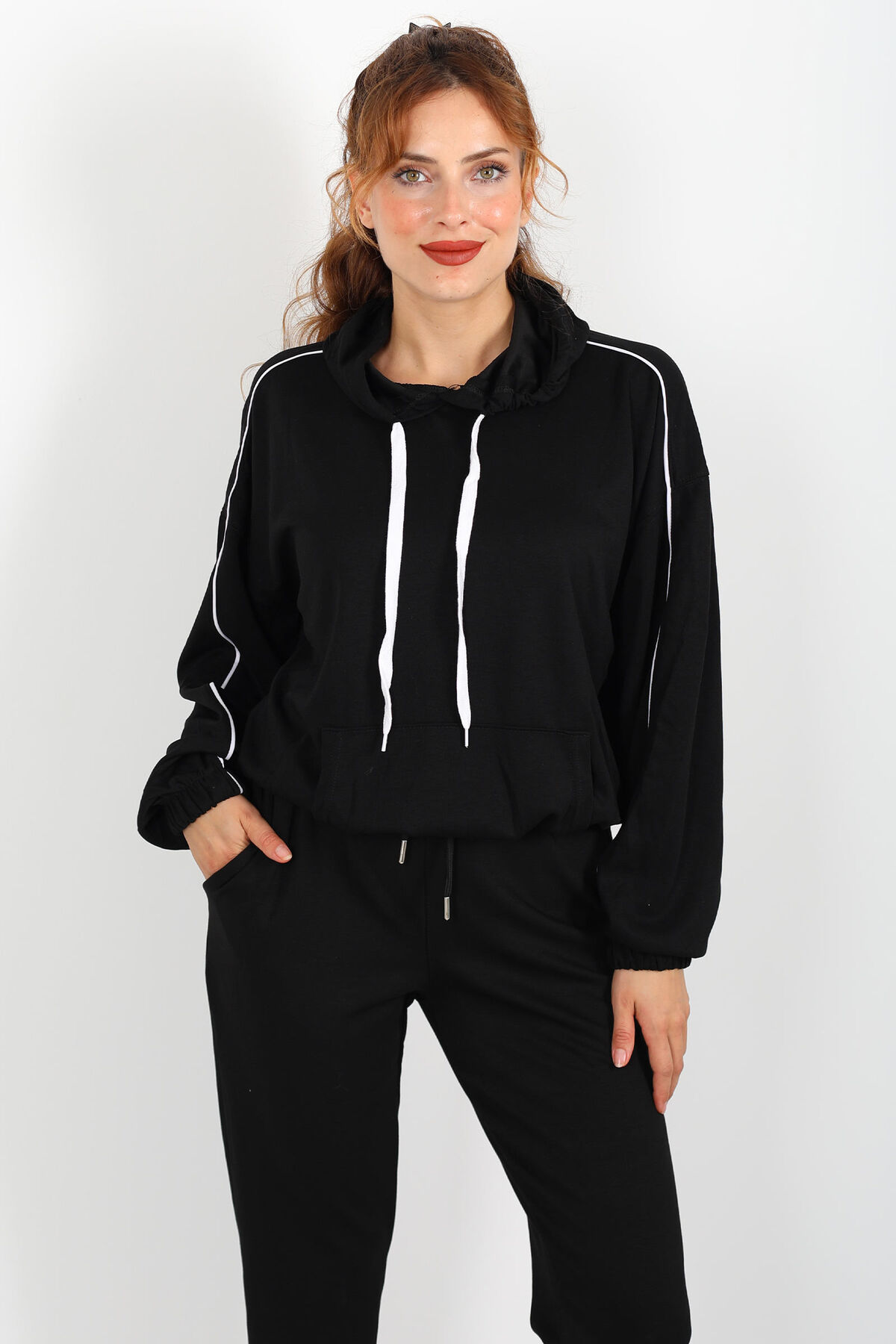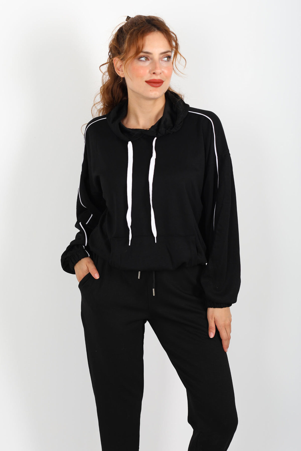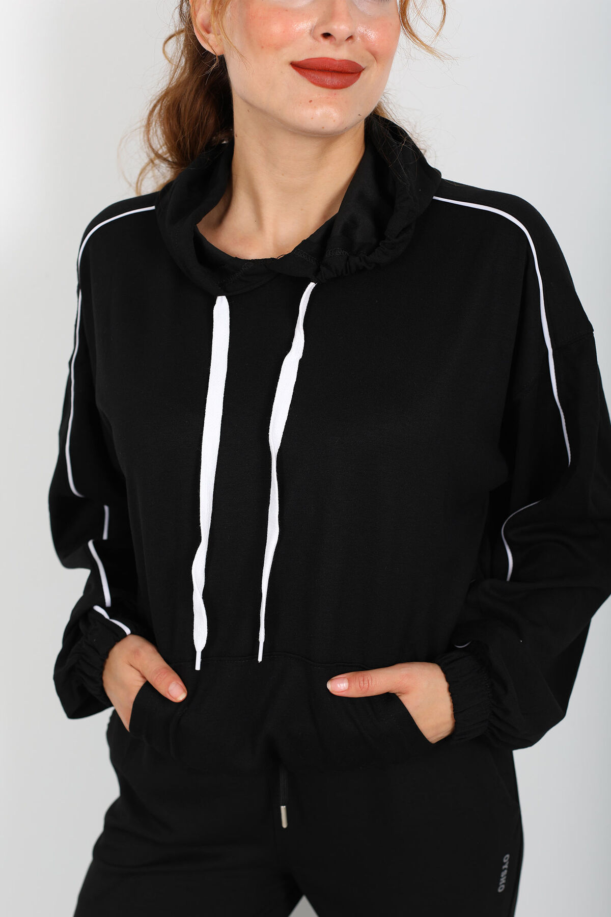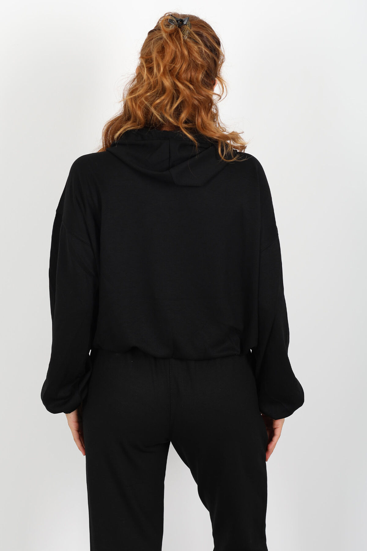 Gölgelerin içinden ince bir ışıltıyla çıkan stil: bu siyah arabiye kollu modal sweat, sade dokusuyla dikkat çeken detayları birleştiriyor. Üst kısmındaki arabiyeli kol tasarımı, klasik sweat modellerine nazik bir zarafet katarken, kapüşonlu yapı kulakları, boynu ve saçlarını hafif rüzgârlardan koruyan bir dokunuş sunuyor. Modal ‒ polyester ‒ likra karışımı kumaş, vücudu kavramadan serbestçe akar; nefes alabilirliği yüksek olduğu için gün boyu hem rahat hem şık bir his veriyor.