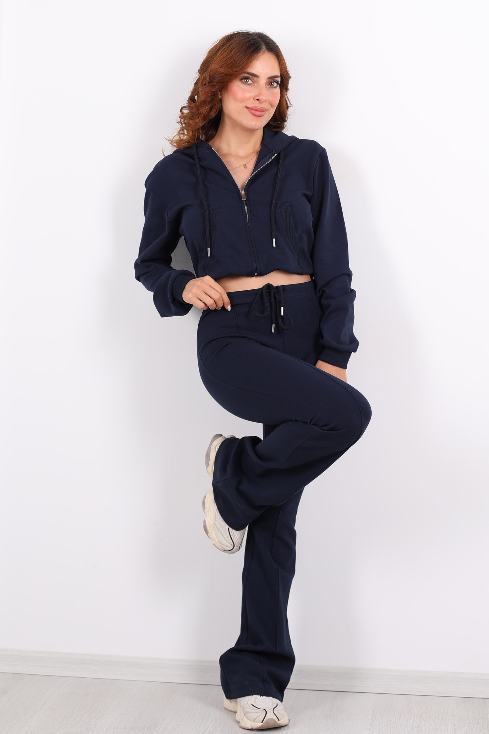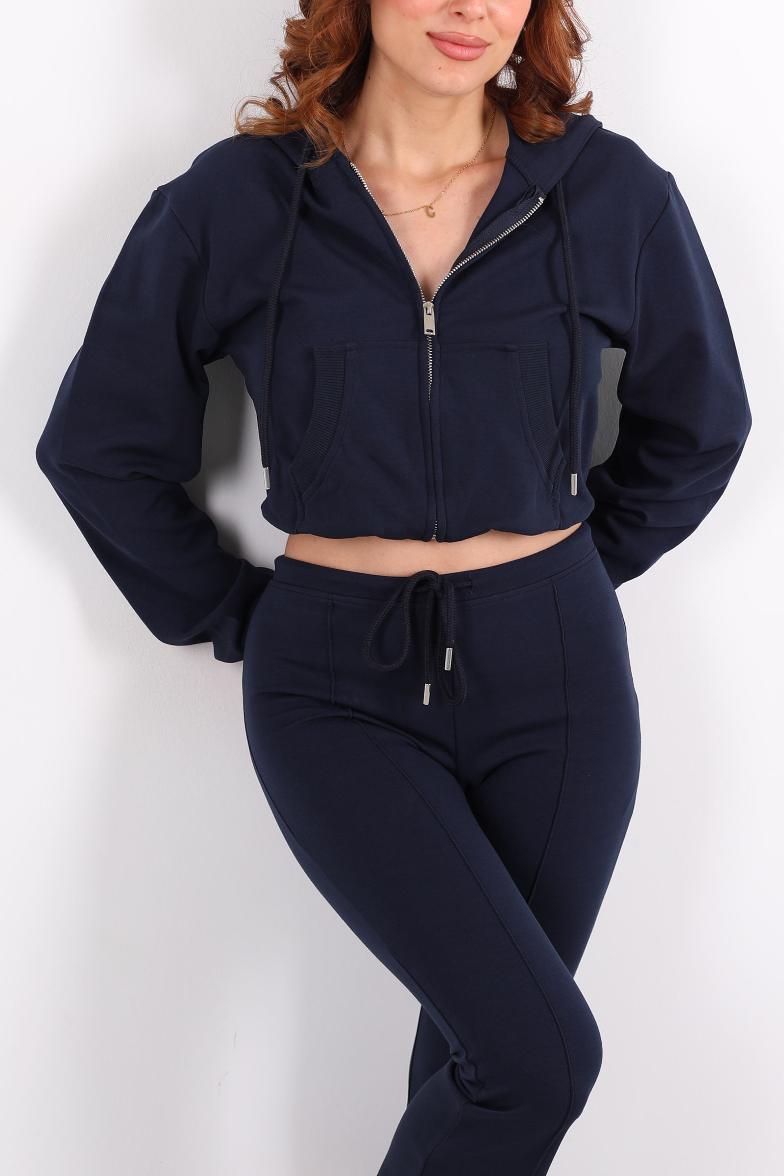 Sakin ama çarpıcı bir zarafet taşımak isteyen kadınlar için tasarlanmış bu lacivert takım, çimalı dokusunun ön kısmındaki detayları ile sıradanlıktan uzaklaşıyor. Kapüşonlu üst parça, hafif salaş kesimiyle belinizdeki bağcıklı görünümle iyi bir kontrast oluştururken; İspanyol paça model alt parça, akıcı bir siluet yaratıyor. Lacivertin derin tonu, gökyüzünün gece rengi kadar etkileyici; hem gündüz kullanımlarında hem akşam dışarı çıkarken stilinizi güçlü şekilde öne çıkarır.