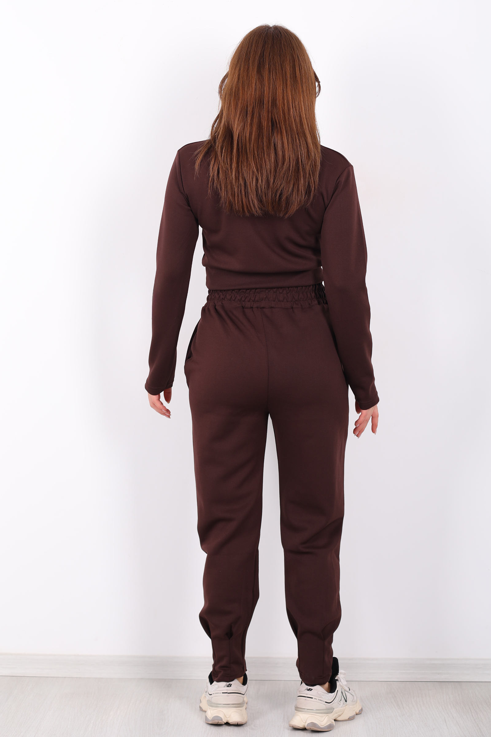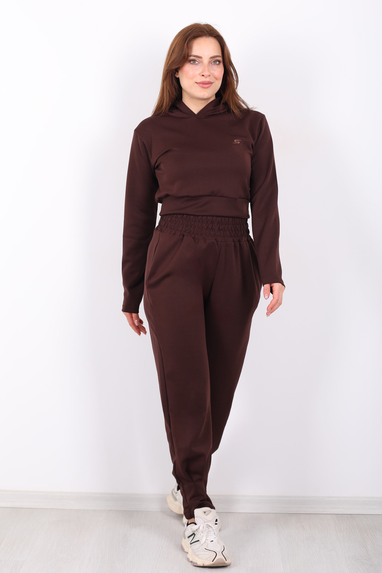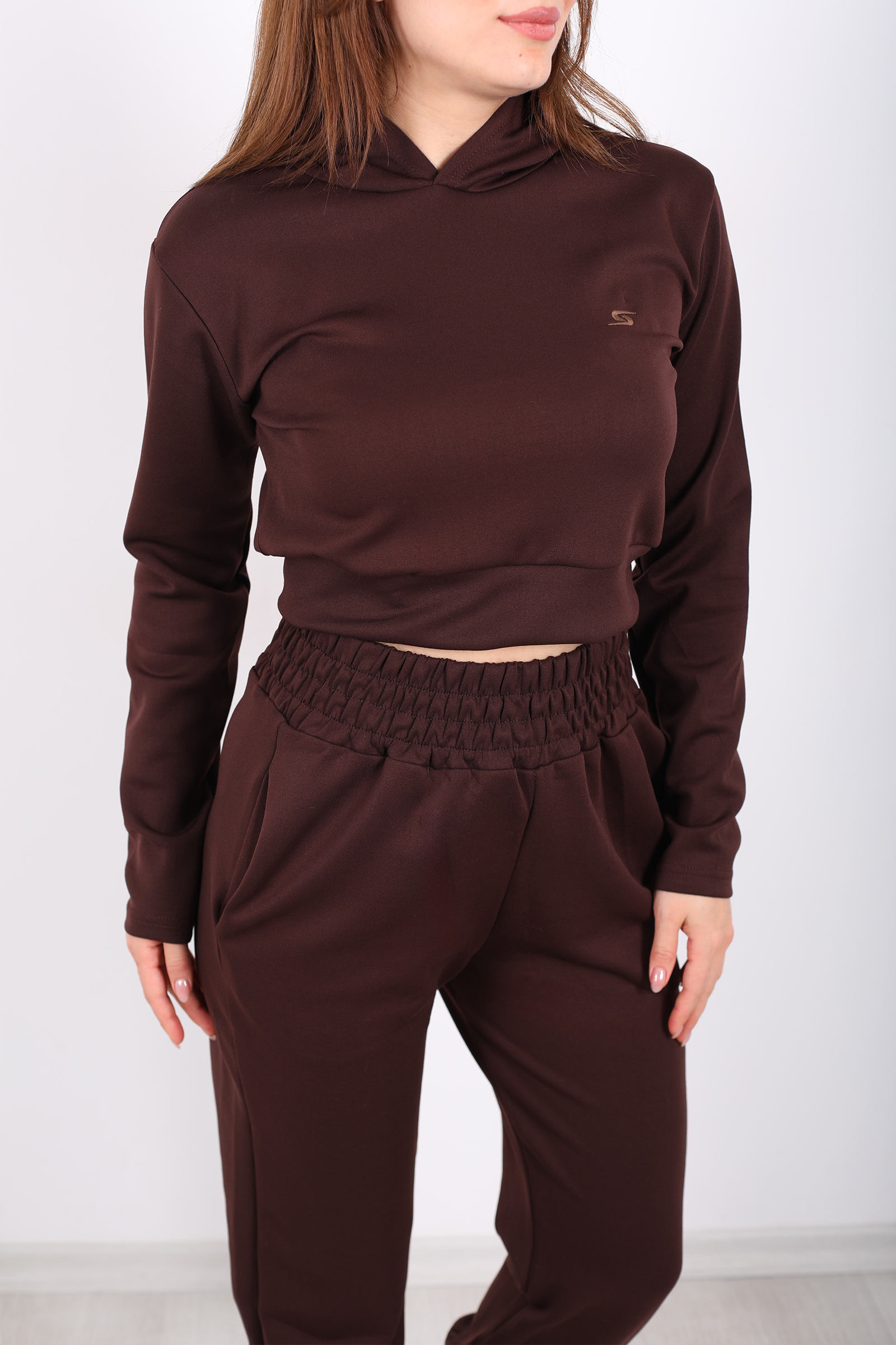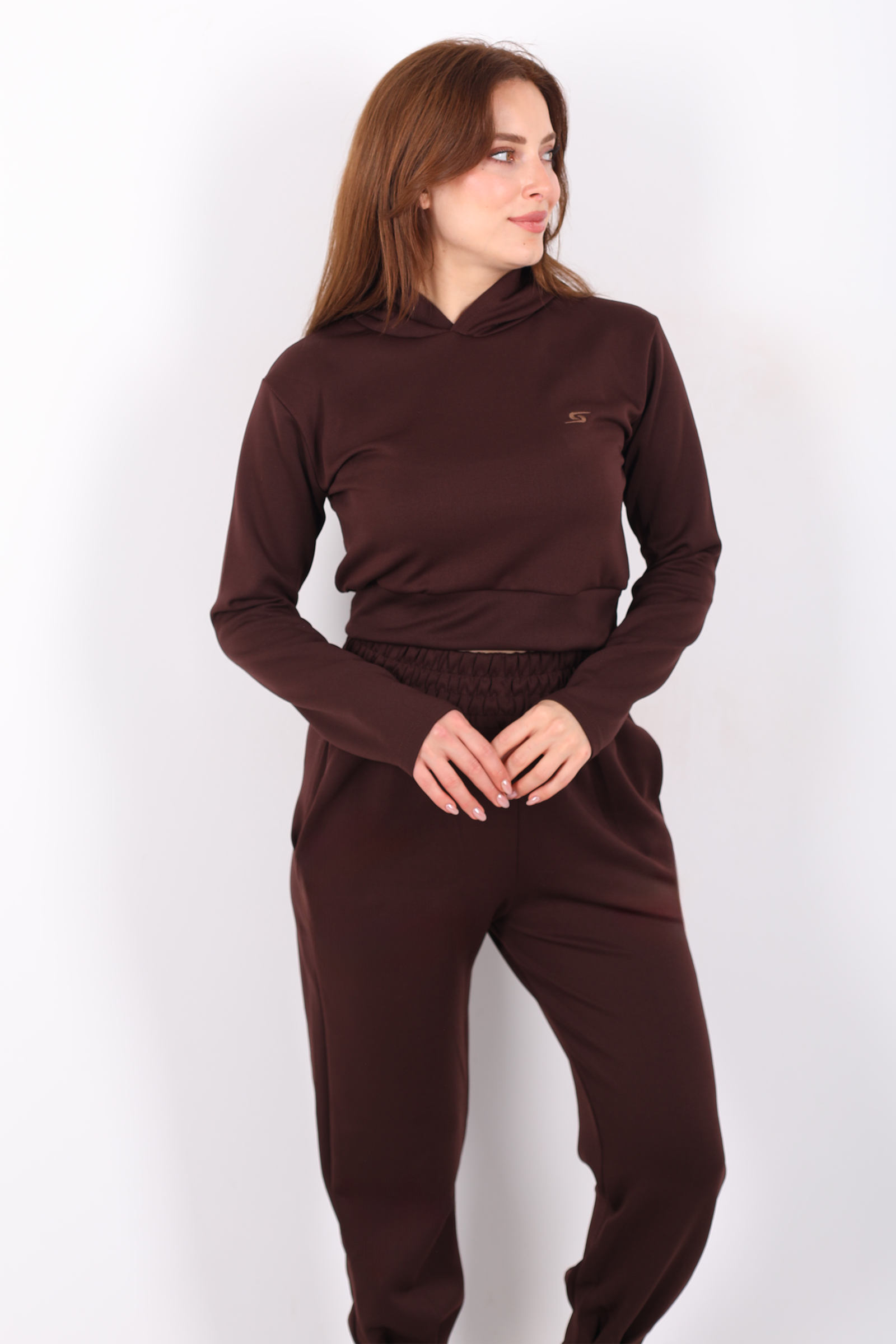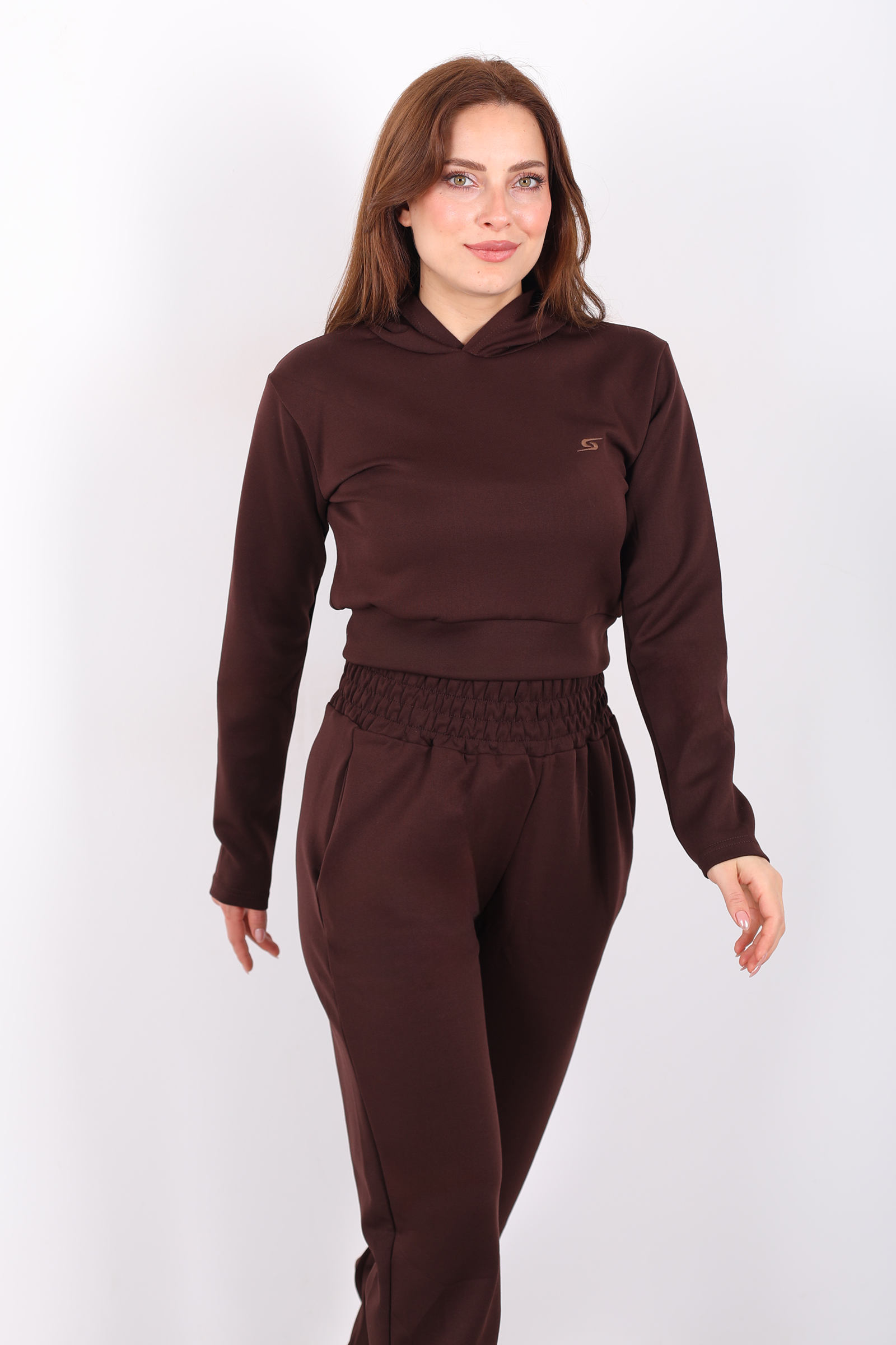 Kahverenginin sıcak tonuyla tasarlanmış bu kapüşonlu scuba takım, modern kesimi ve esnek kumaşıyla her mevsime uyum sağlar. Scuba kumaşın pürüzsüz dokusu, günlük kullanımda konforu artırırken, pensli paça detayları takıma sportif bir duruş kazandırır. Üstteki kapüşon, rahat ve koruyucu bir şıklık sunar; altın ise bel ve paça tasarımıyla hareket özgürlüğünü öne çıkarır. Sneaker veya minimal aksesuarlarla tamamlandığında, şehir stilinde hem rahat hem şık bir görünüm yaratır.