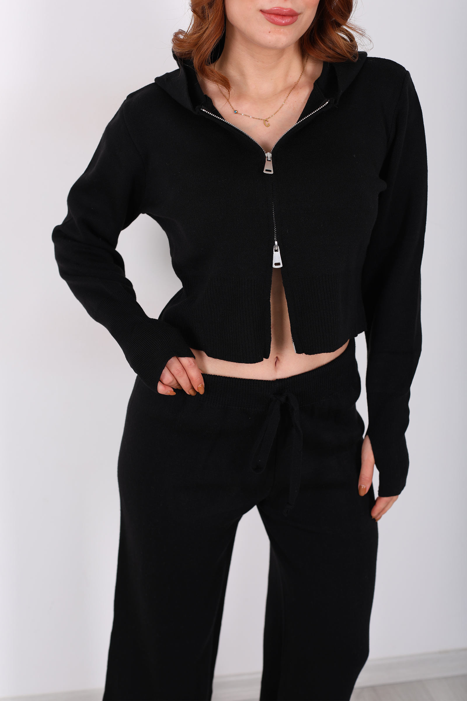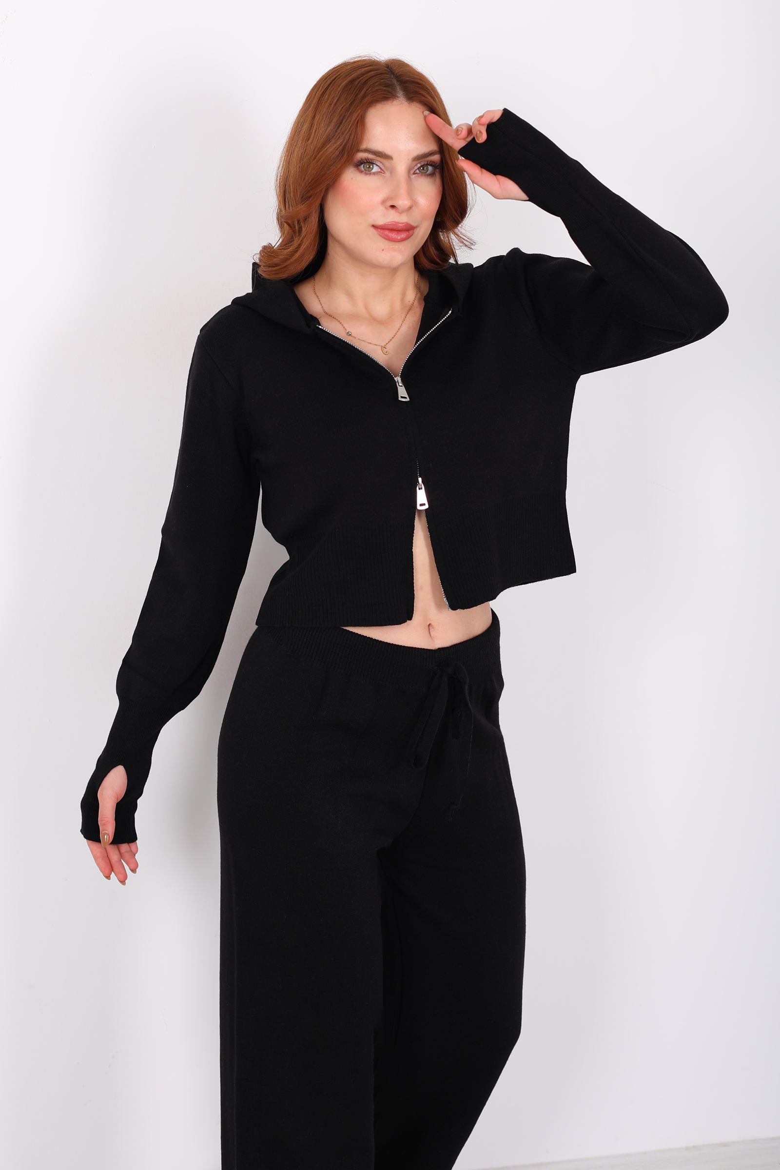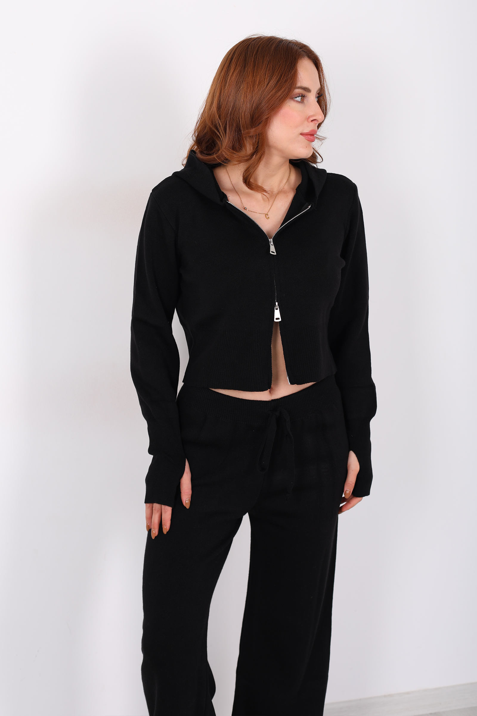 Kapüşonlu Parmak Geçirmeli Siyah Kadın Triko Takım