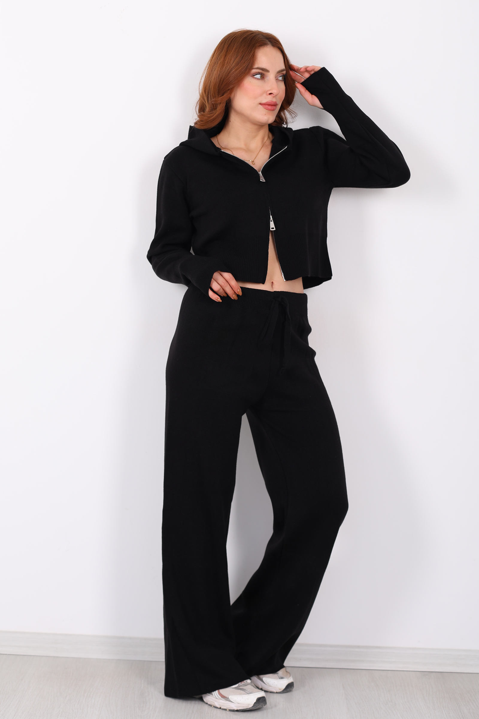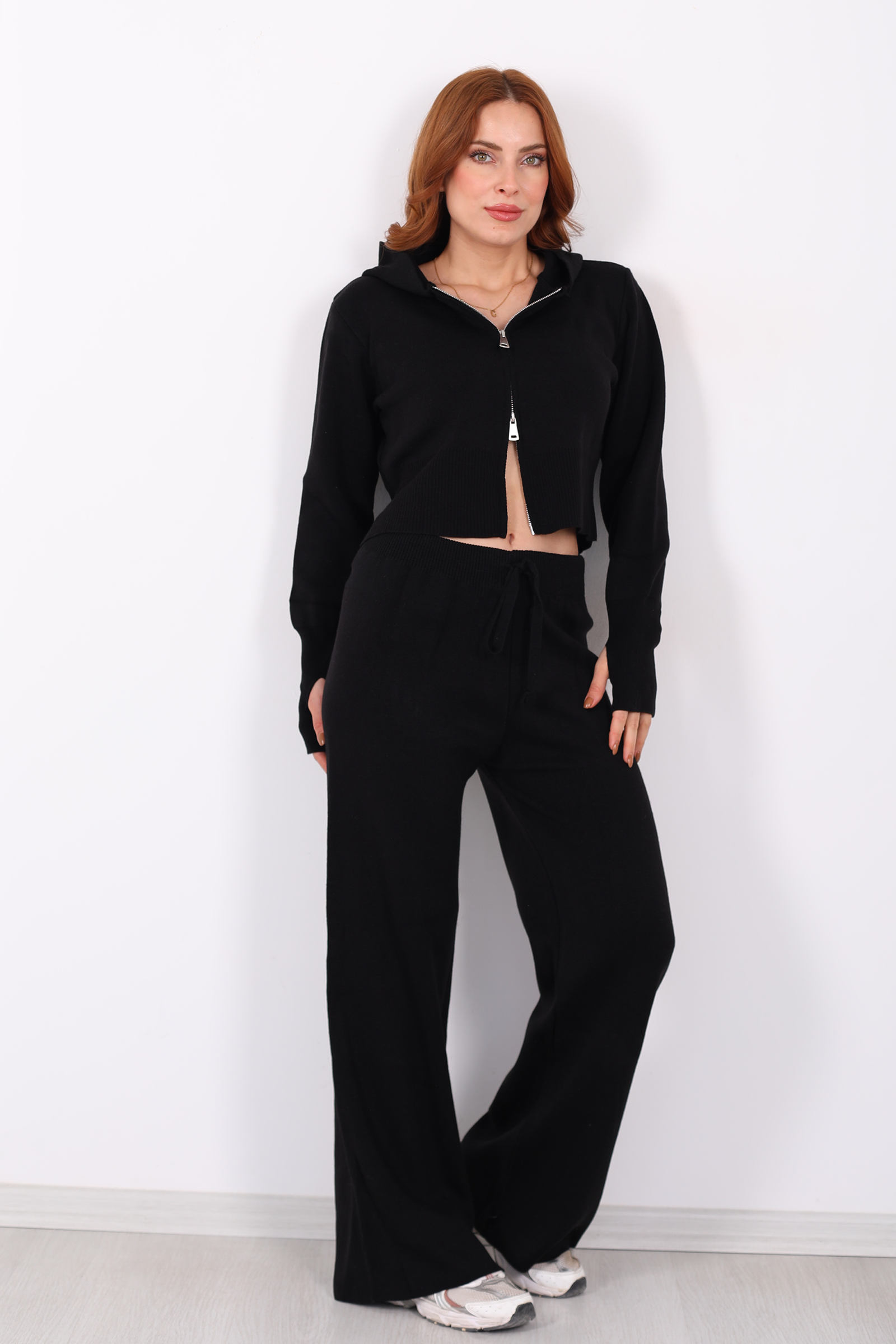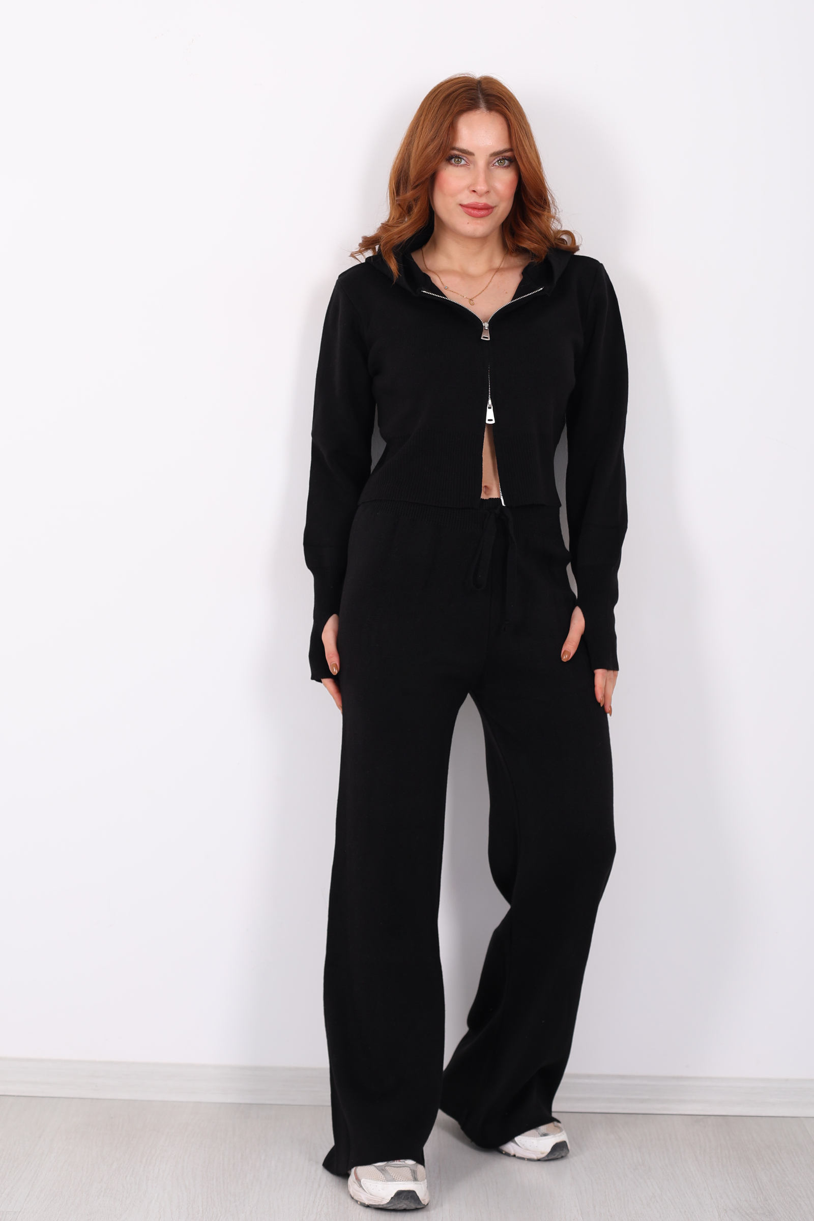 Kapüşonlu Parmak Geçirmeli Siyah Kadın Triko Takım