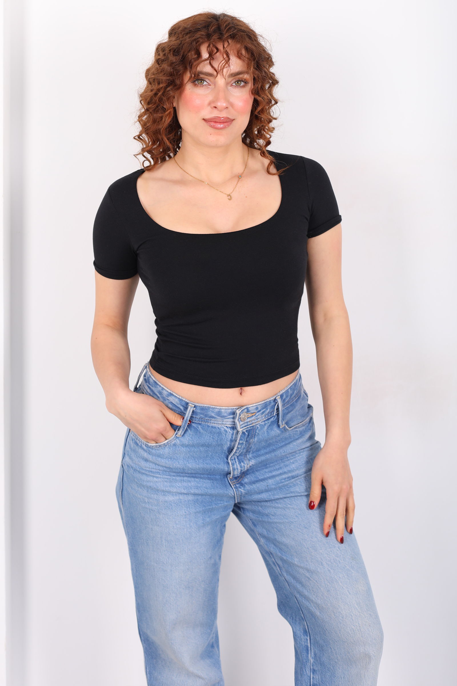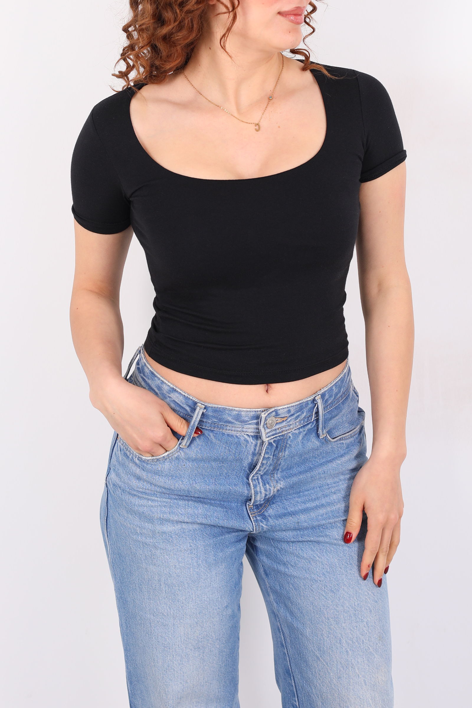 Kare Yaka Kısa Kol Siyah Kadın Basic Body