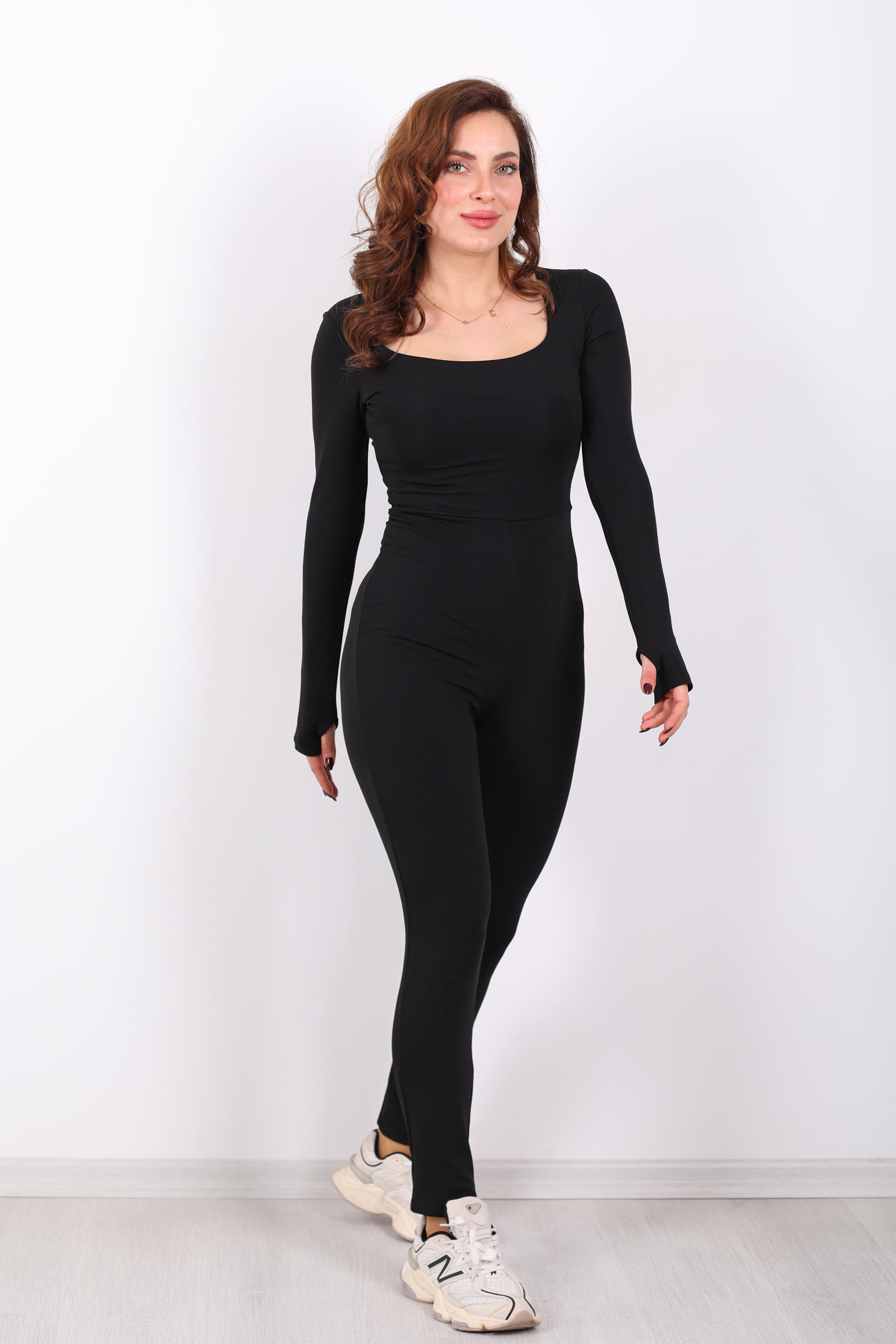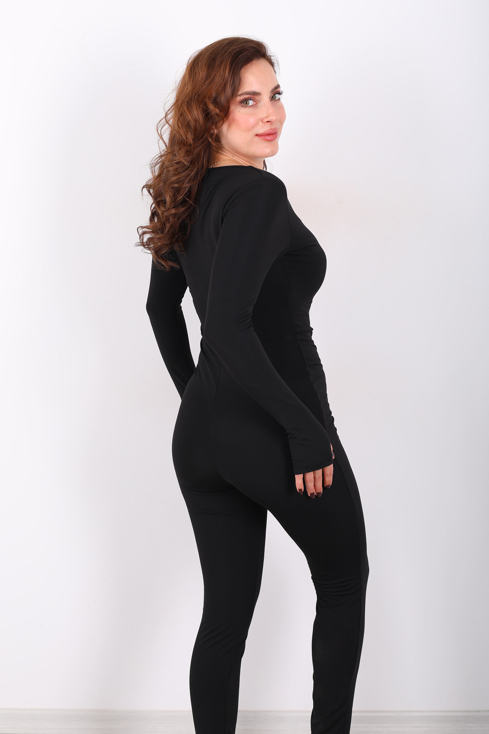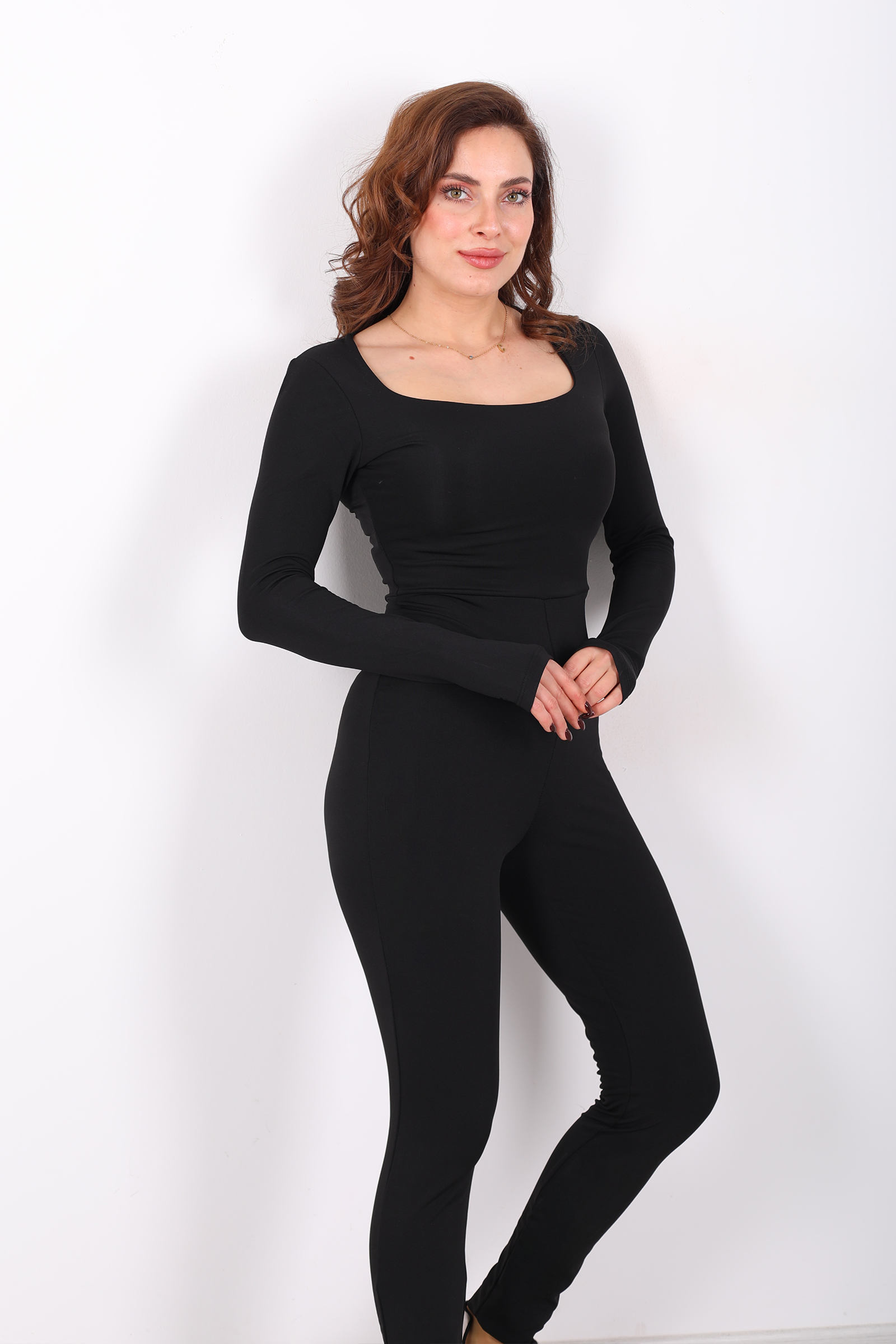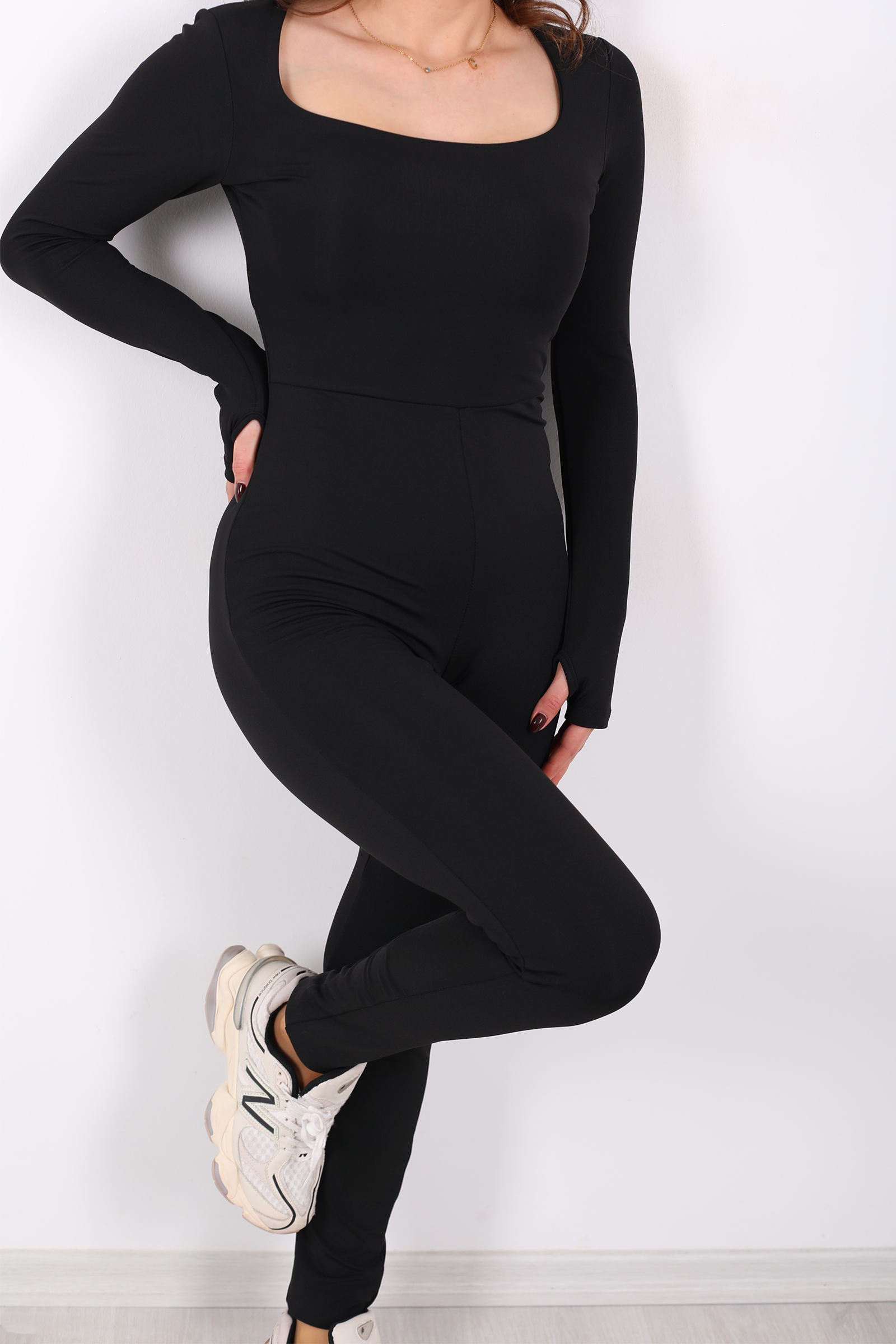 Kare Yaka Parmak Geçirmeli Siyah Kadın Şardonlu Dalgıç Tulum