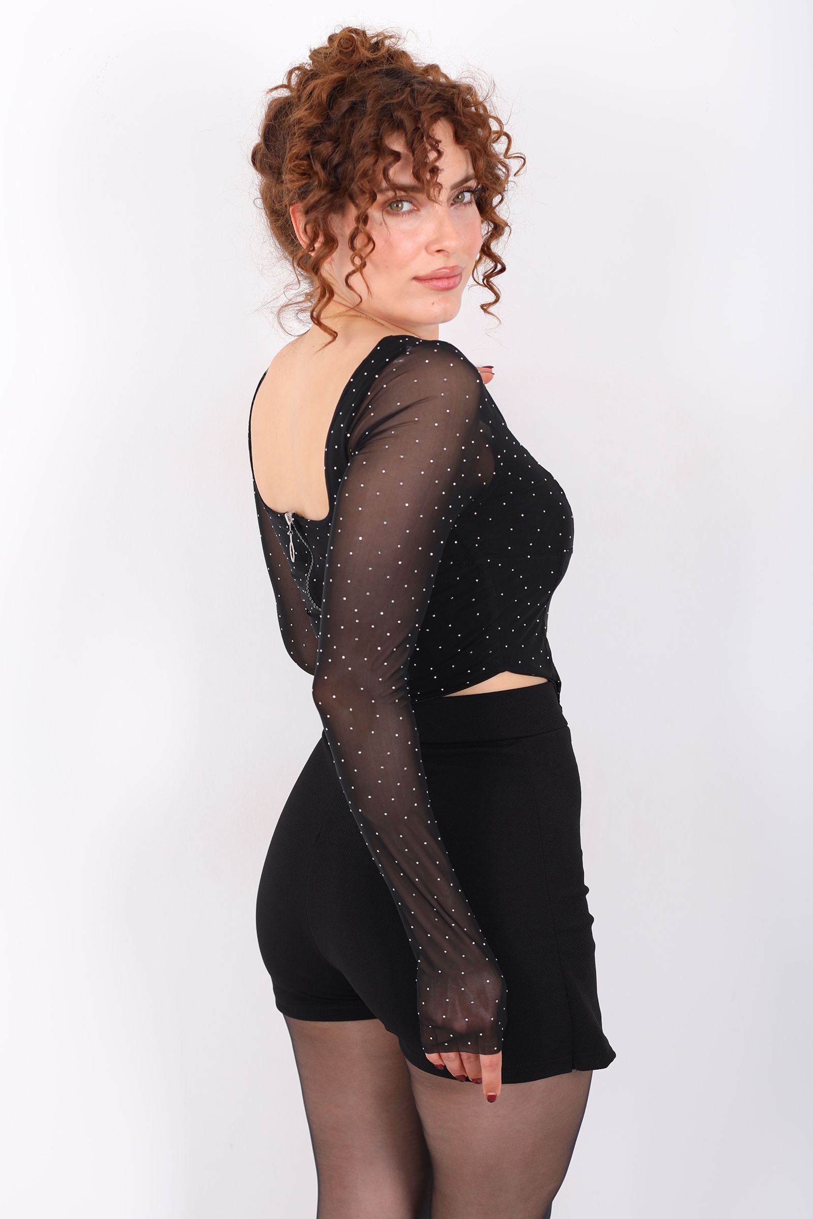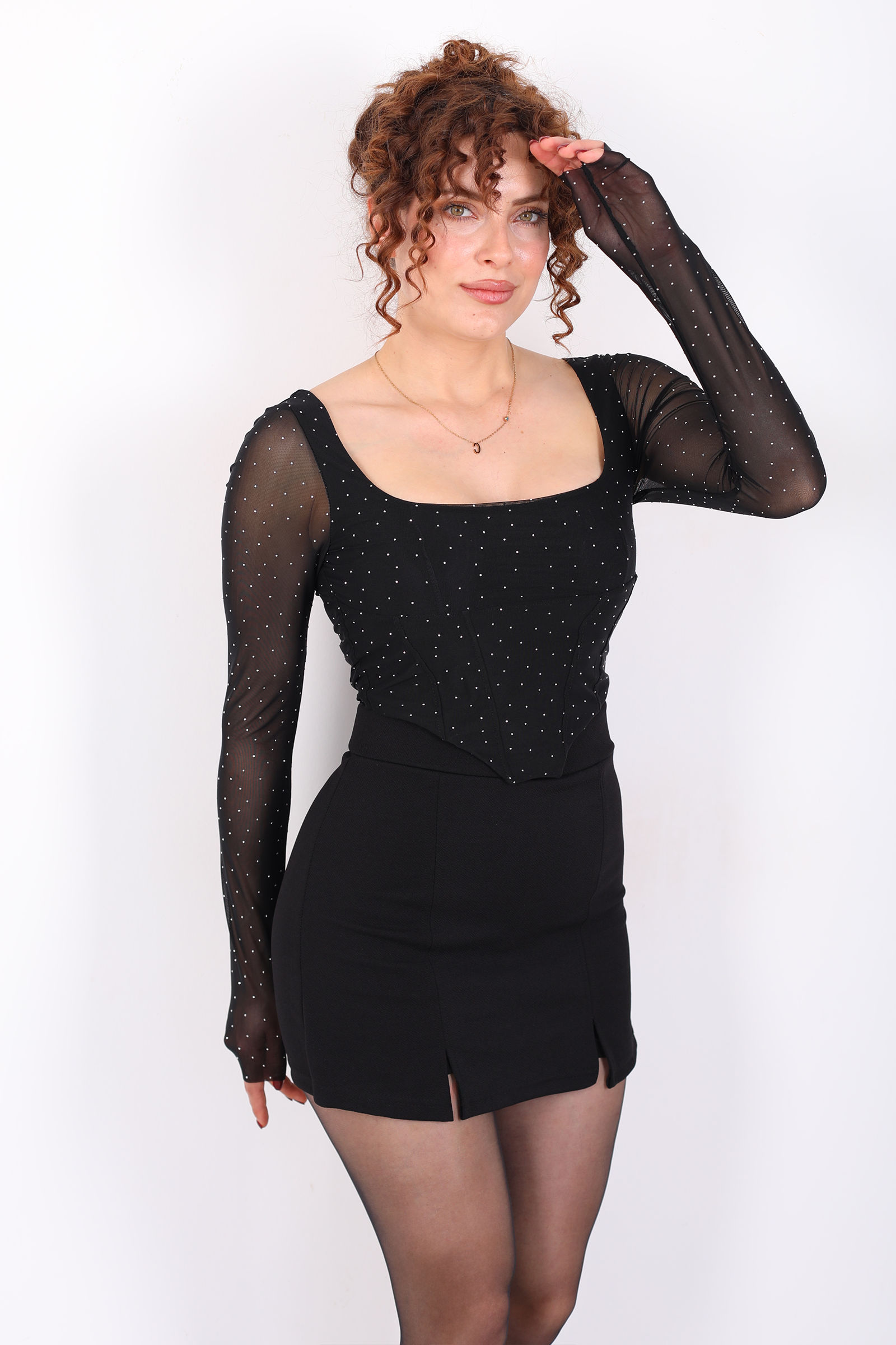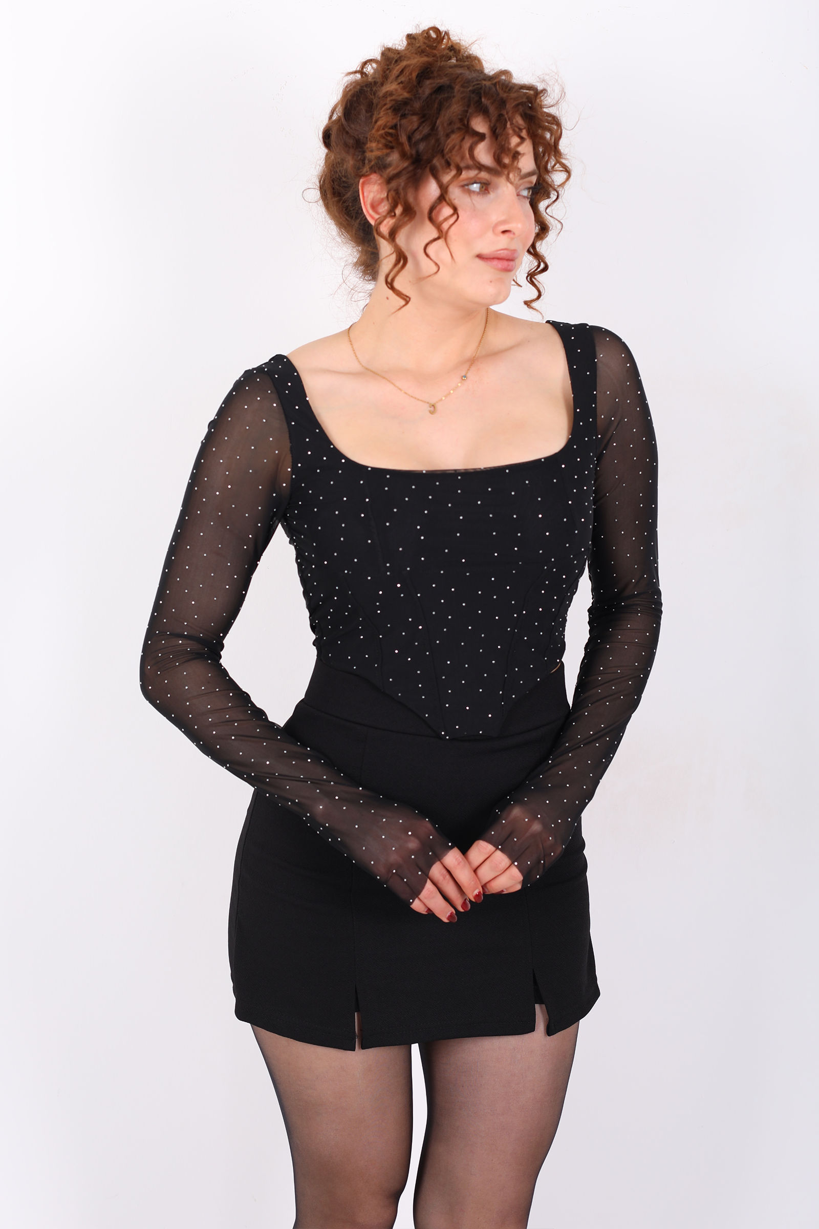 Kare Yaka Taşlı Korse Kesim Siyah Kadın Tül Bluz