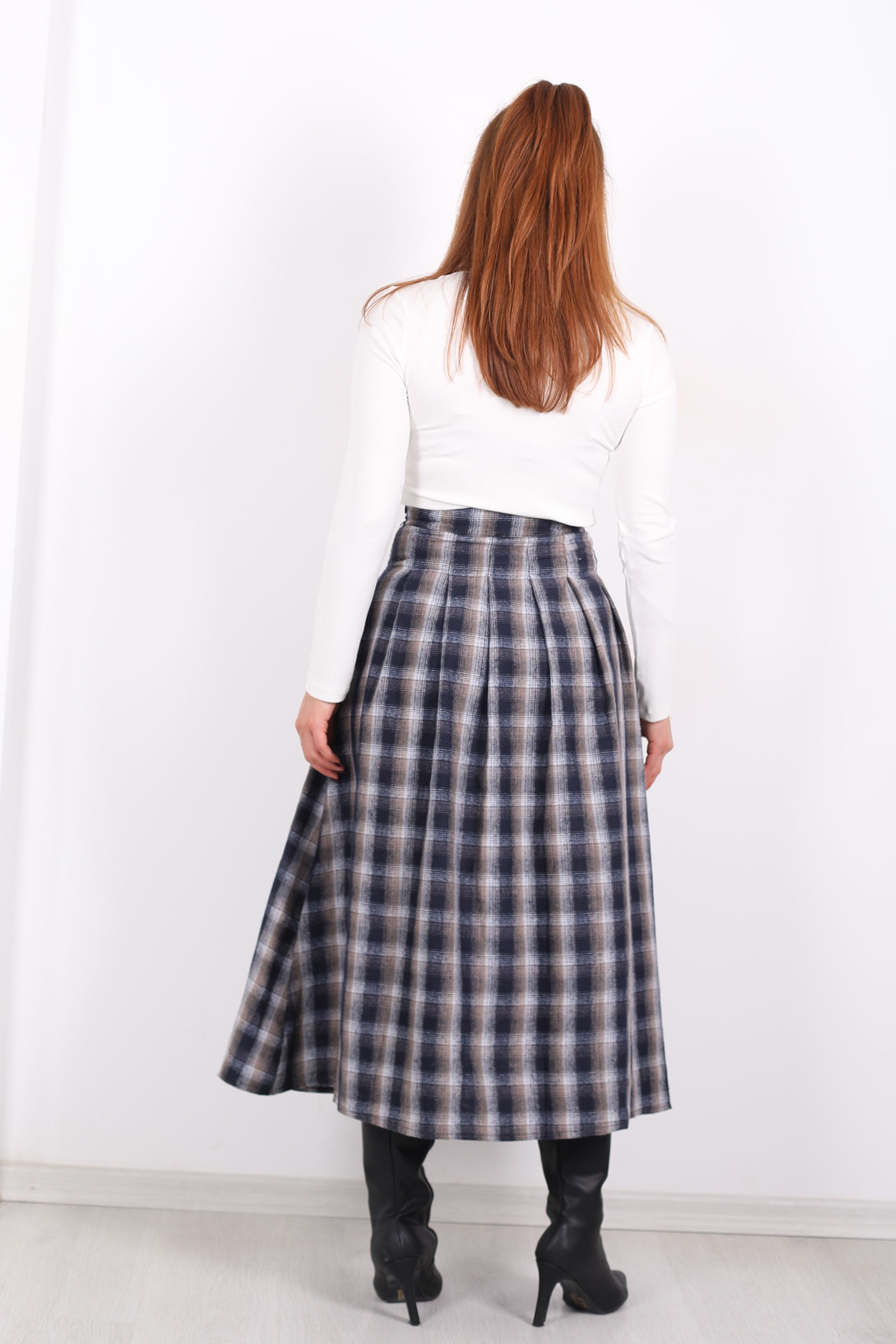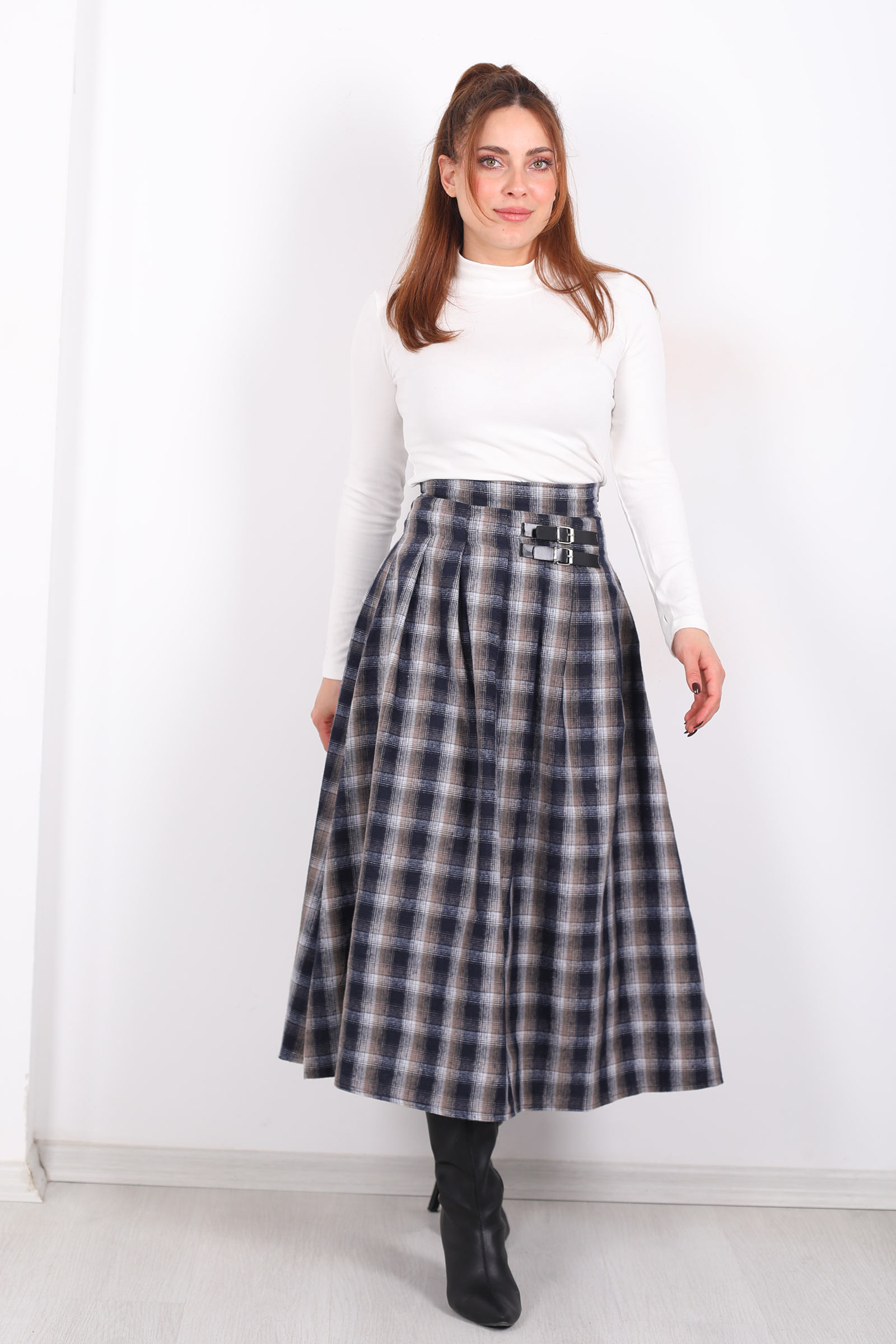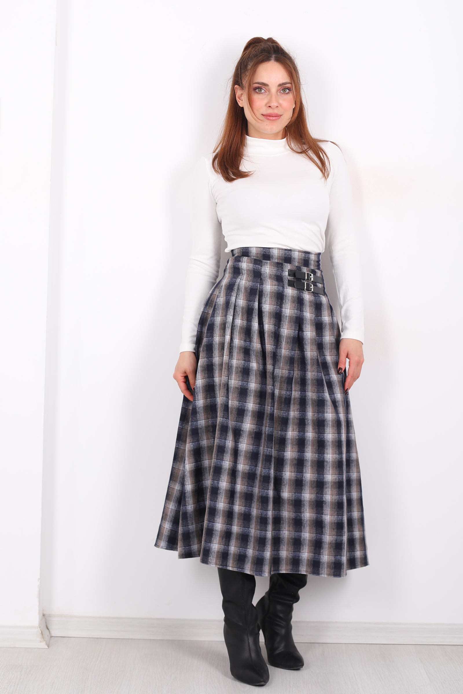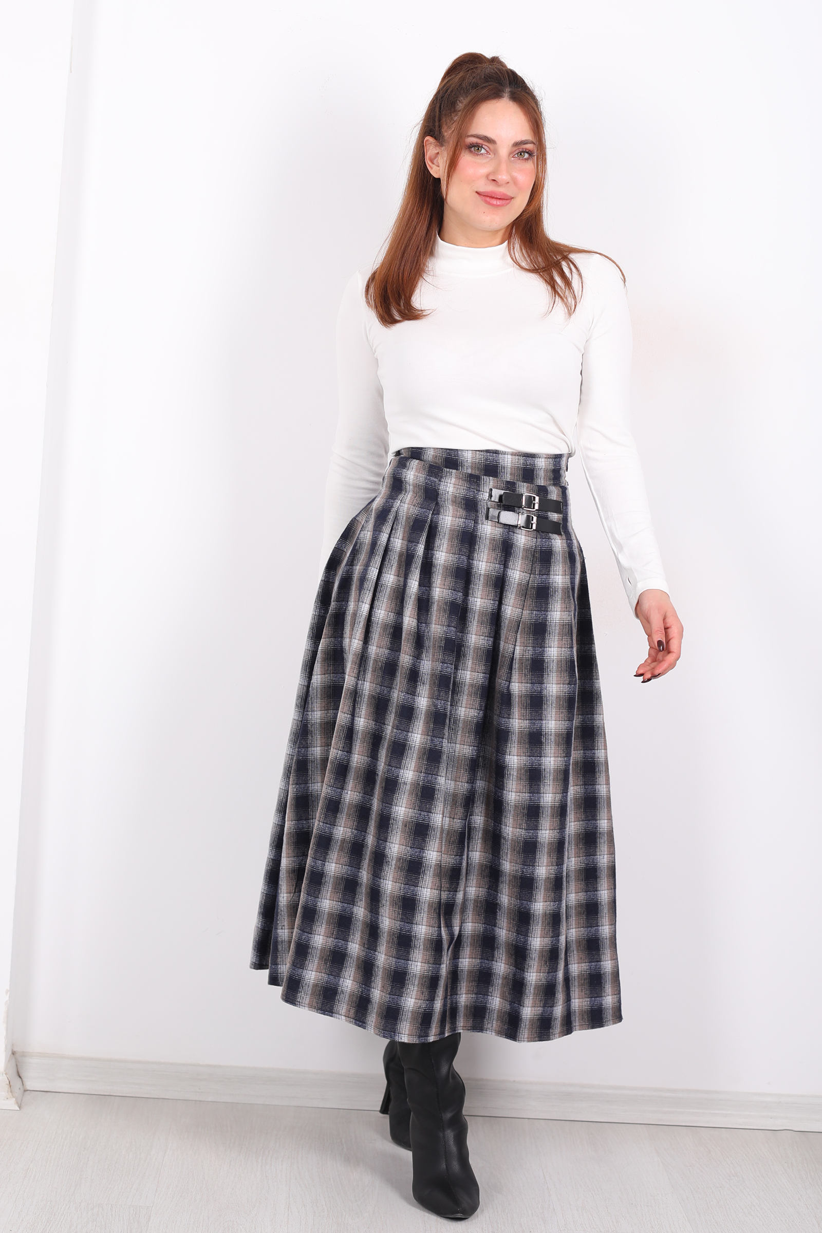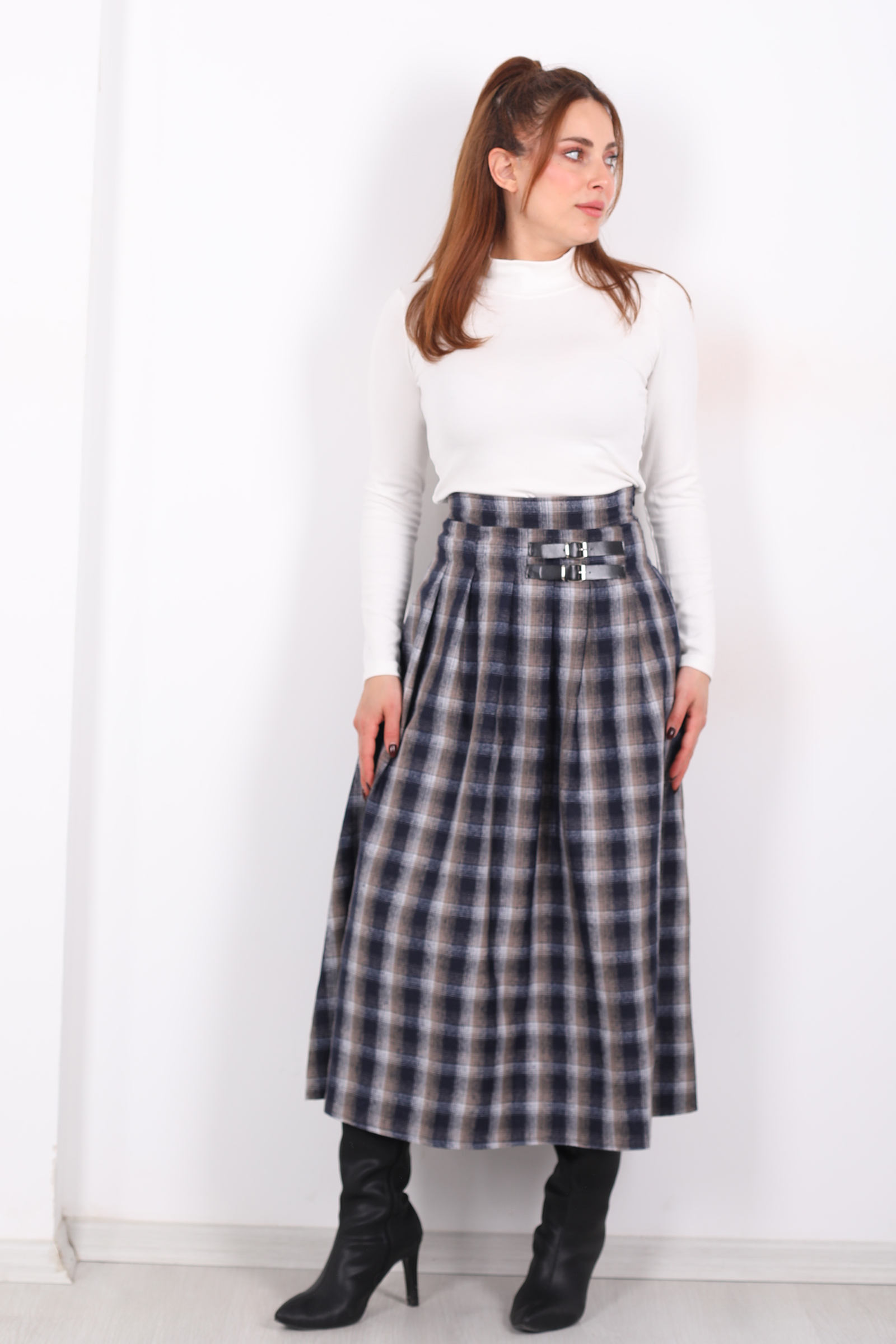 Klasik kalıpların dışına çıkan, antrasit griyi modern hikâye diliyle yorumlayan bu ekose etek, stiline yalnızca desen eklemekle kalmaz; hareket eden bir duruş sunar. Ekoselerin geometrik düzeni, yüzeyde bir desen olmaktan çıkarak grafik bir ritim elde eder her adımında hafifçe dalgalanan bu çizgiler, sade bir görünüme enerji katar.