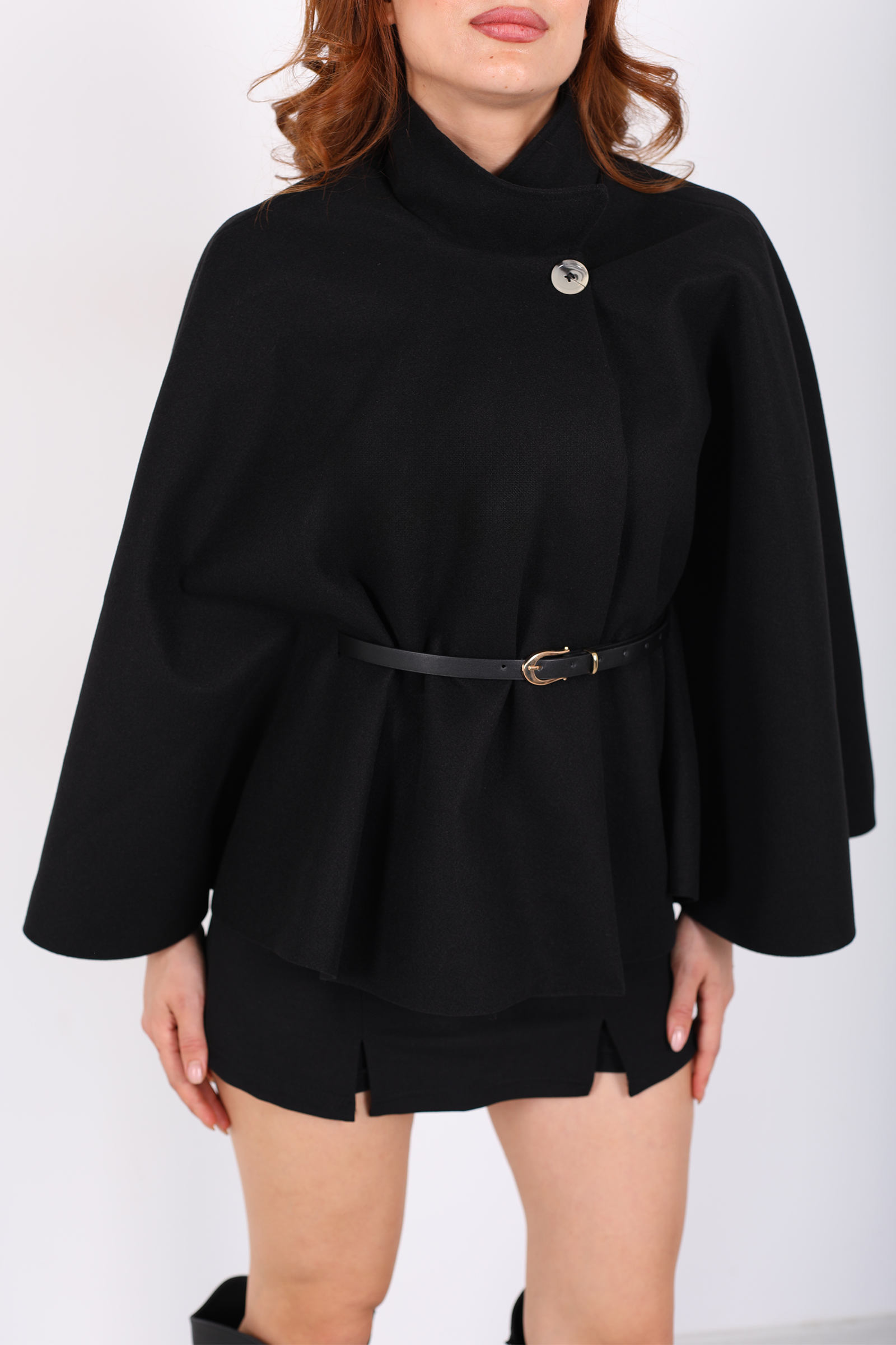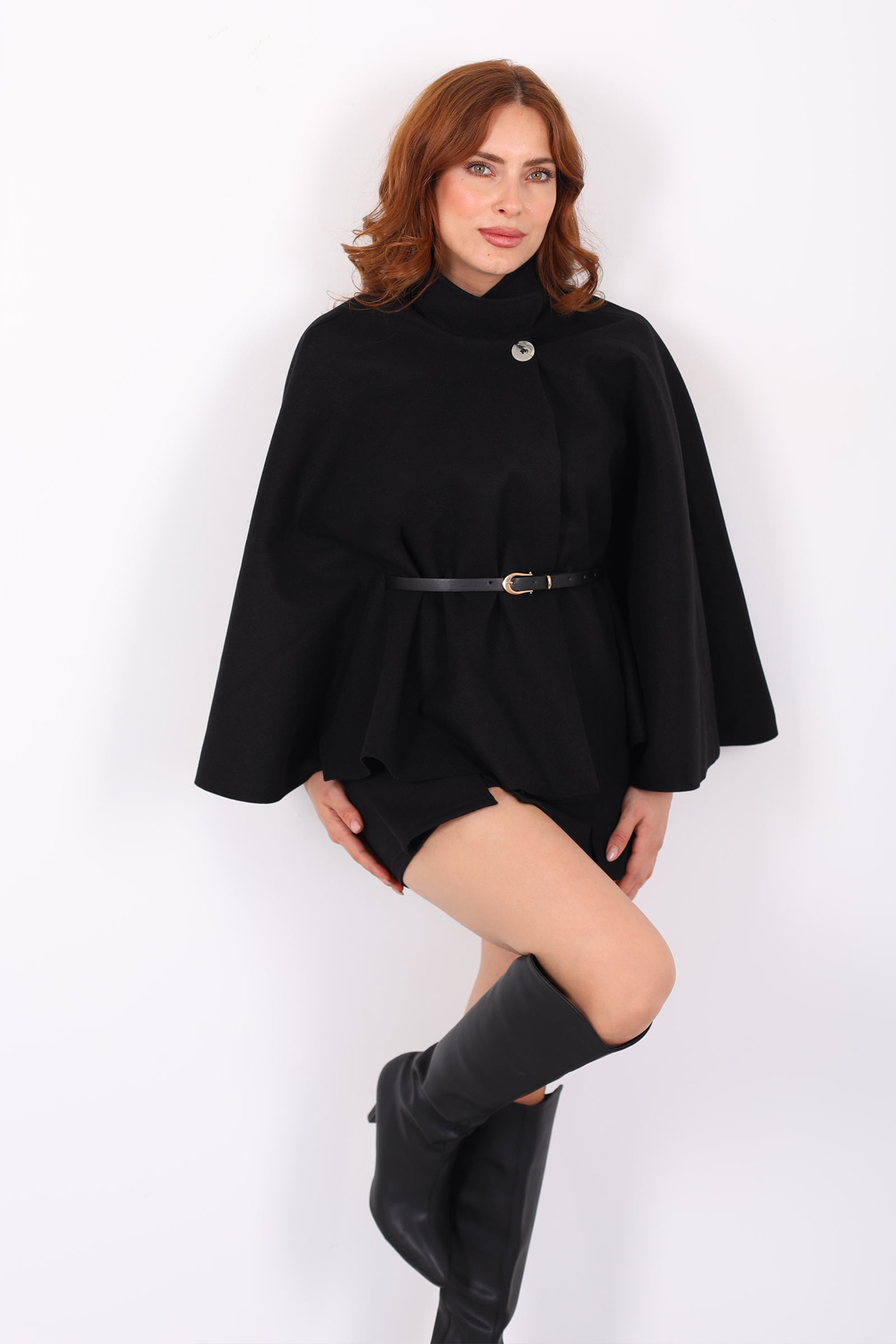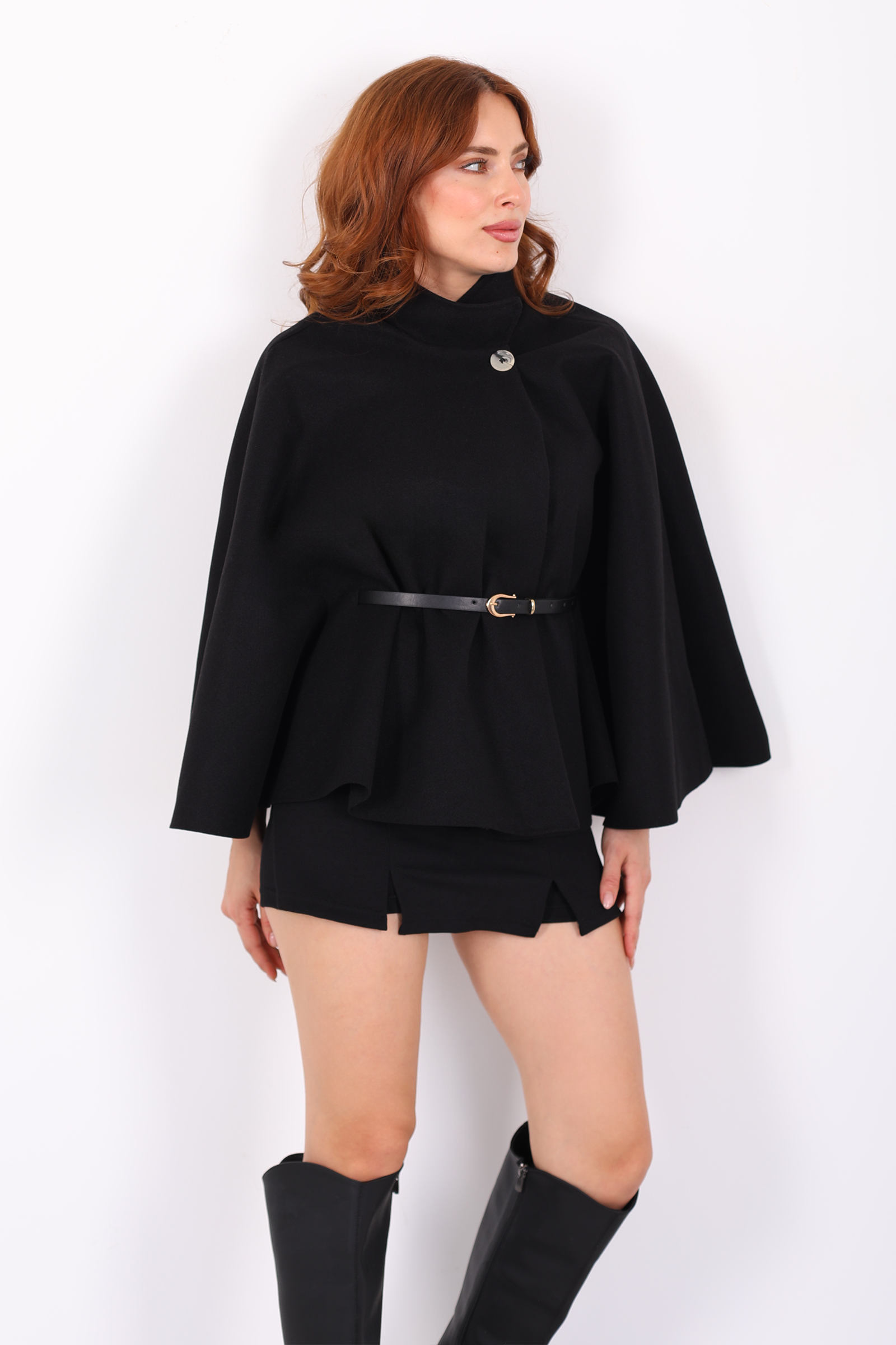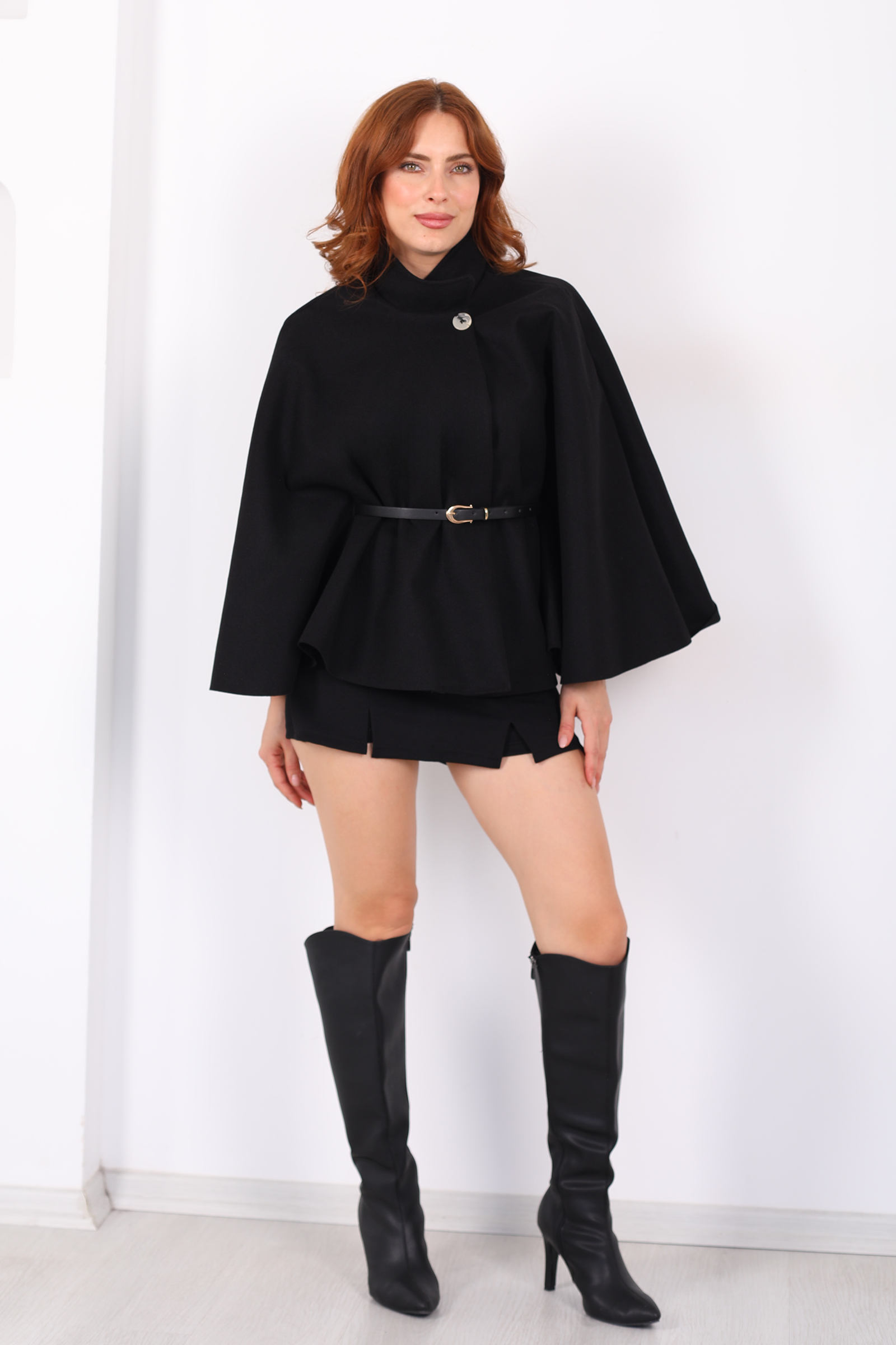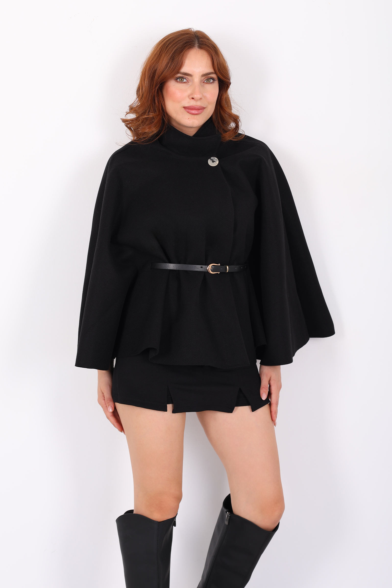 Kaşe Kemerli Kadın Siyah Panço