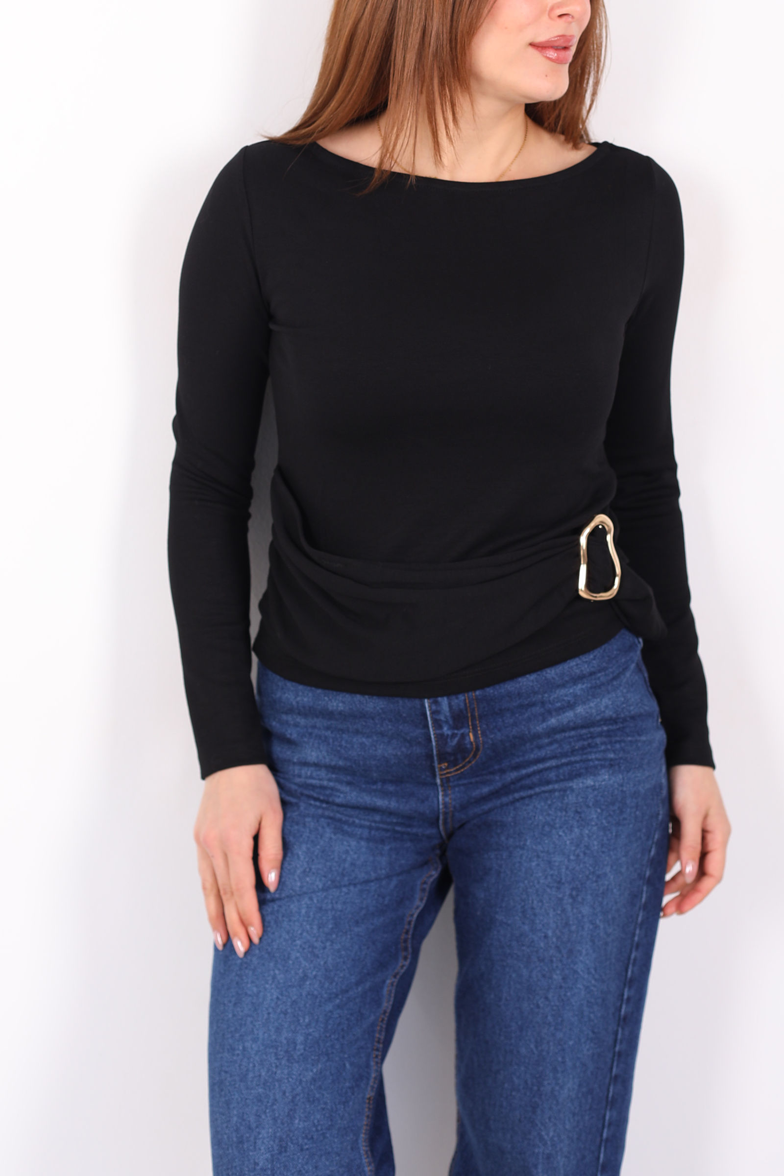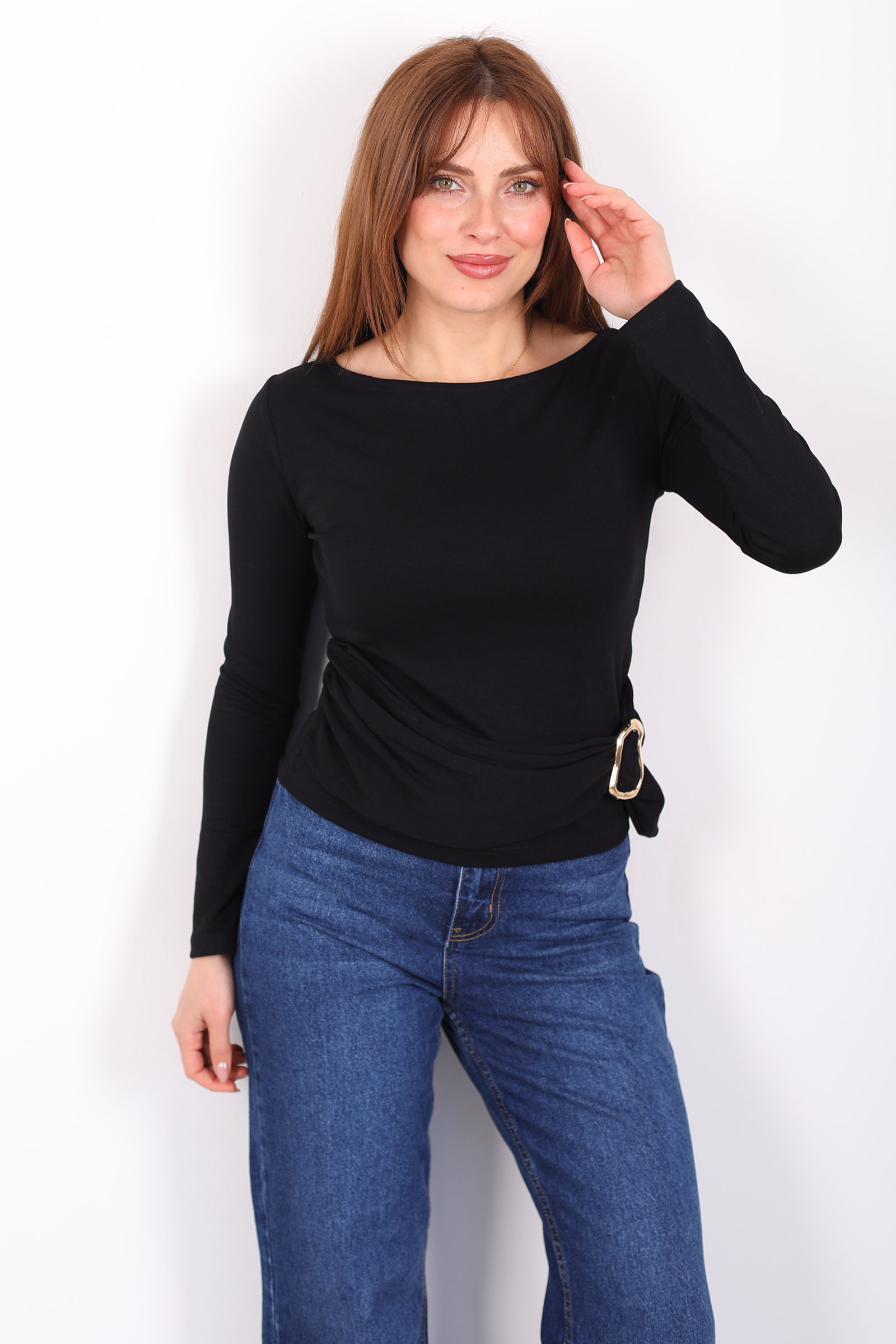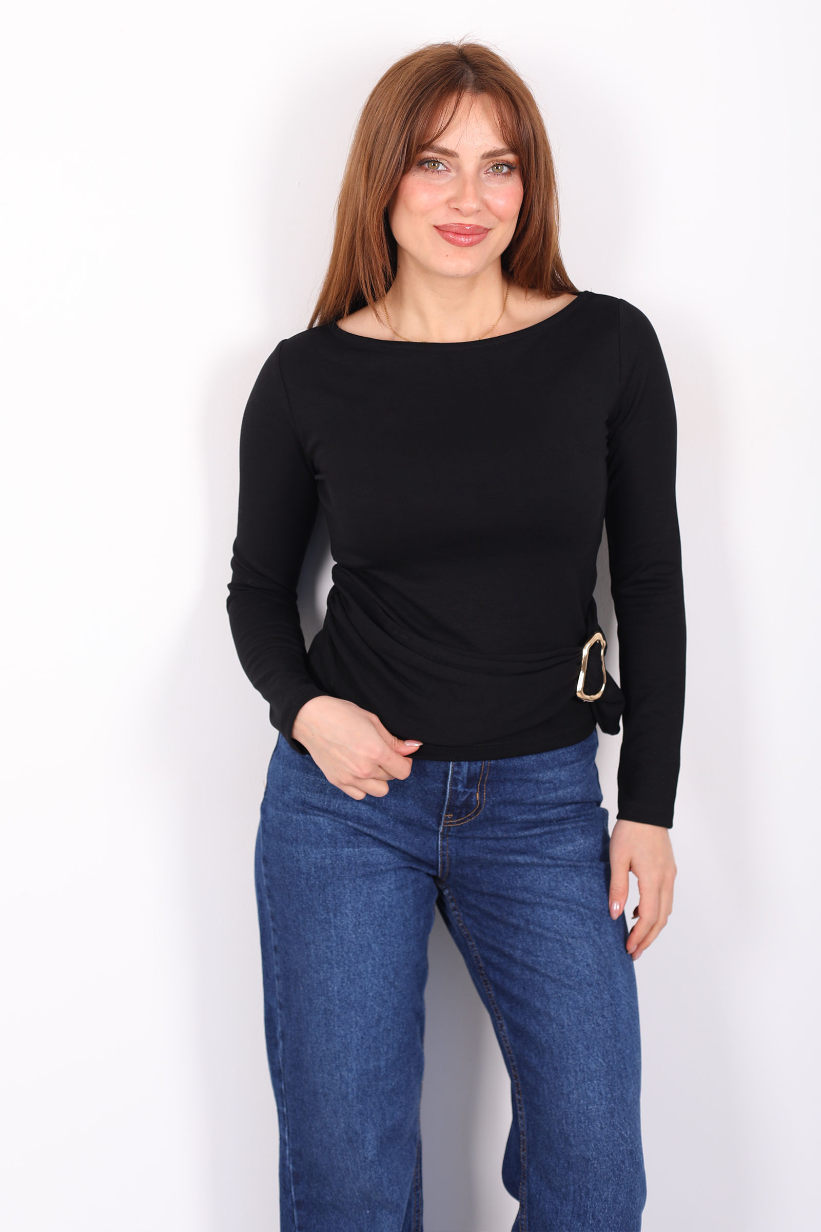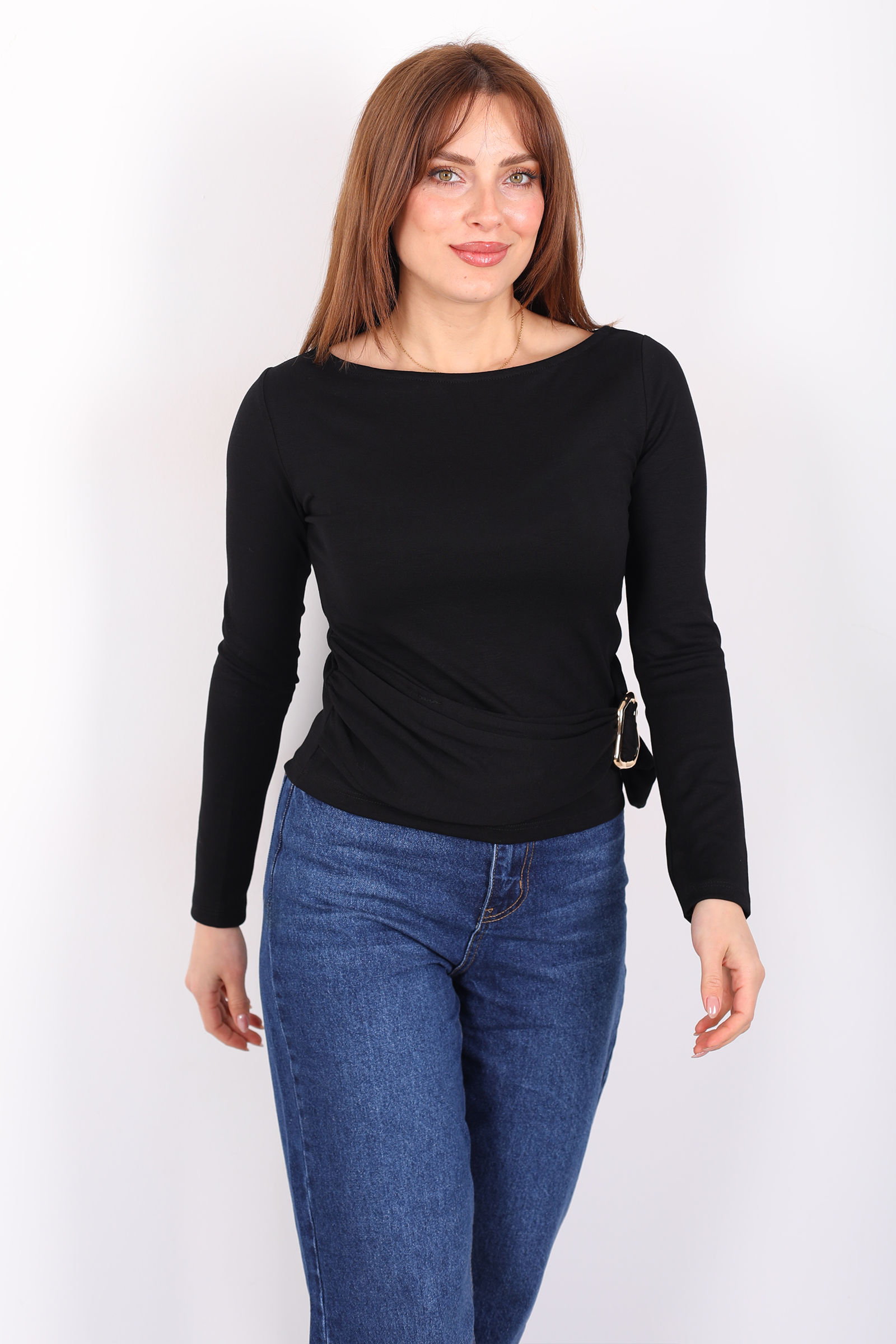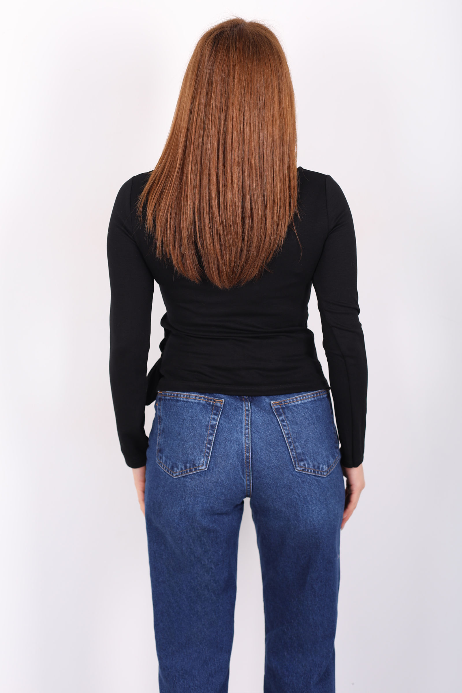 Siyah kayık yaka bluz, zarif aksesuar detayları ve modern tasarımıyla her ortamda şık bir görünüm sunar. Kayık yaka kesimi boyun hattını nazikçe çerçevelerken, vücuda oturan yapısı zarif ve feminen bir siluet oluşturur. Bluzun üzerindeki aksesuar detayları ise, sade tasarıma sofistike bir dokunuş katar. Yumuşak kumaşı ve şık duruşu sayesinde hem gündüz hem gece kombinlerinde rahatlıkla tercih edilebilir. Jean, kumaş pantolon ya da etekle kombinleyerek hem şık hem rahat bir stil yakalayabilirsiniz. Siyahın klasik ve zamansız tonu, her ten rengine uyum sağlar ve her mevsim giyilebilir.