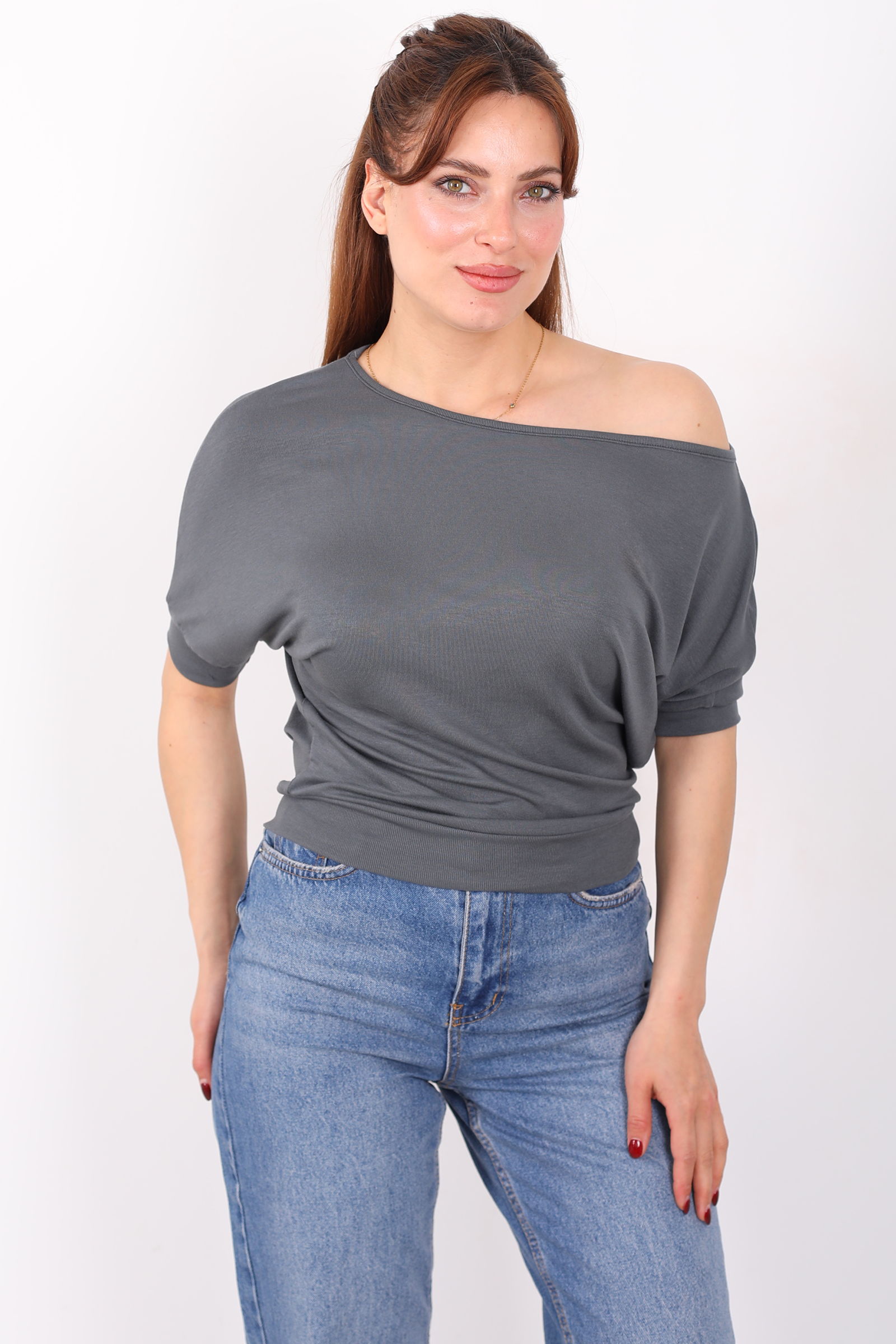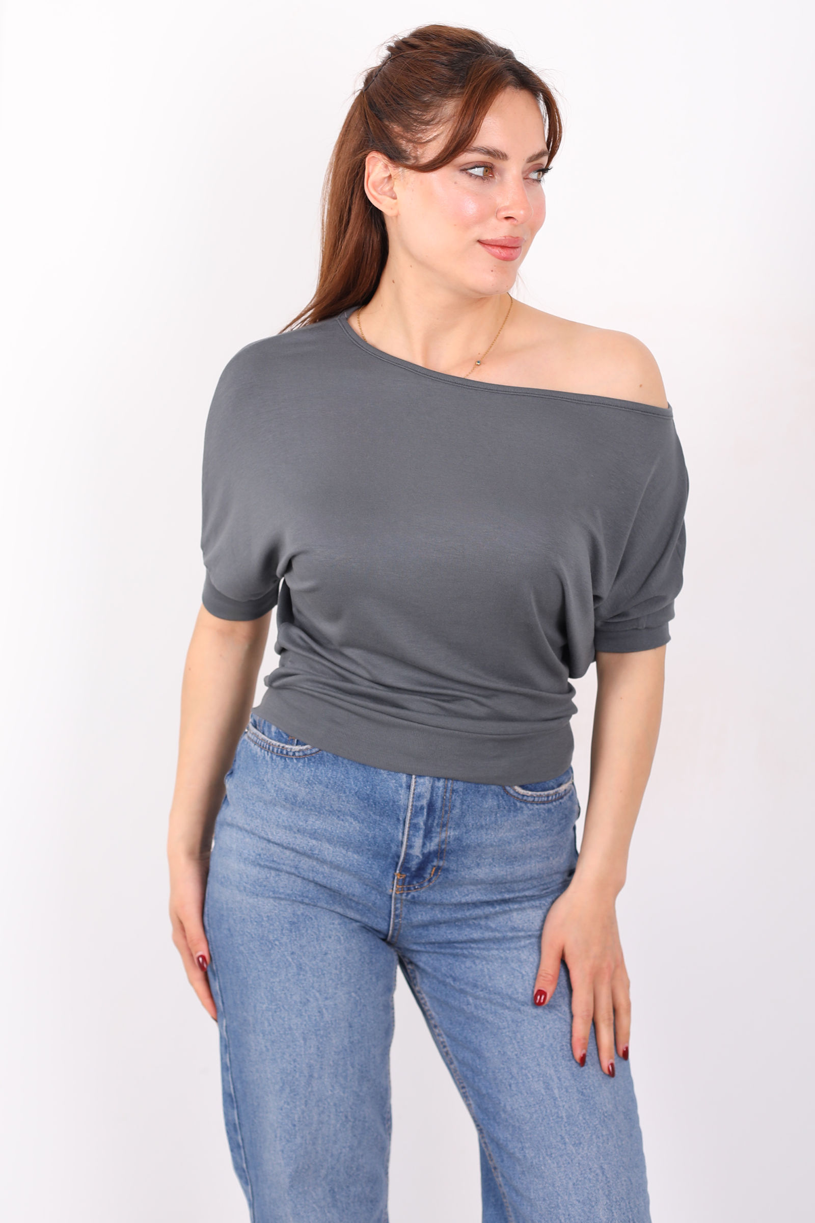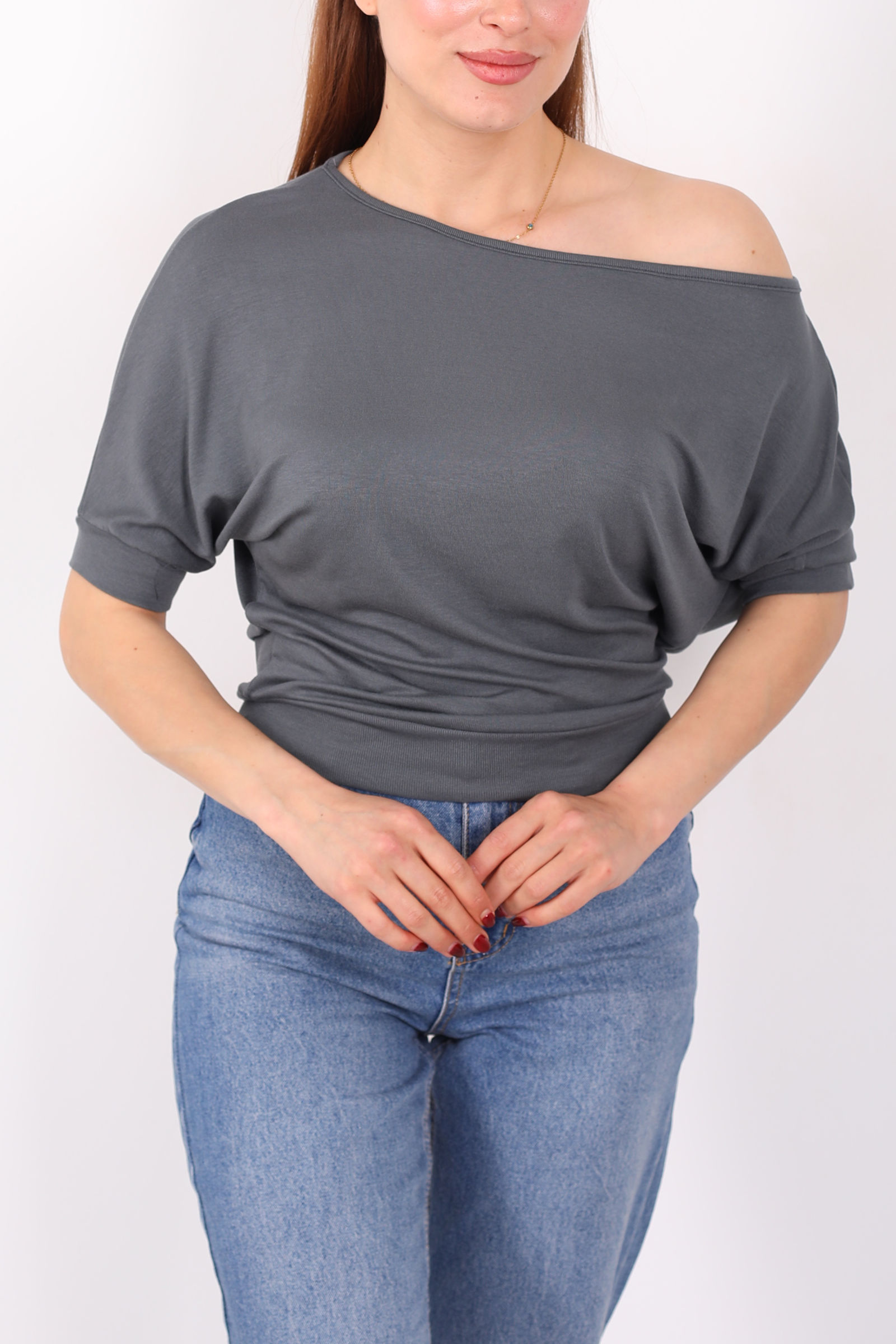 Kayık Yaka Beli Kemerli Yarasa Kol Antrasit Kadın Bluz
