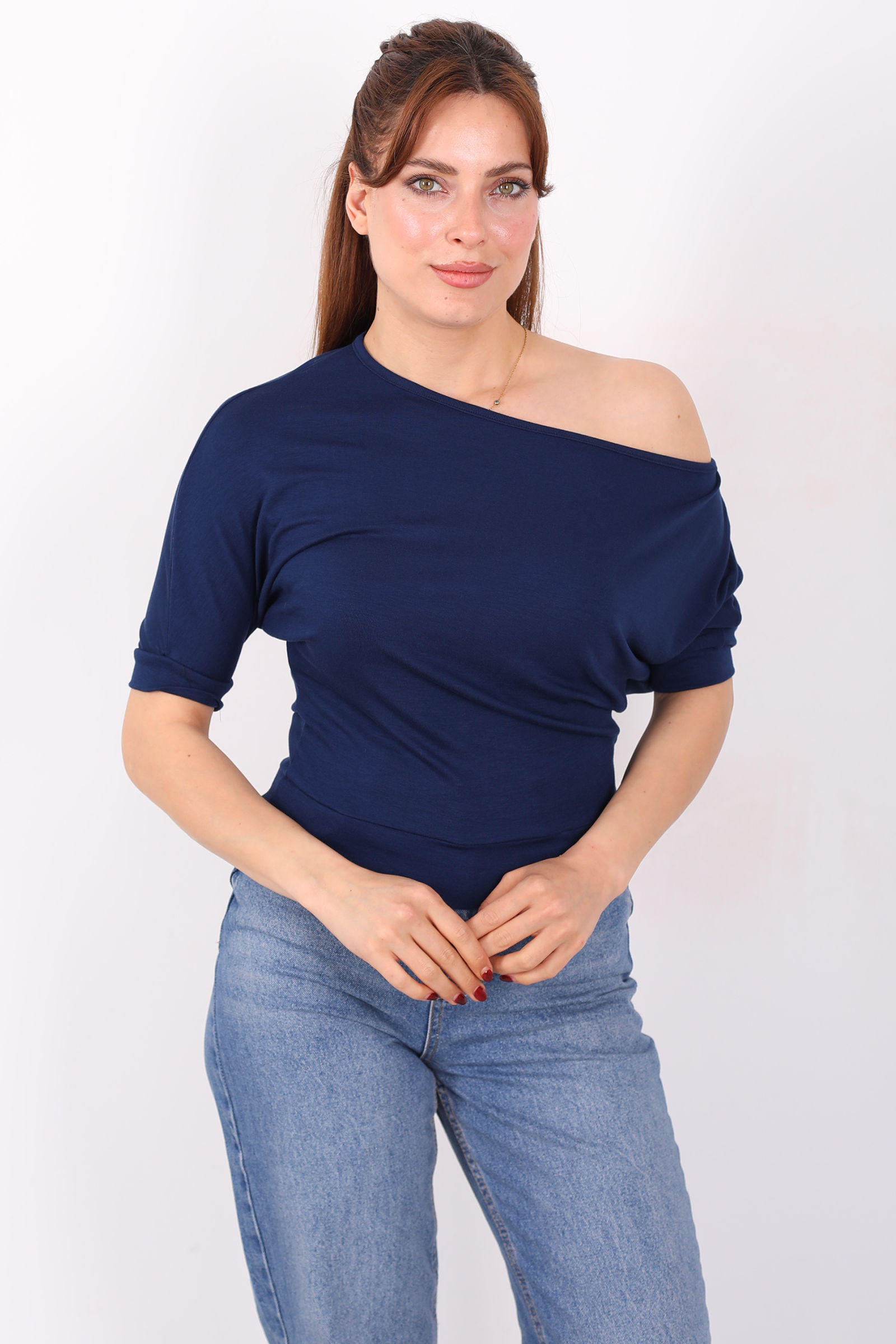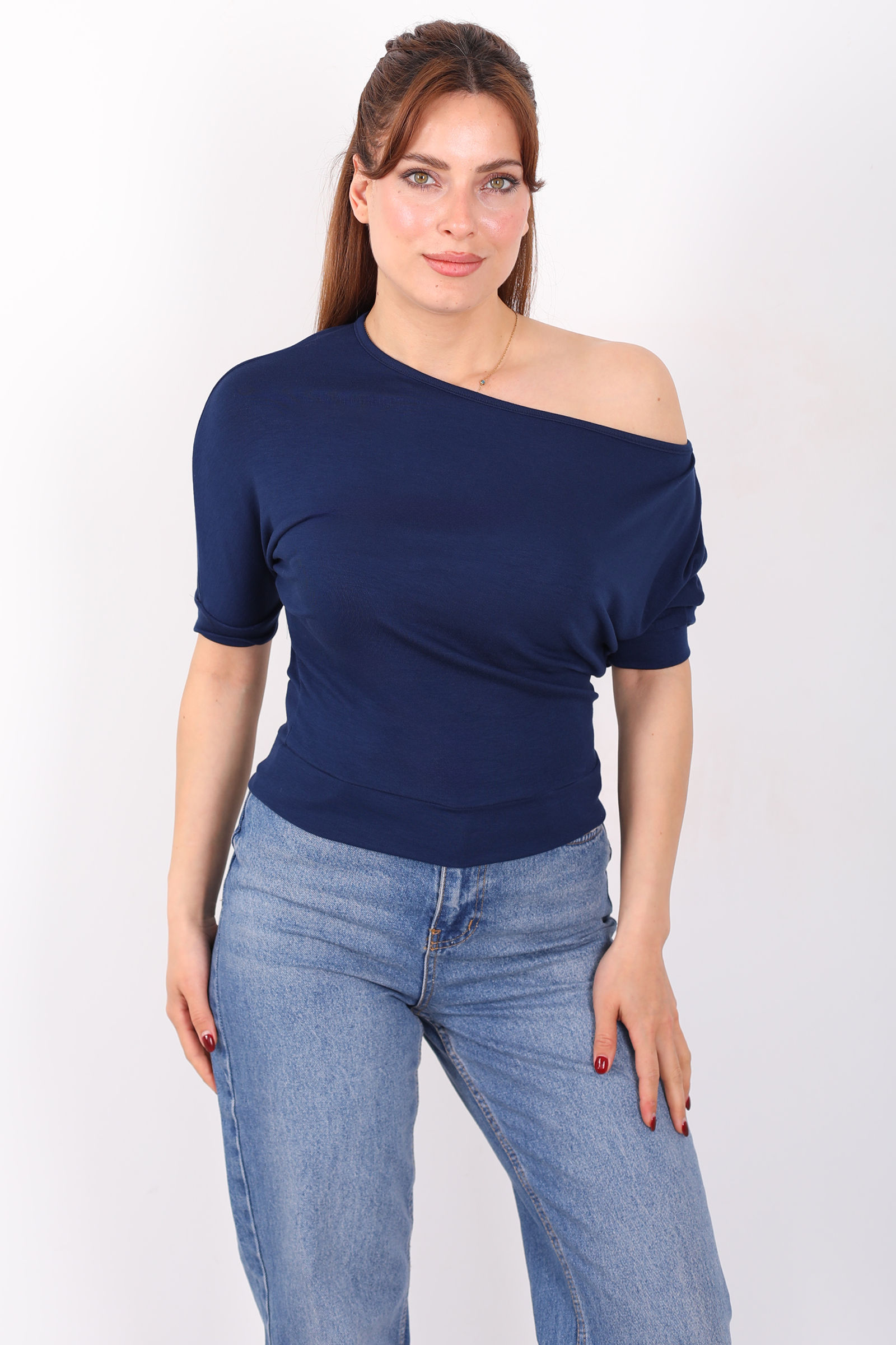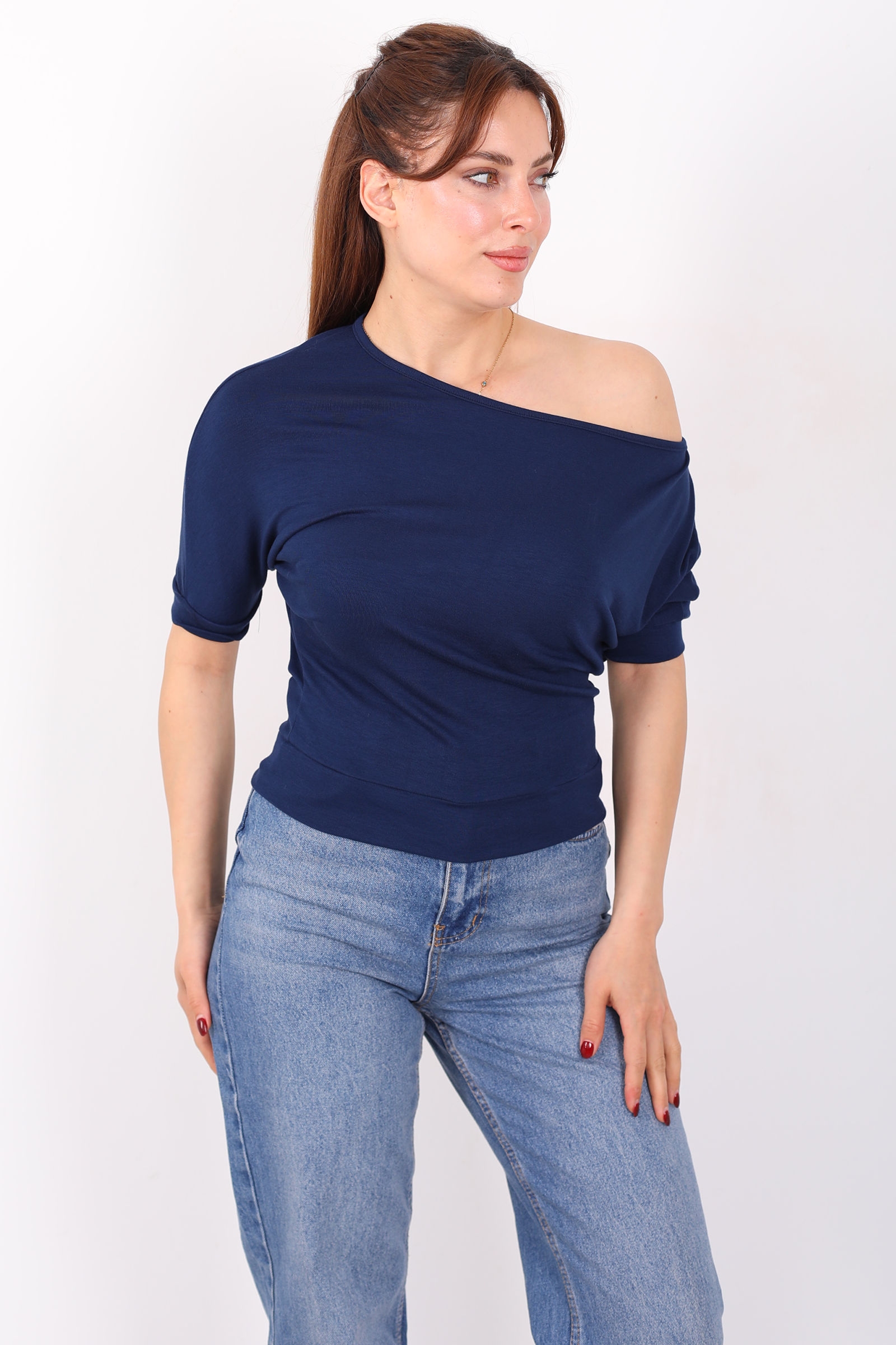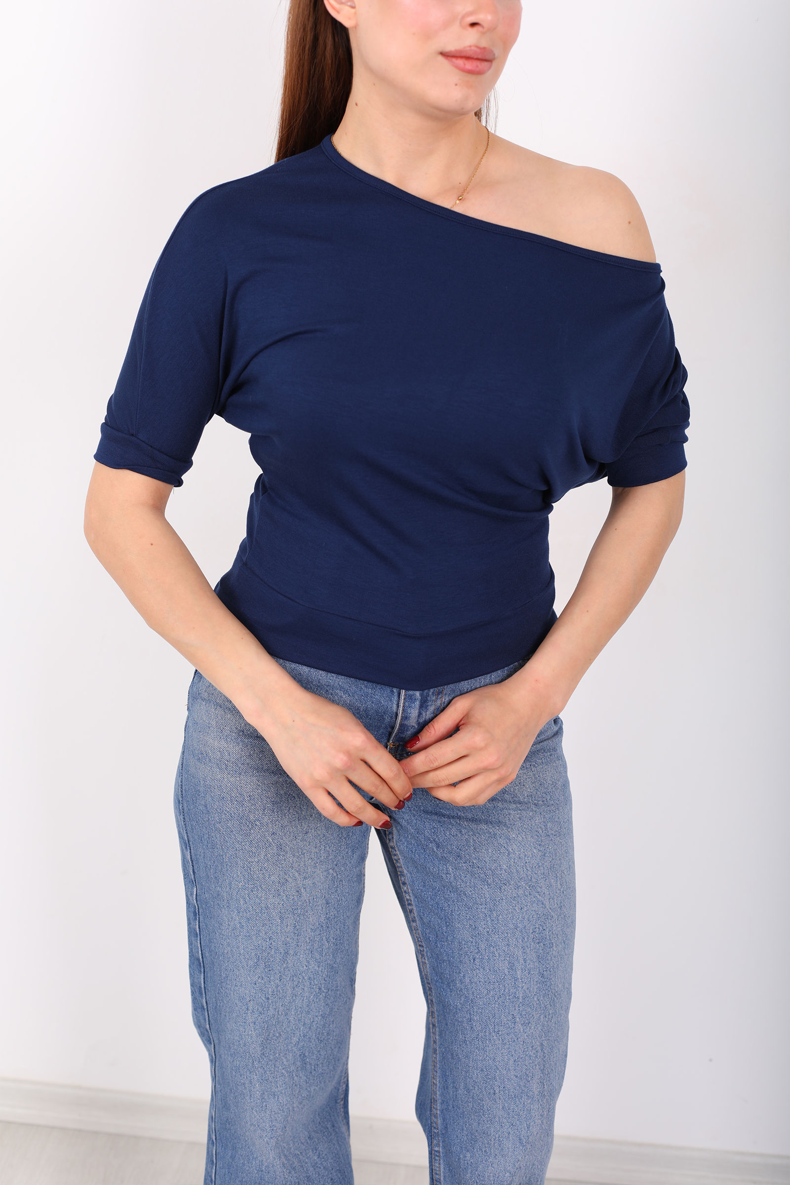 Kayık Yaka Beli Kemerli Yarasa Kol Lacivert Kadın Bluz