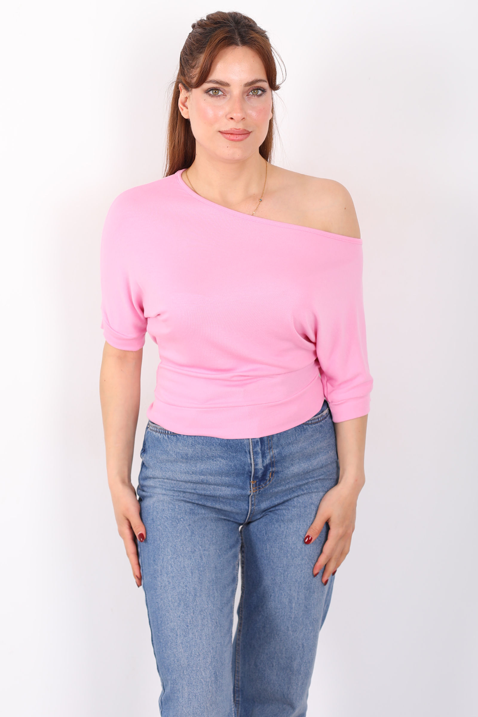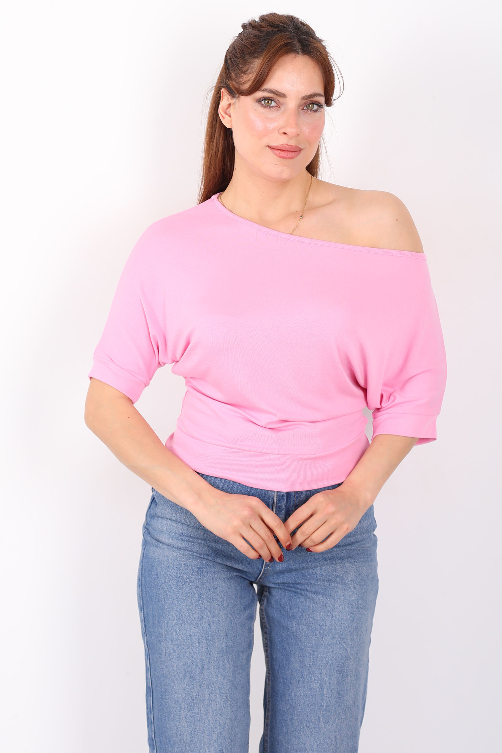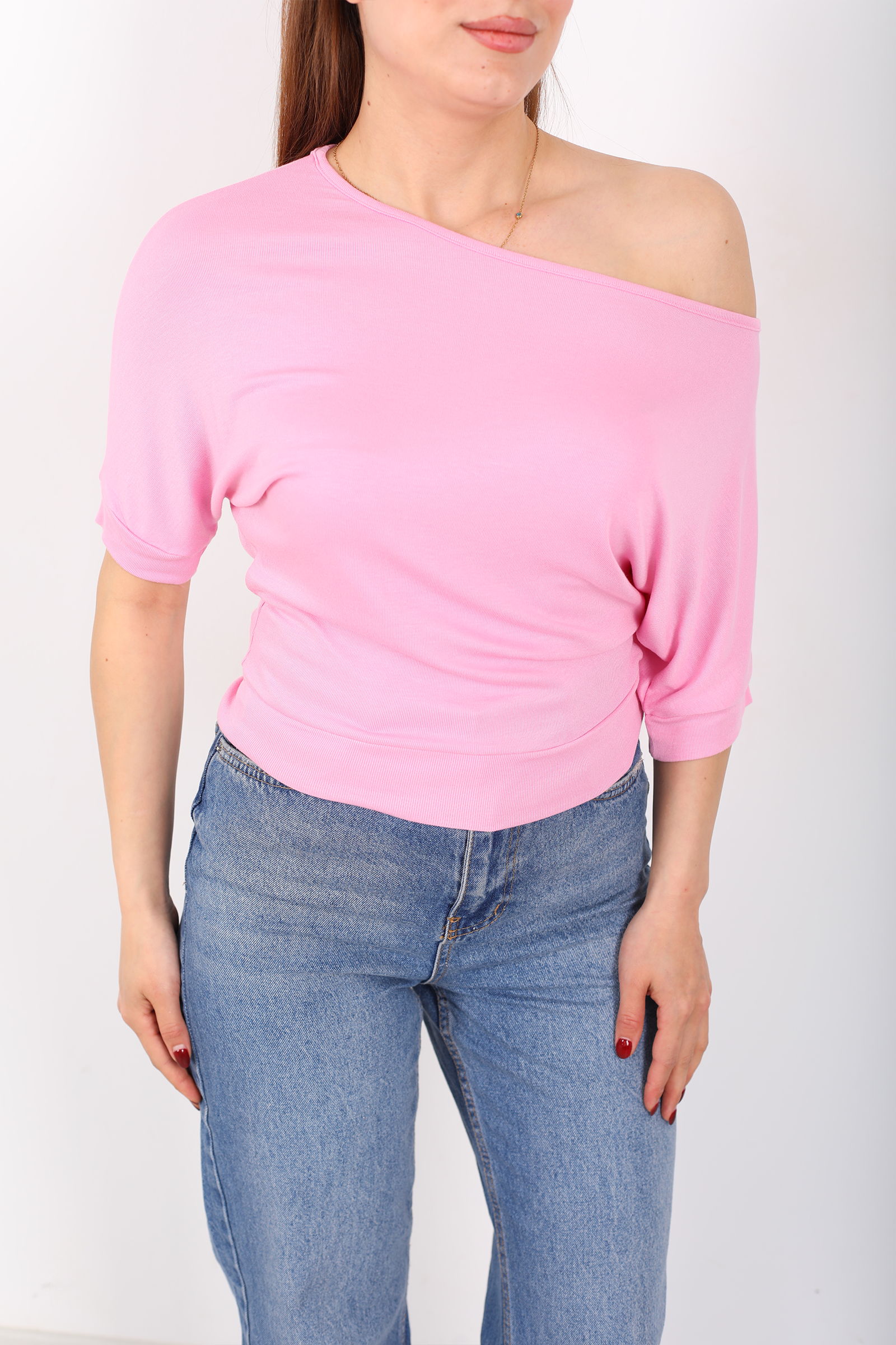 Kayık Yaka Beli Kemerli Yarasa Kol Pembe Kadın Bluz