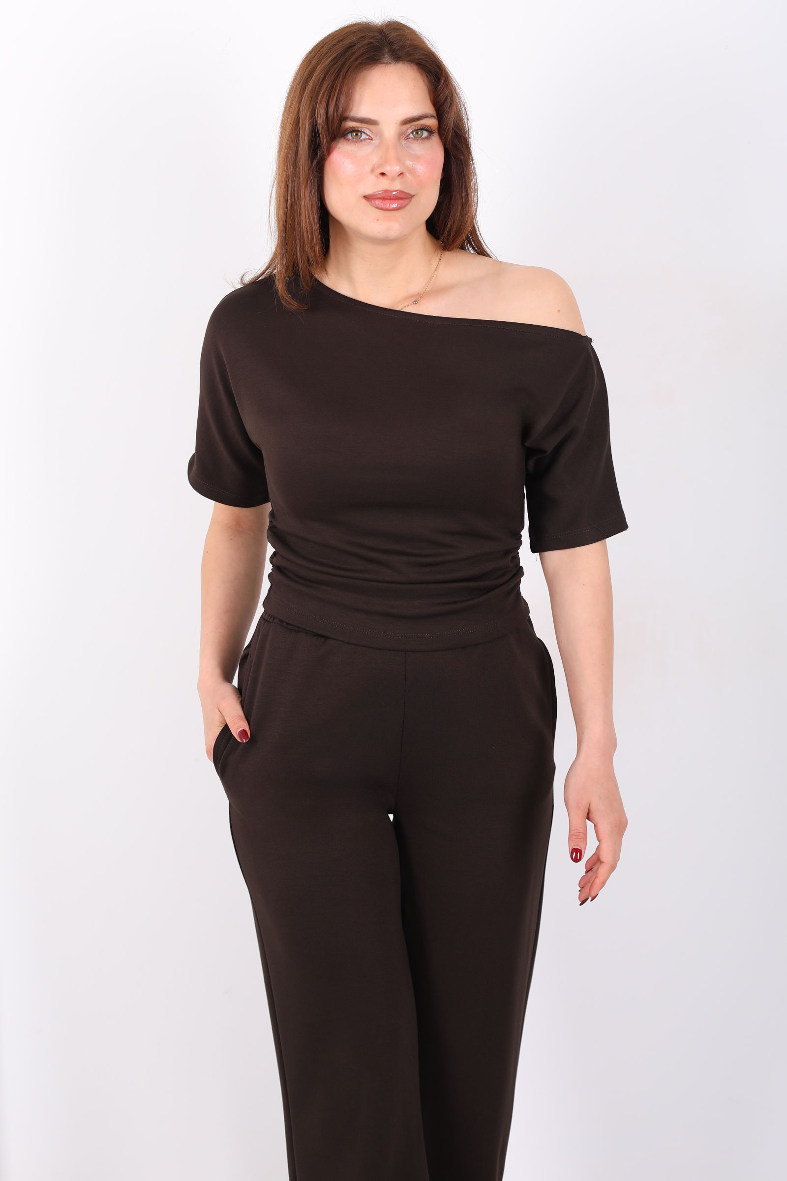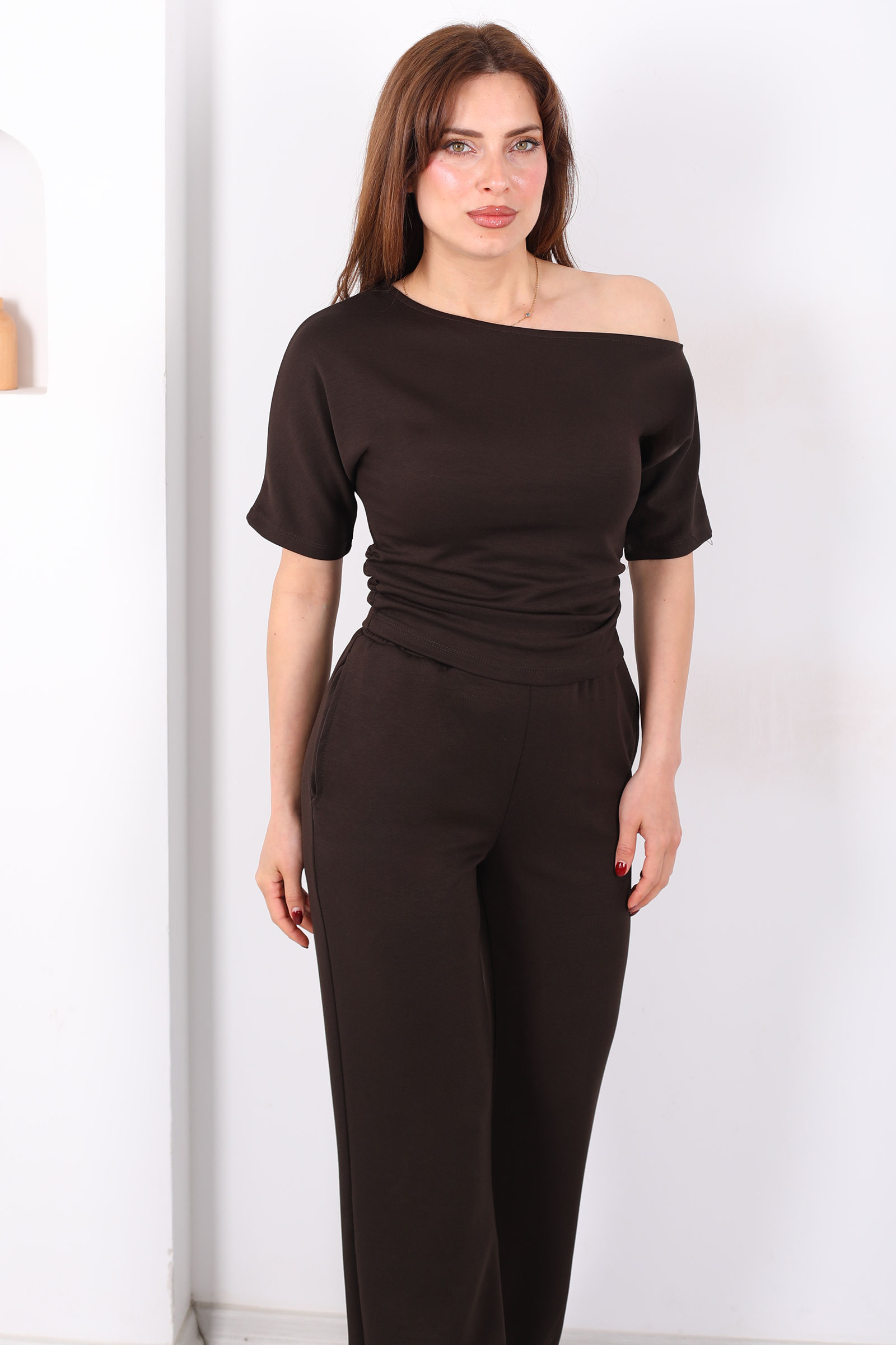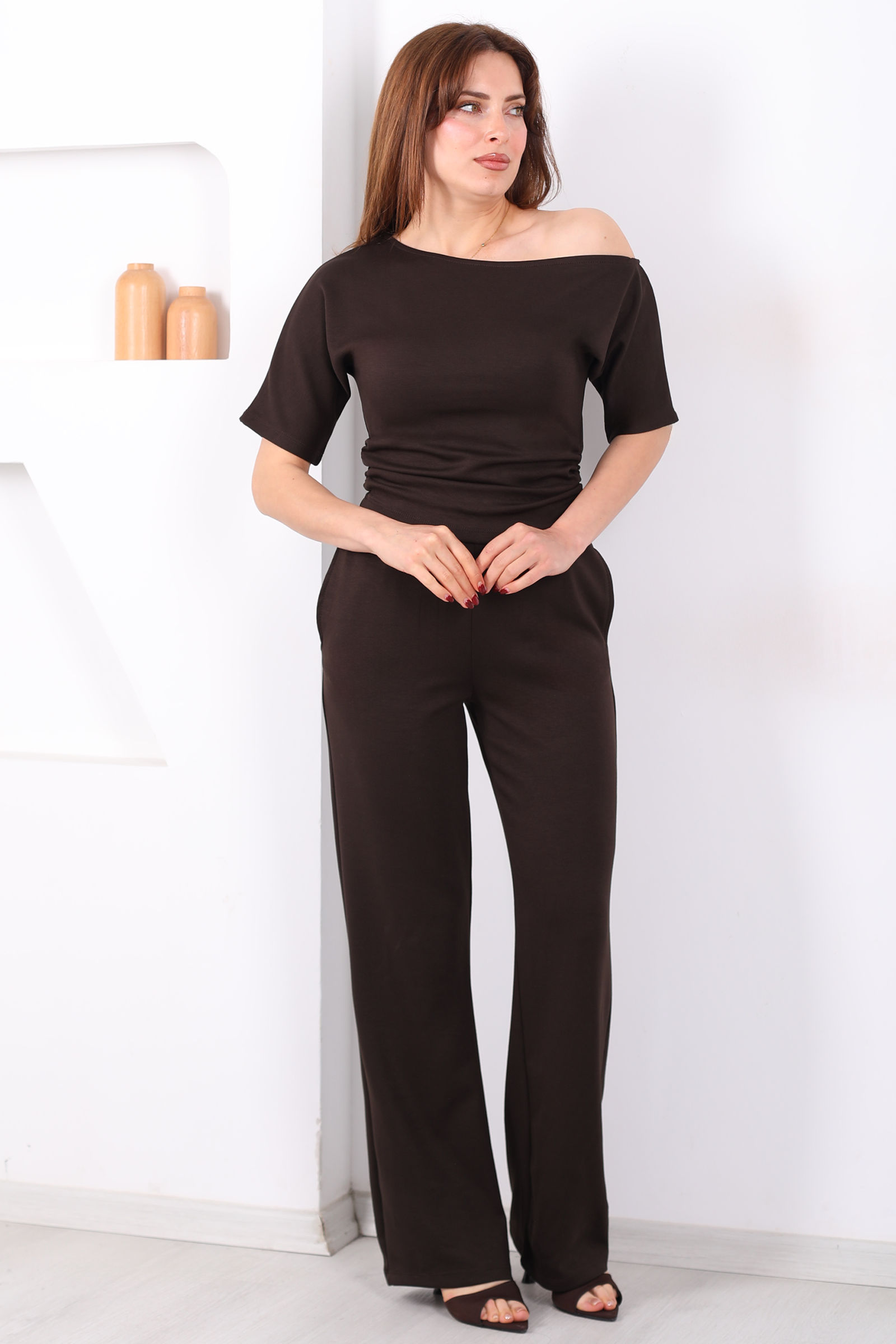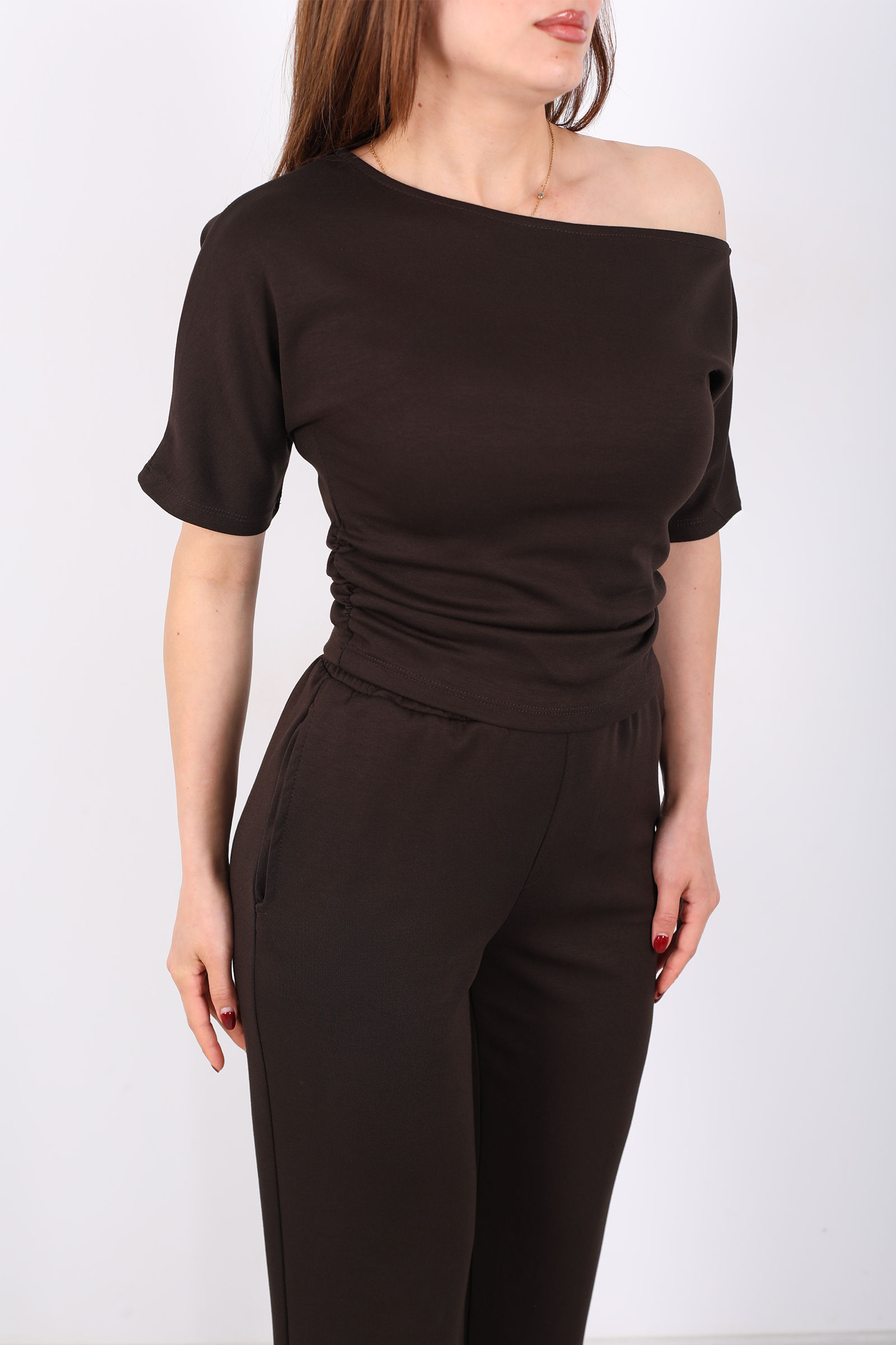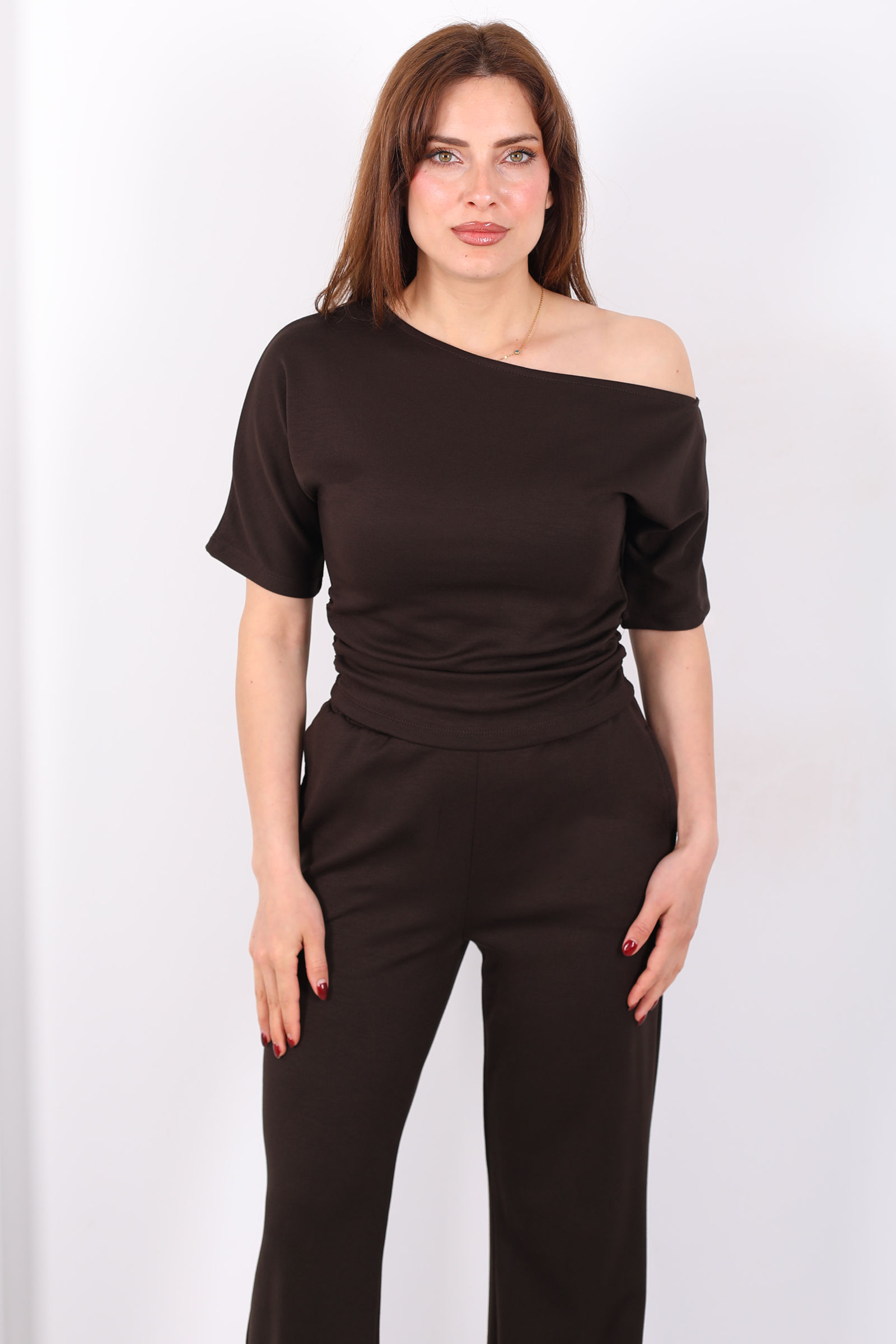 Kayık Yaka Drapeli Kadın Acı Kahve Modal Pantolon Takım