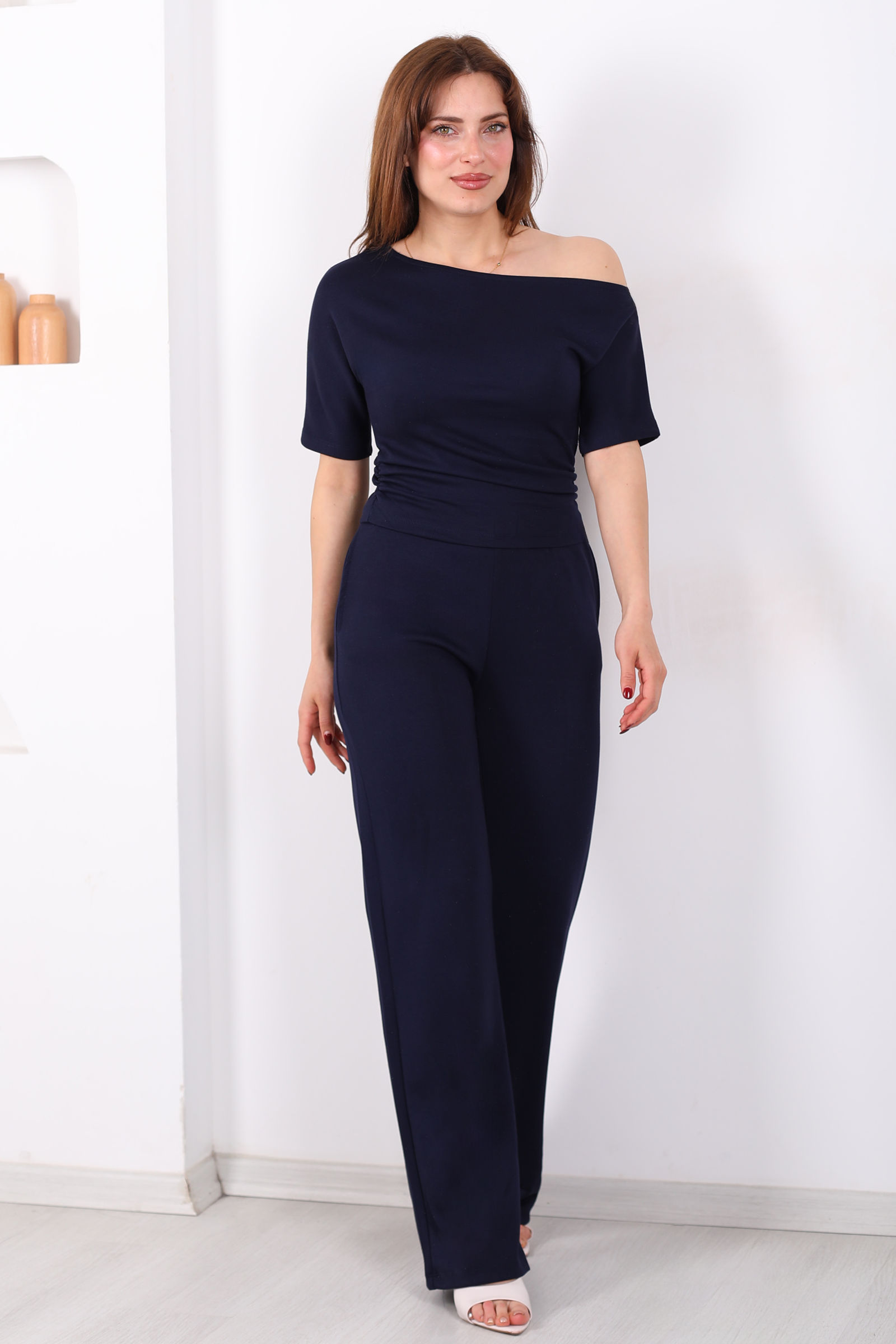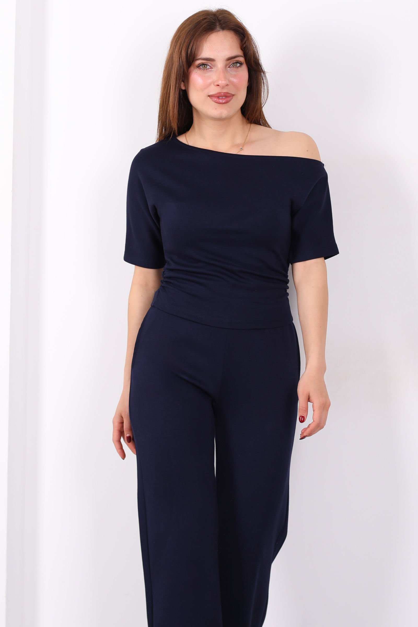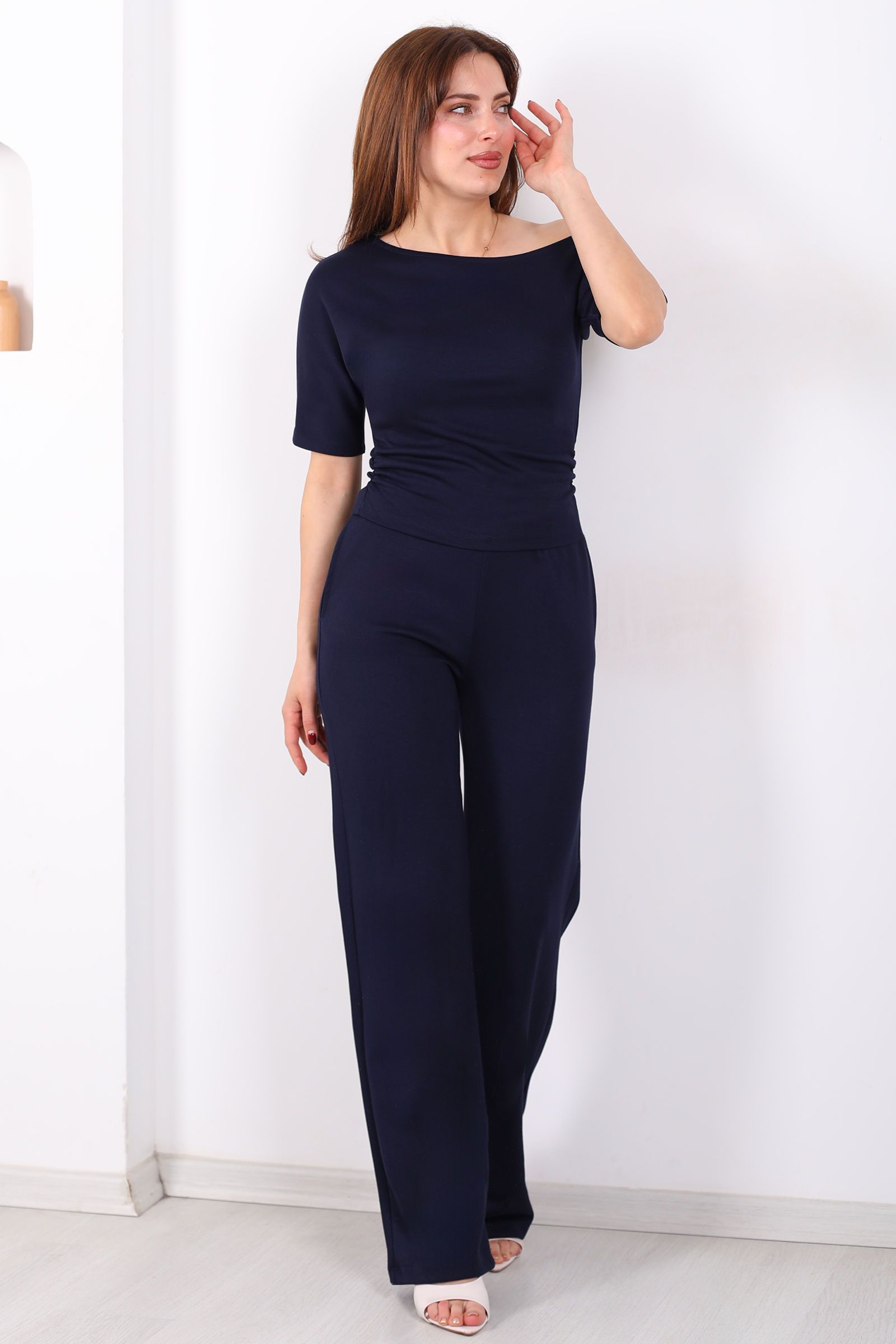 Kayık Yaka Drapeli Kadın Lacivert Modal Pantolon Takım