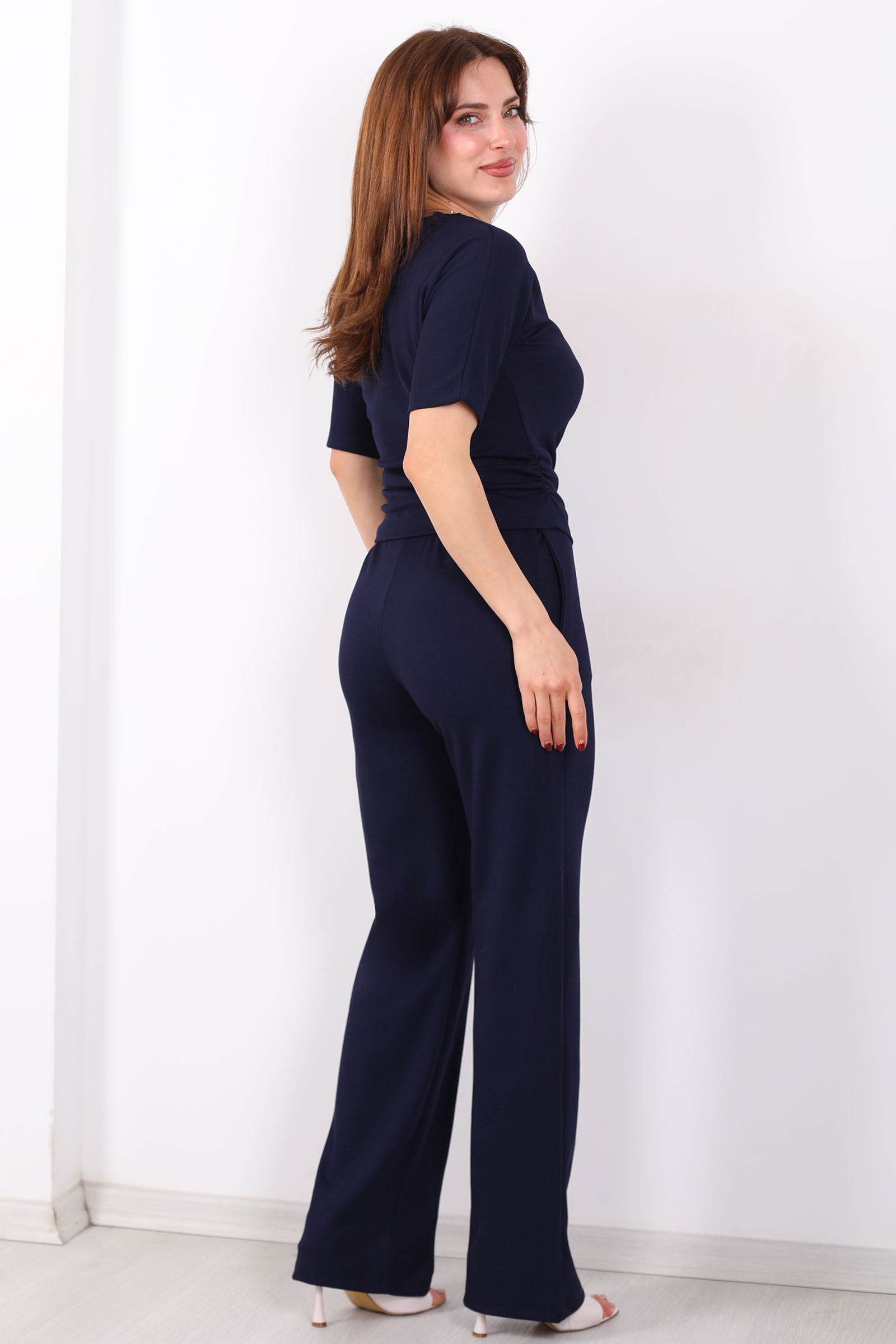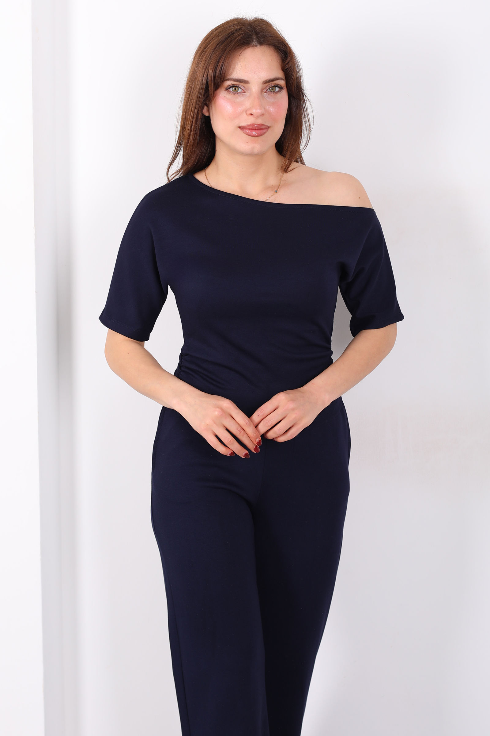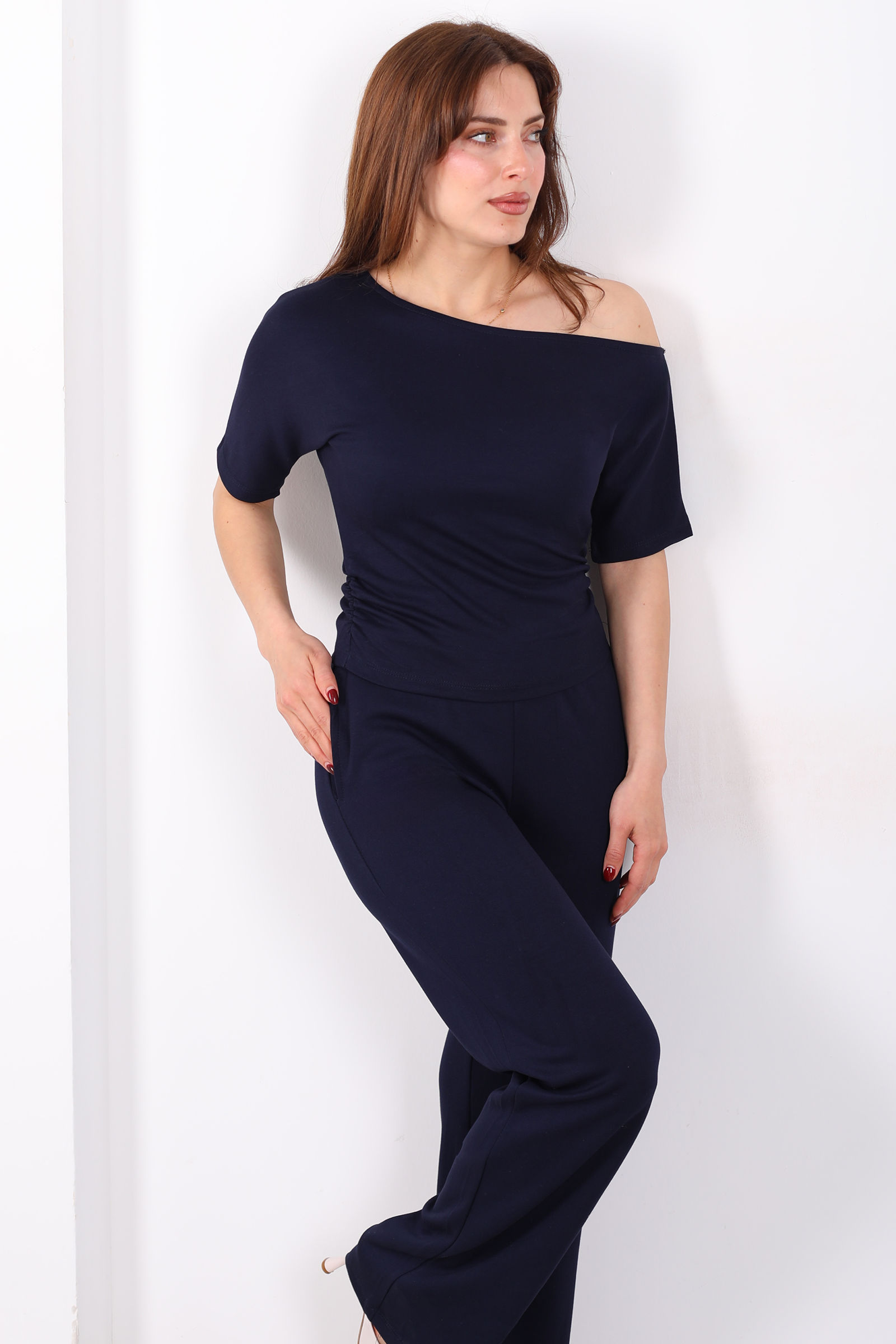 Kayık Yaka Drapeli Kadın Lacivert Modal Pantolon Takım
