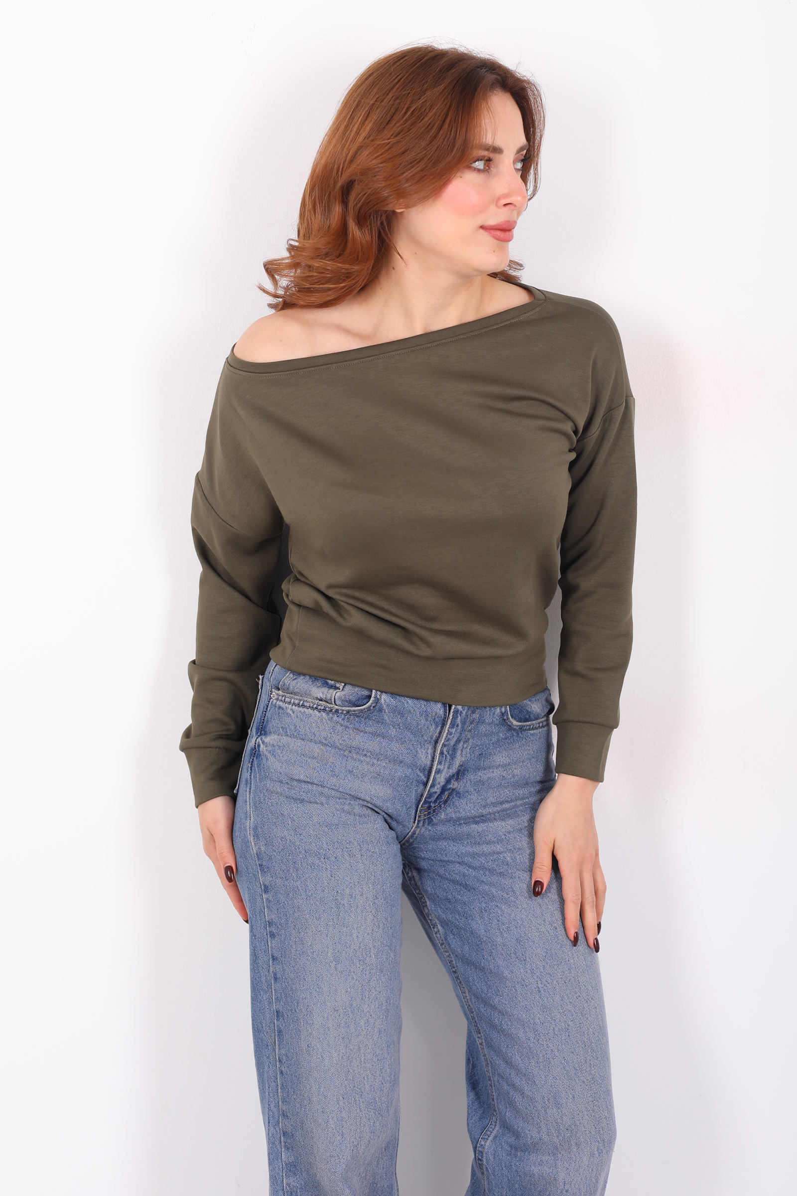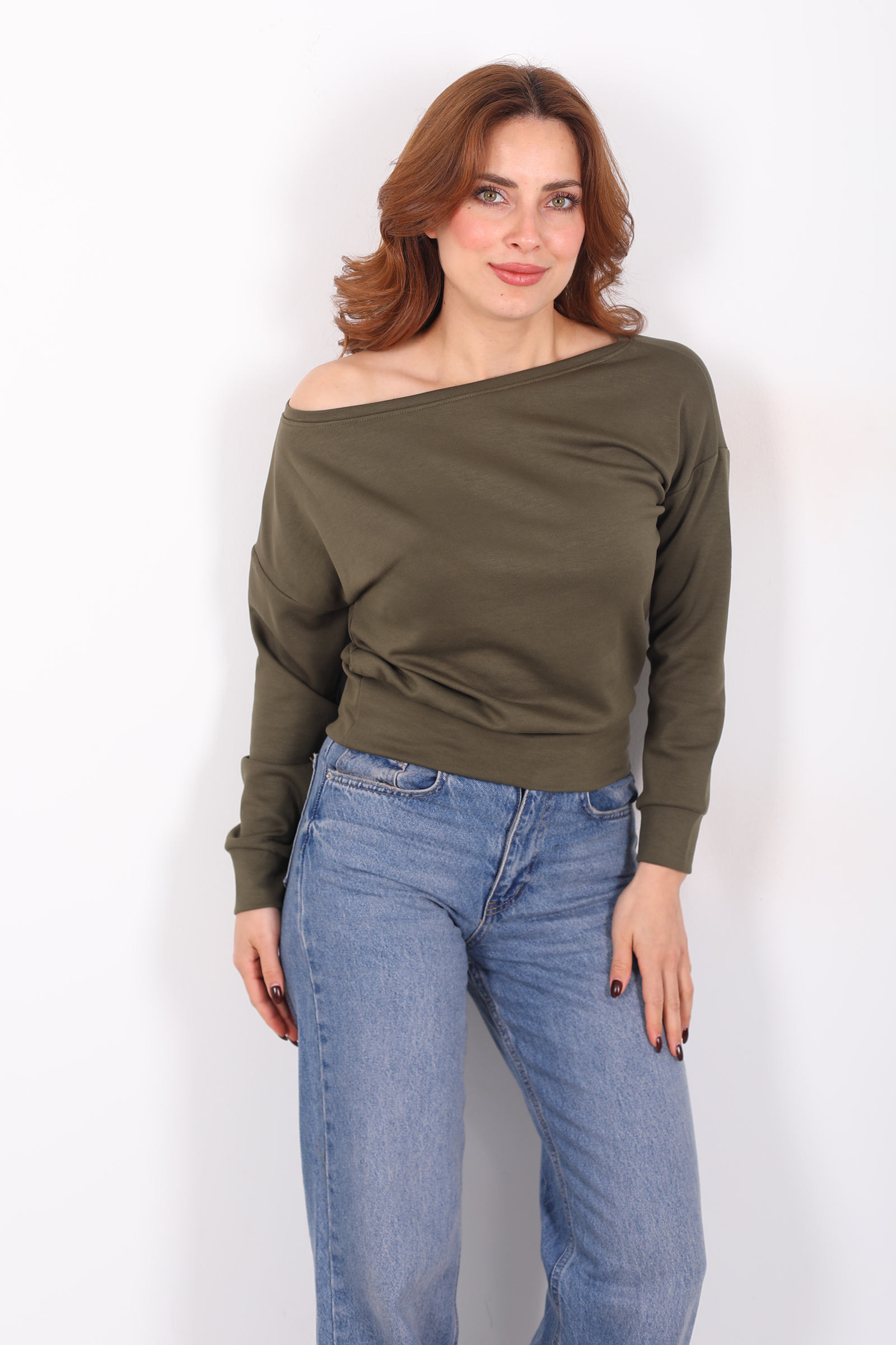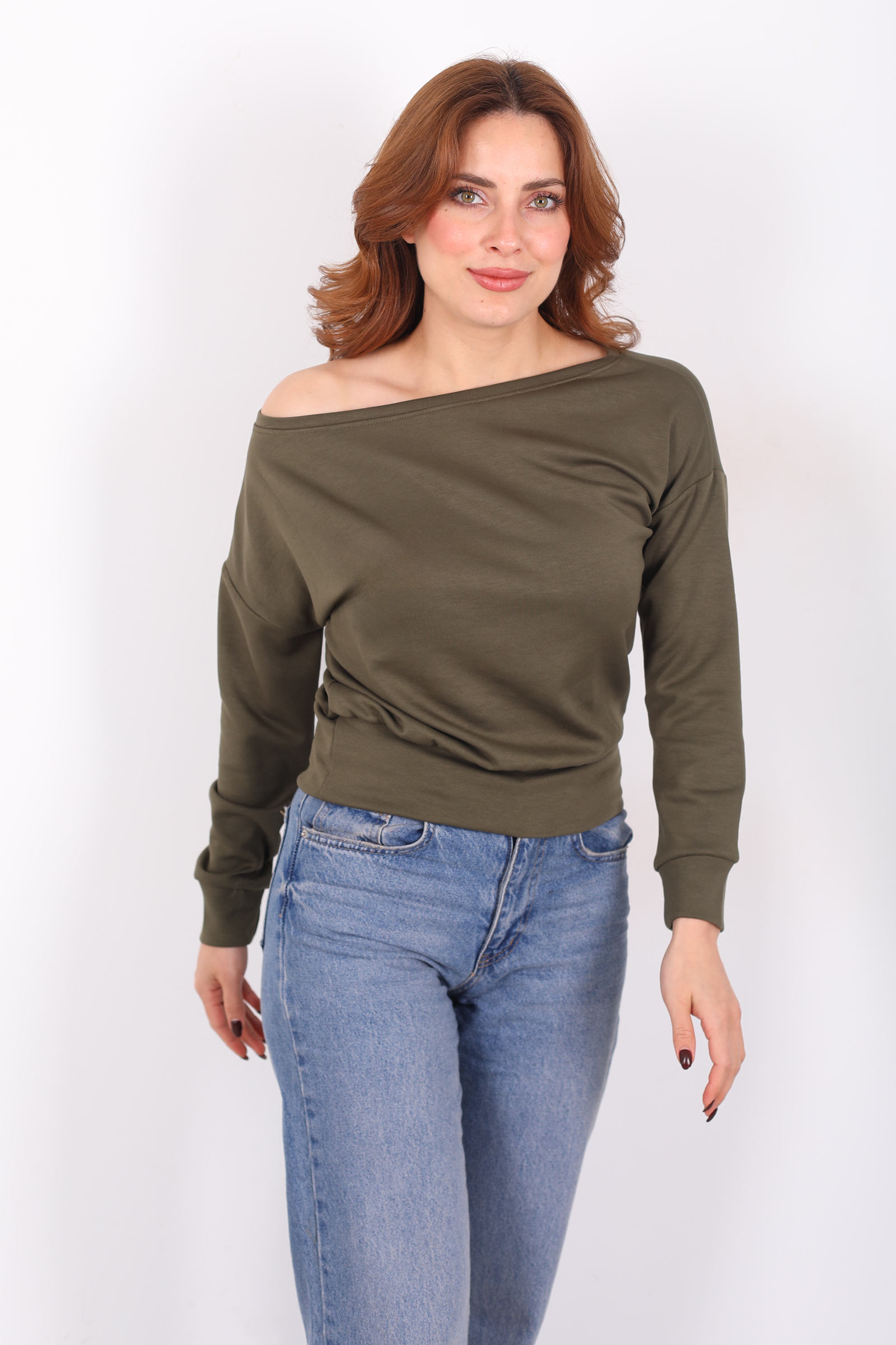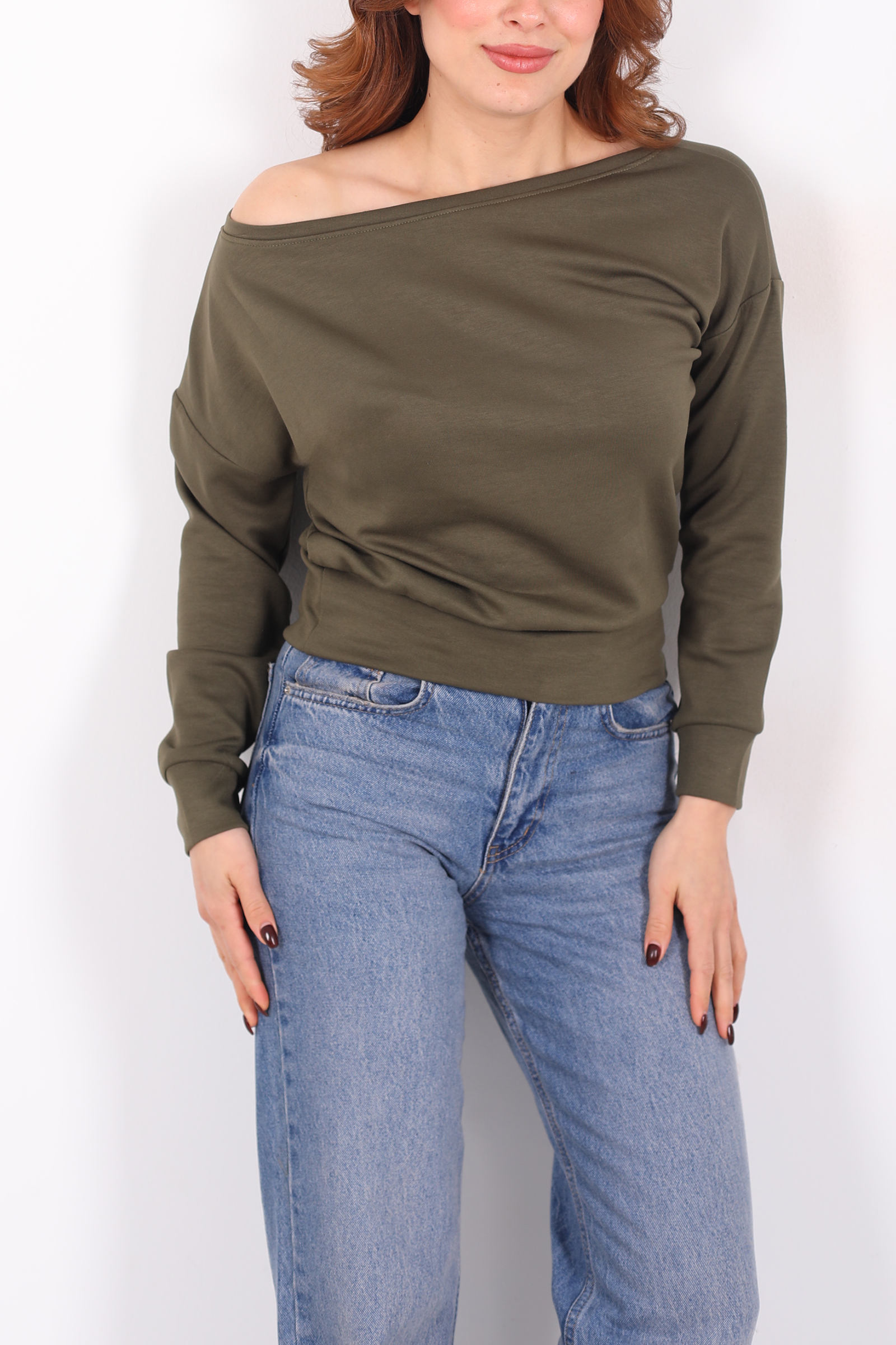 Gün ışığının sessiz tonlarını andıran haki renk, günlük stilinizde minimal ama etkileyici bir yön yaratır. Kayık yaka kesimi, omuz hattını doğal bir genişlikte gösterecek şekilde tasarlanmış; böylece bluz, sade çizgilere rağmen güçlü bir ifade sunar. Bu tasarım, hem şehir stiline hem de hafta sonu rahatına uyum sağlayacak şekilde modernize edildi.