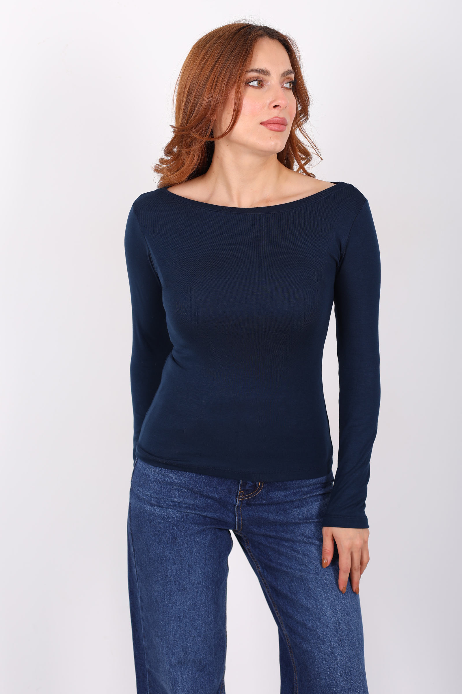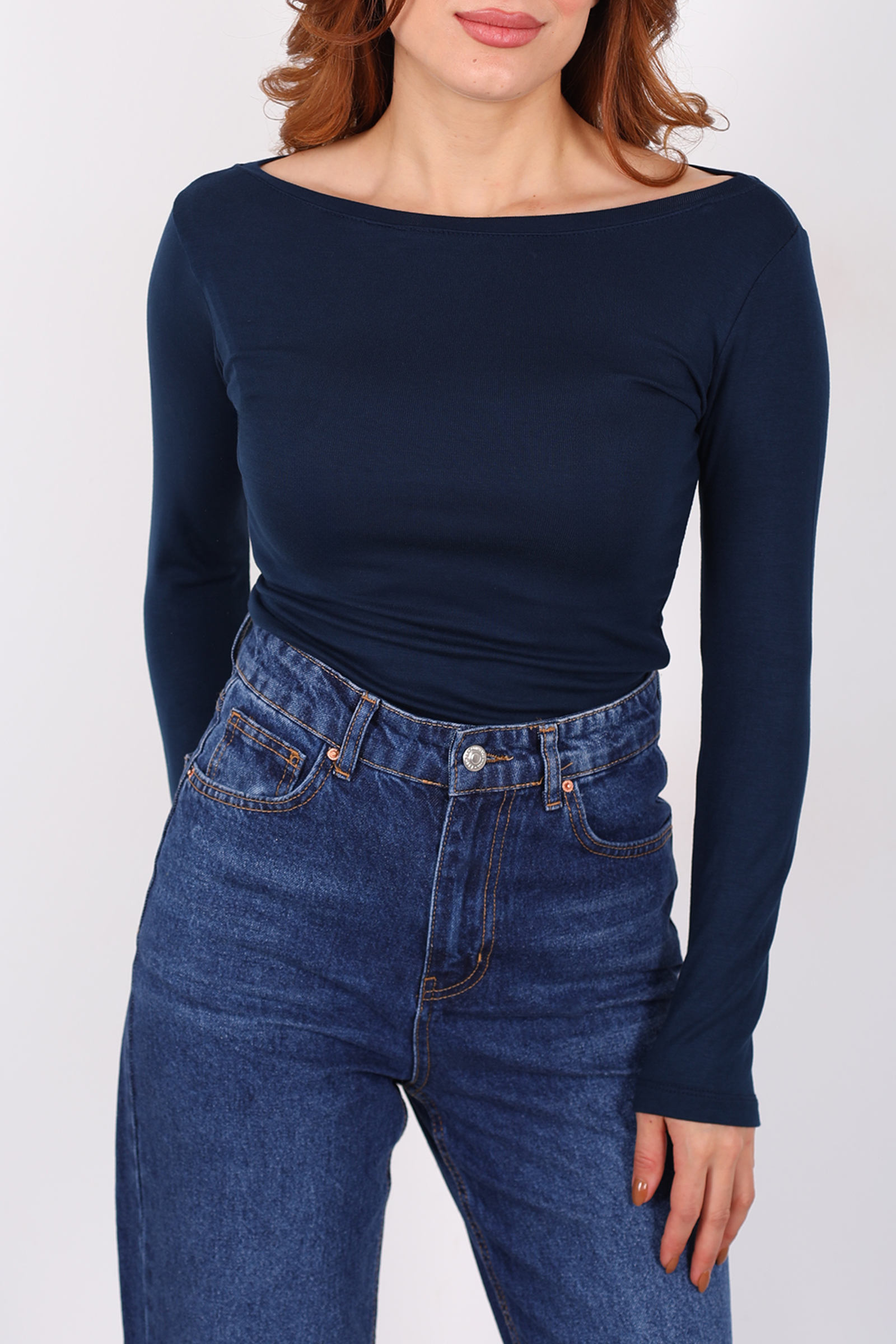Kayık Yaka Lacivert Kadın Basic Bluz