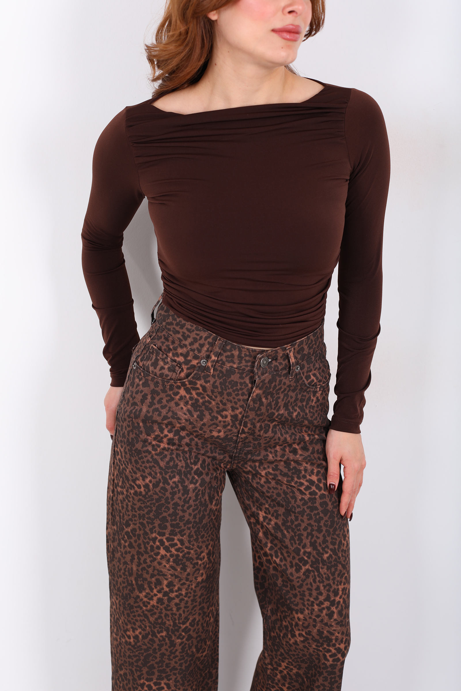 Sıcak kahvenin rengine benzeyen bu bluz, klasik üst giyim anlayışını doğal akış ve estetik doku ile birleştirir. Kayık yaka kesimi, omuz hattını hafifçe açarak yüzünüzü daha ferah ve zarif gösterir; büzgüler ise omuzdan bele doğru kumaşla ritmik bir dans yapıyormuş hissi verir. Bu detaylar, bluzu sadece sade bir parça olmaktan çıkarıp stilinize ritim ve karakter katan bir öğeye dönüştürür.