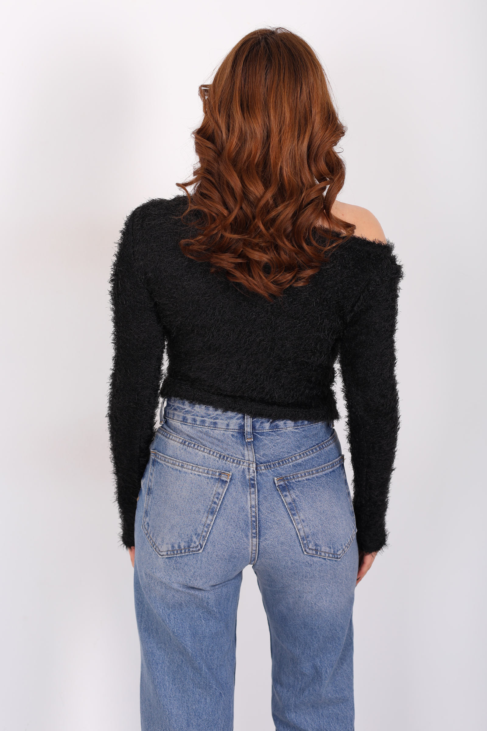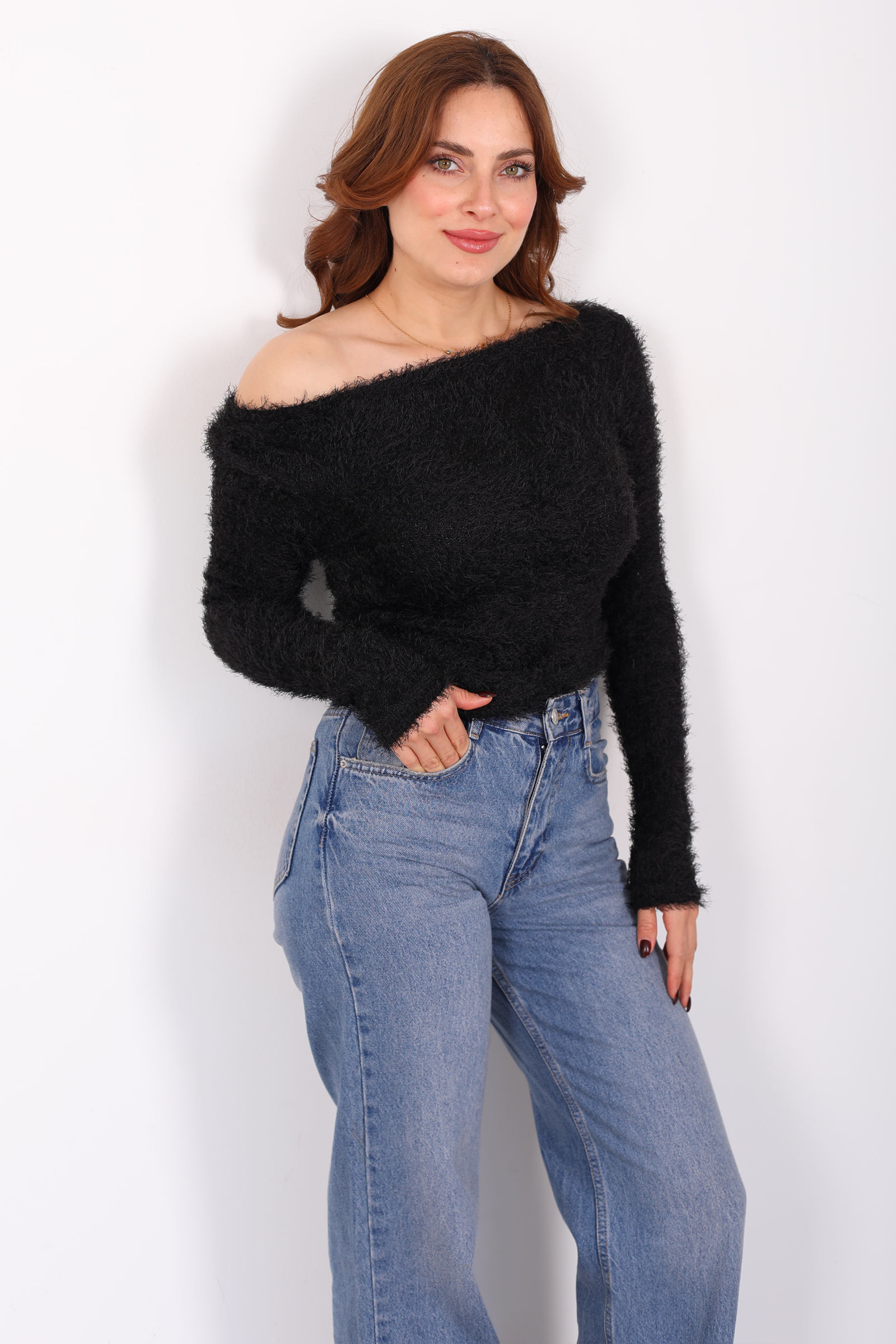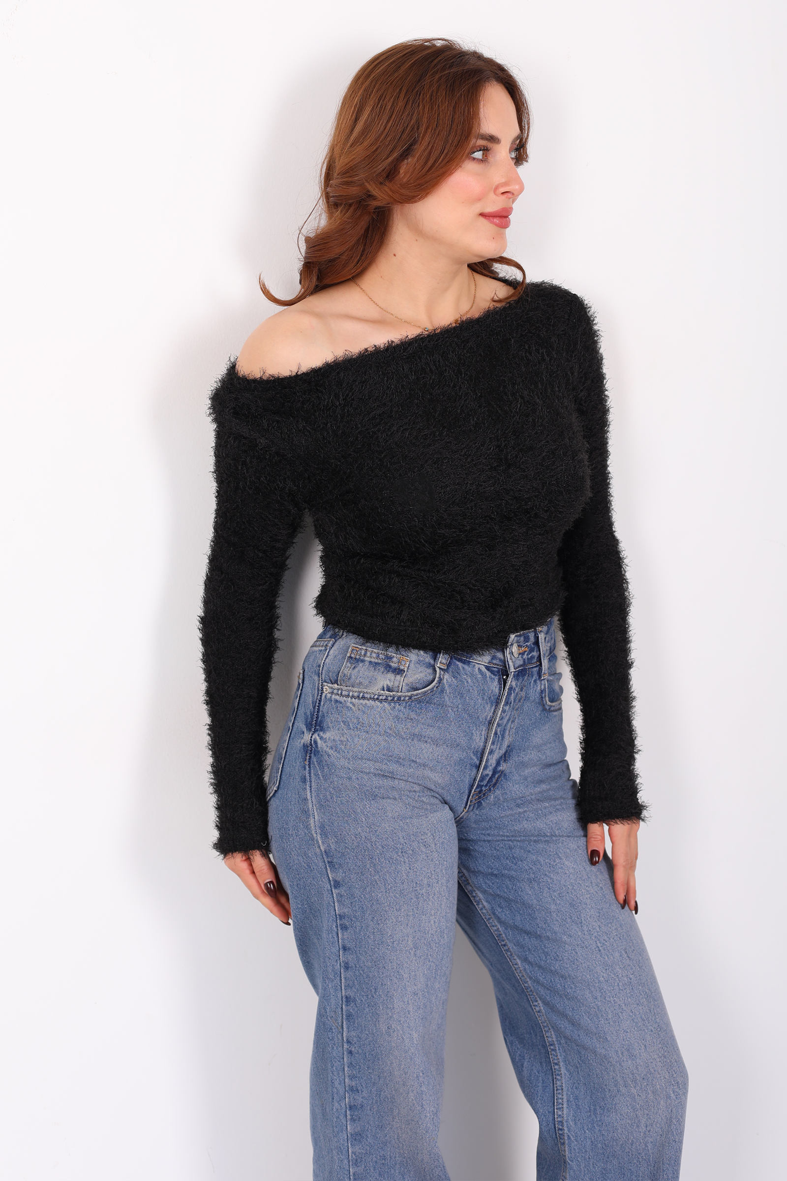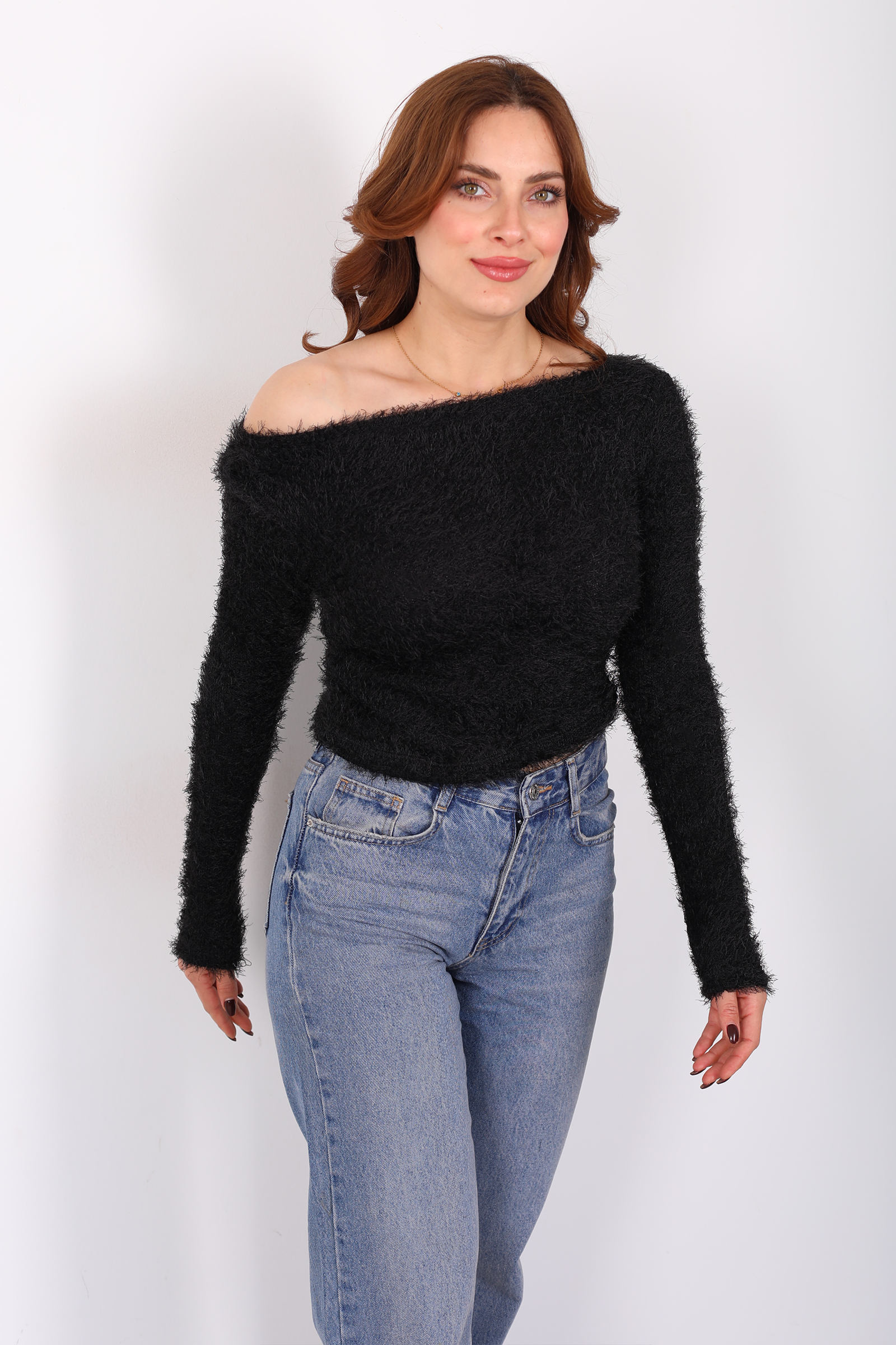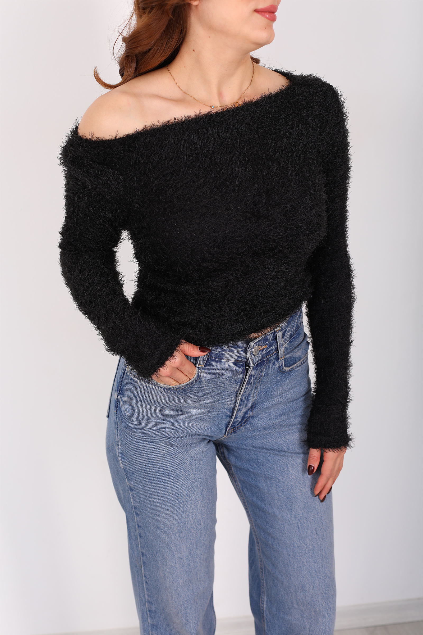 Kayık yakalı siyah sakallı kazak, minimal duruşu ile sofistike bir rahatlık sunar. Sakallı triko dokusu, yüzeyde hafif bir hacim ve sıcaklık hissi yaratırken, kayık yaka tasarımı omuz hattını zarifçe ortaya çıkarır. Yumuşak kumaş, gün boyu konfor sağlar ve jean’den etek ya da kumaş pantolona kadar pek çok alt parça ile dengeli uyum yakalar. Sade ama etkileyici bir görünüm arayanlara, casual stilin ötesinde bir zarafet katmak üzere tasarlandı.
