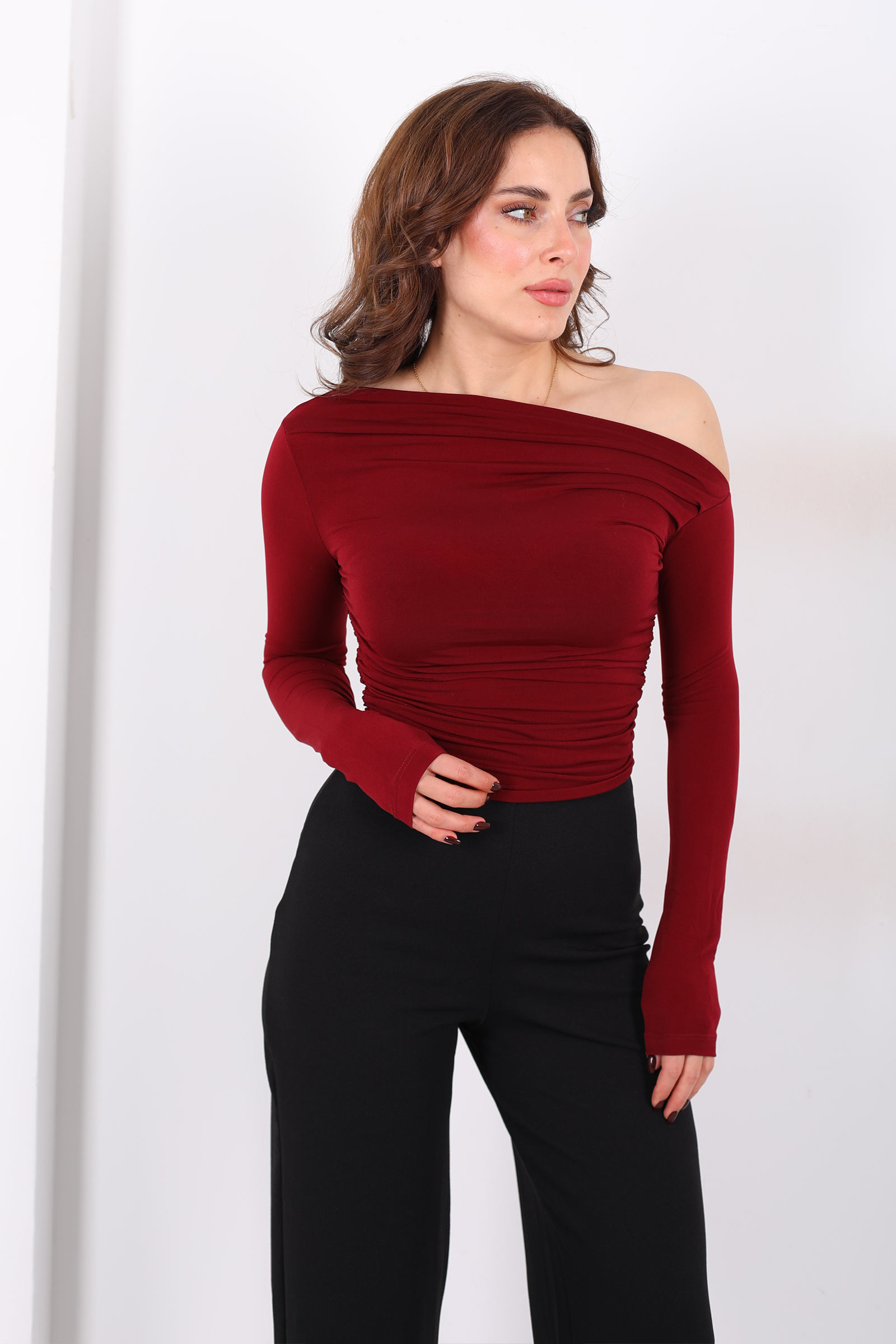Kayık Yaka Yanları Büzgülü Bordo Kadın Sandy Bluz