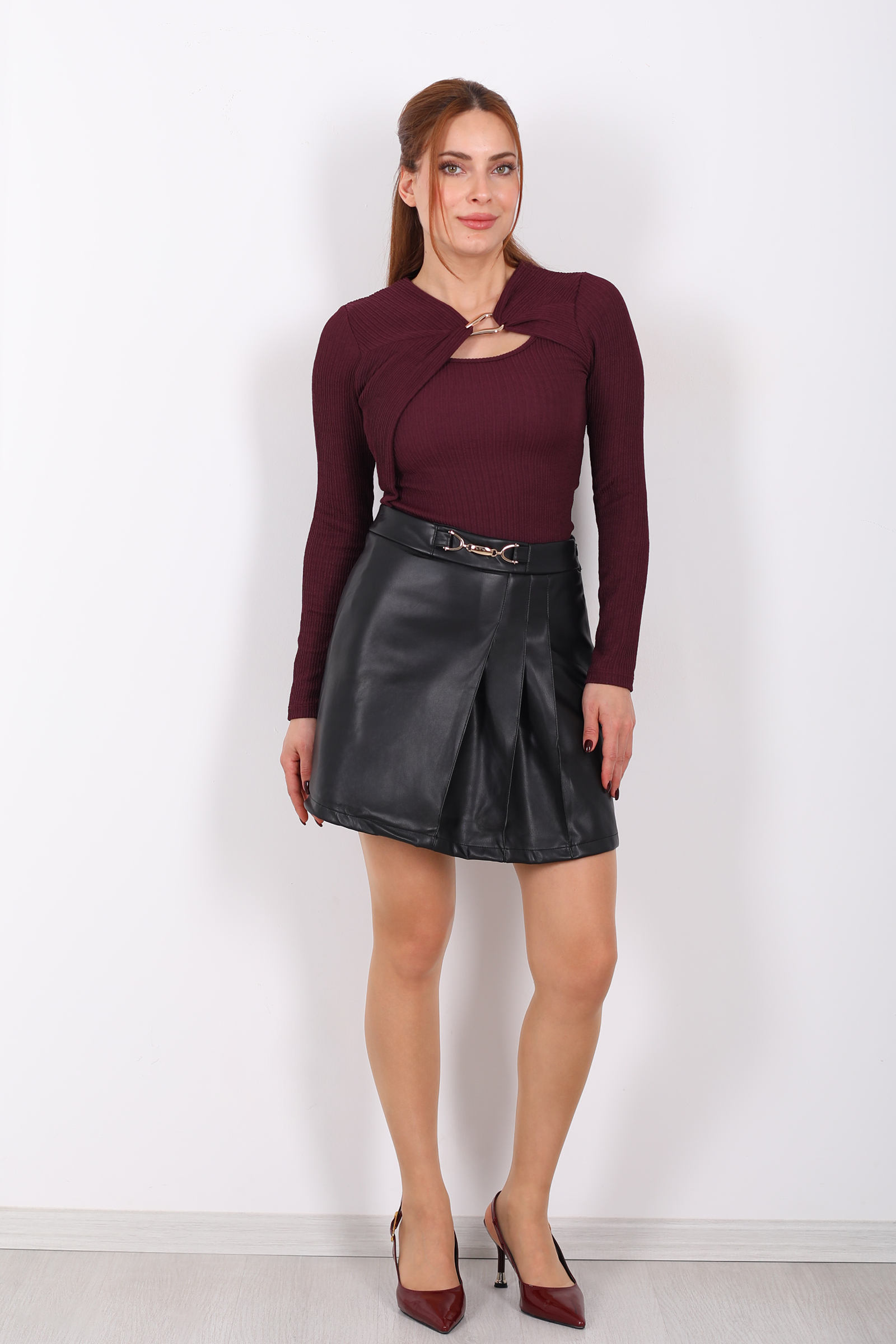 Kemeri Toka Detaylı Pileli Katlı Bordo Kadın Mini Etek