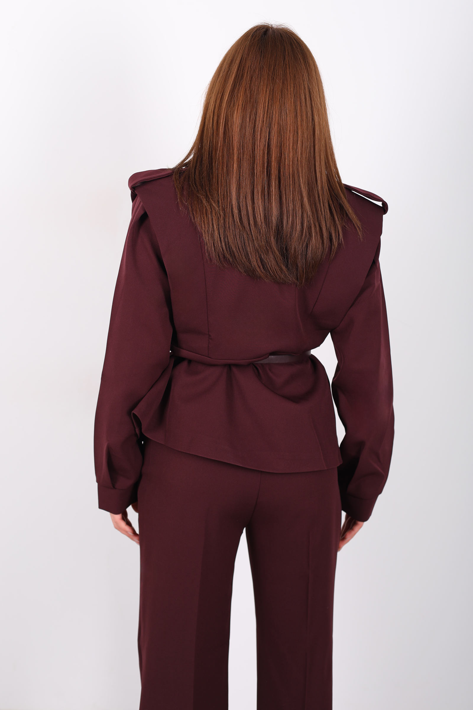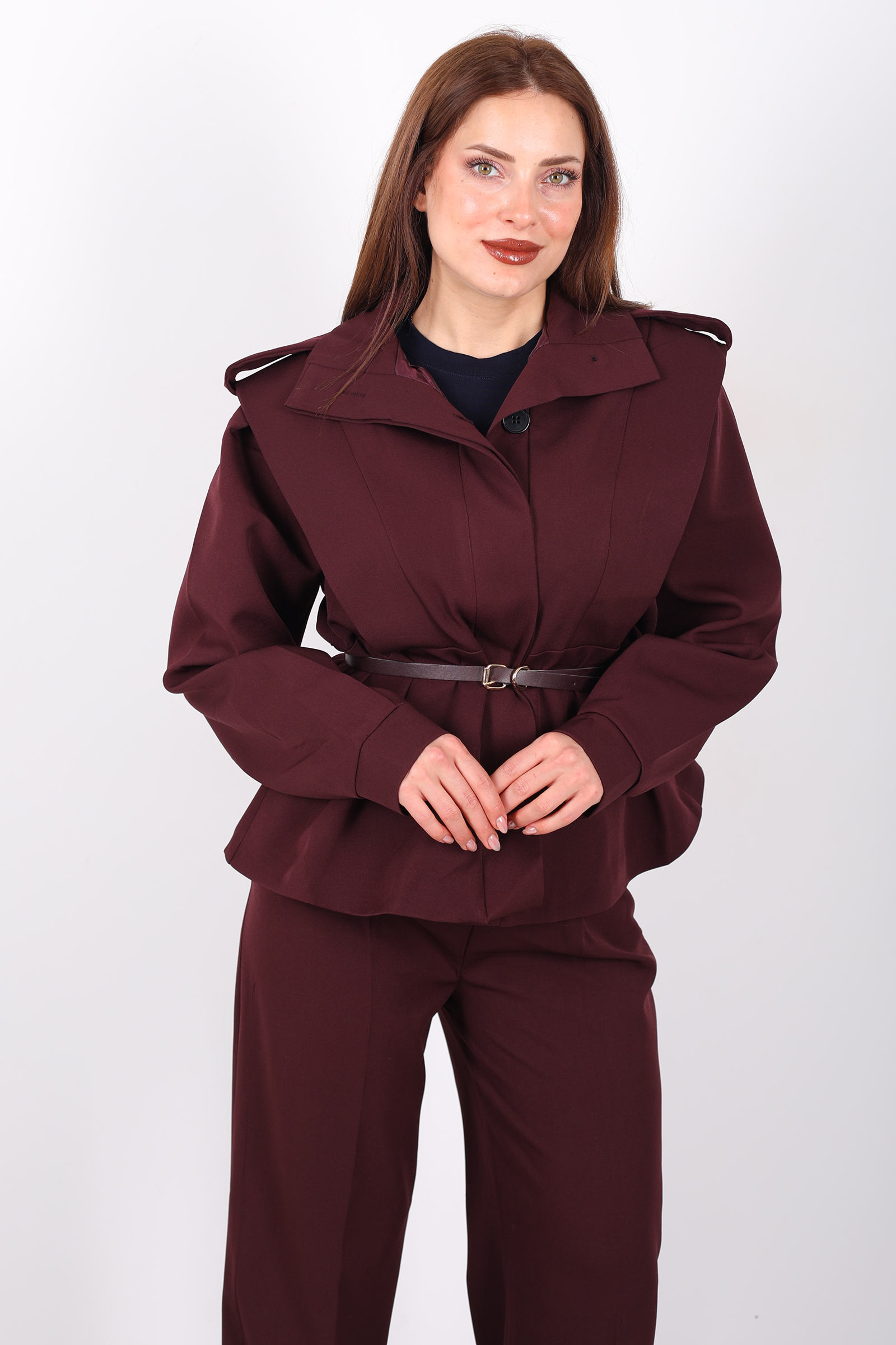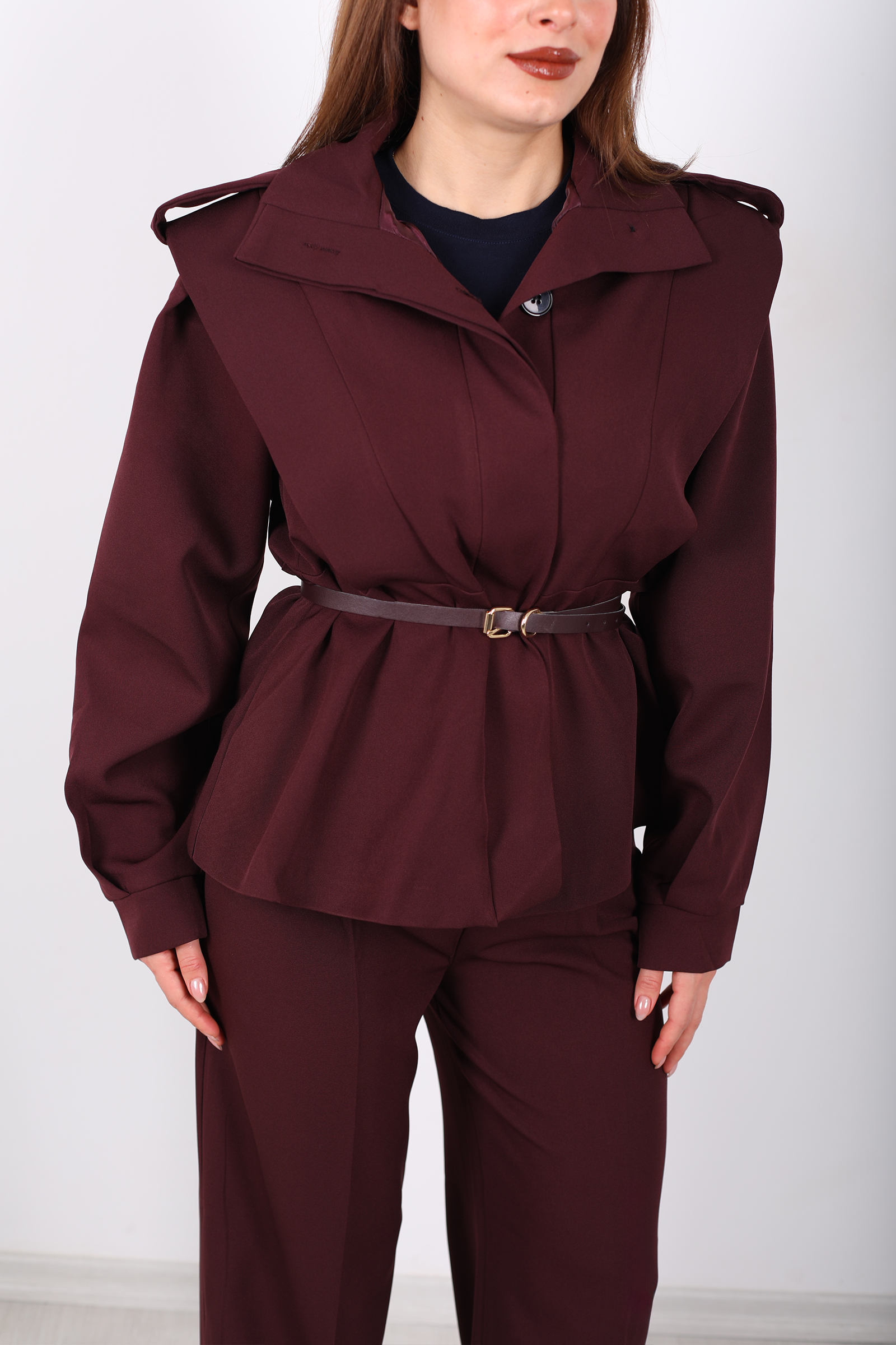 Bu kemer detaylı apoletli bordo ceket, güçlü tasarımı ve sofistike kesimiyle stilinizi tamamlar. Kemer detayı, belinizi vurgularken, apoletli omuz tasarımı ceketinizin güçlü duruşunu pekiştirir. Bordo rengi, şıklığı ve enerjik havasıyla her tür alt giyimle mükemmel uyum sağlar. Hem günlük kullanımda hem de özel davetlerde şıklığınızı ortaya çıkaran bu ceket, gardırobunuzda vazgeçilmez bir parça olmaya aday. Modern ve zarif çizgileriyle her ortamda göz kamaştırıcı bir stil oluşturur.