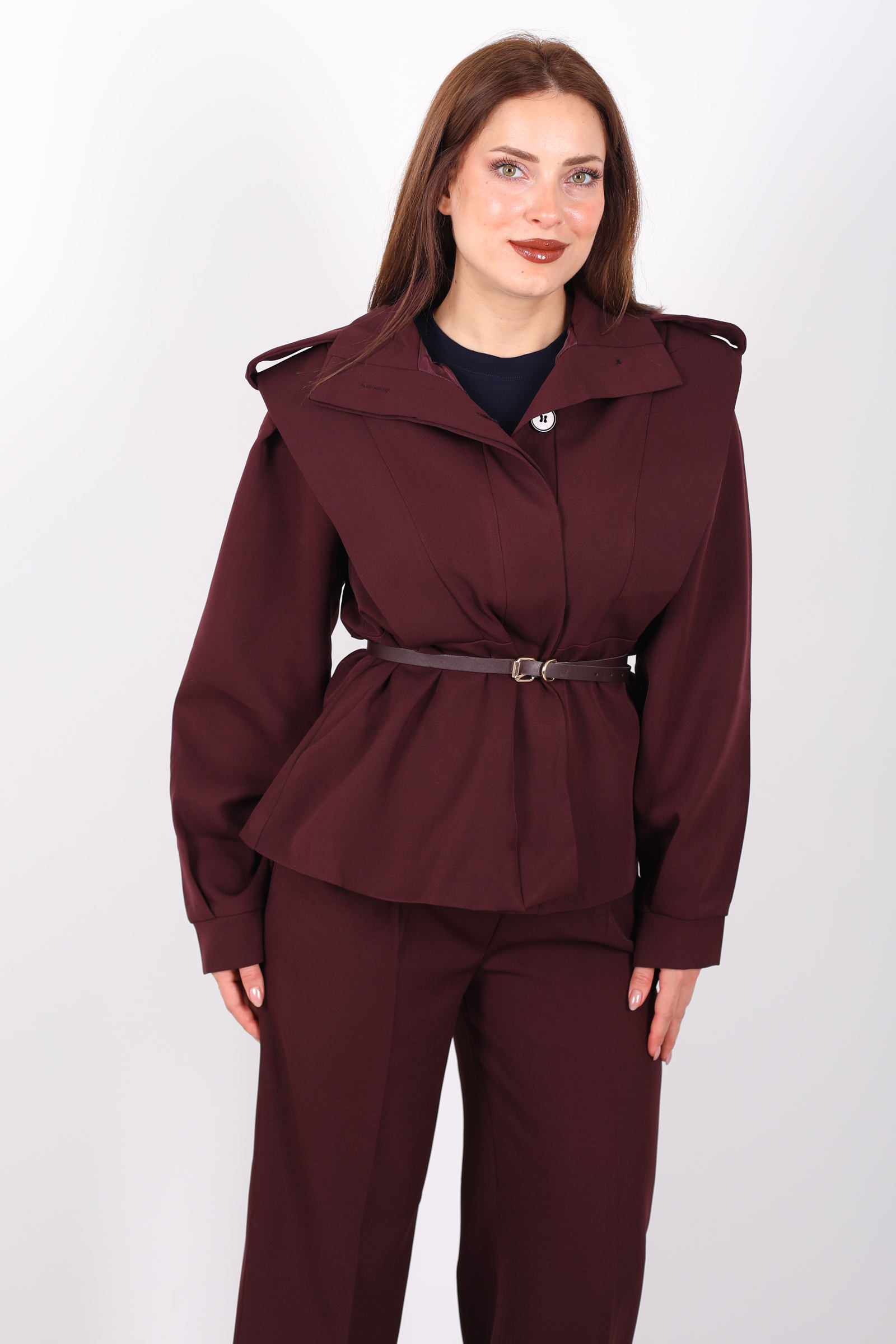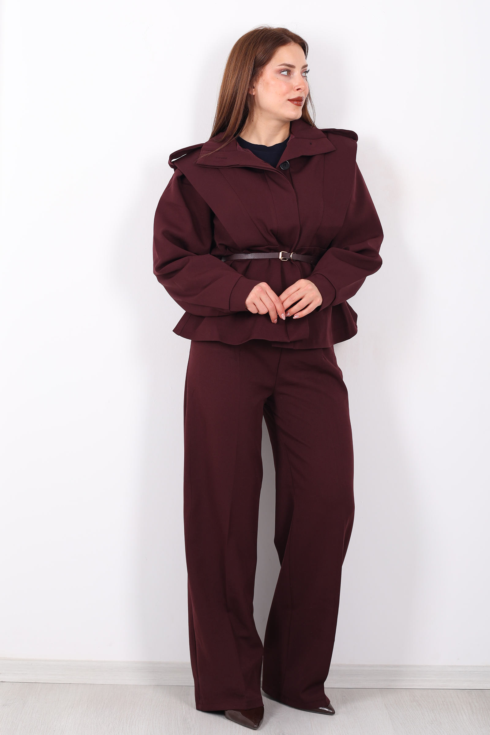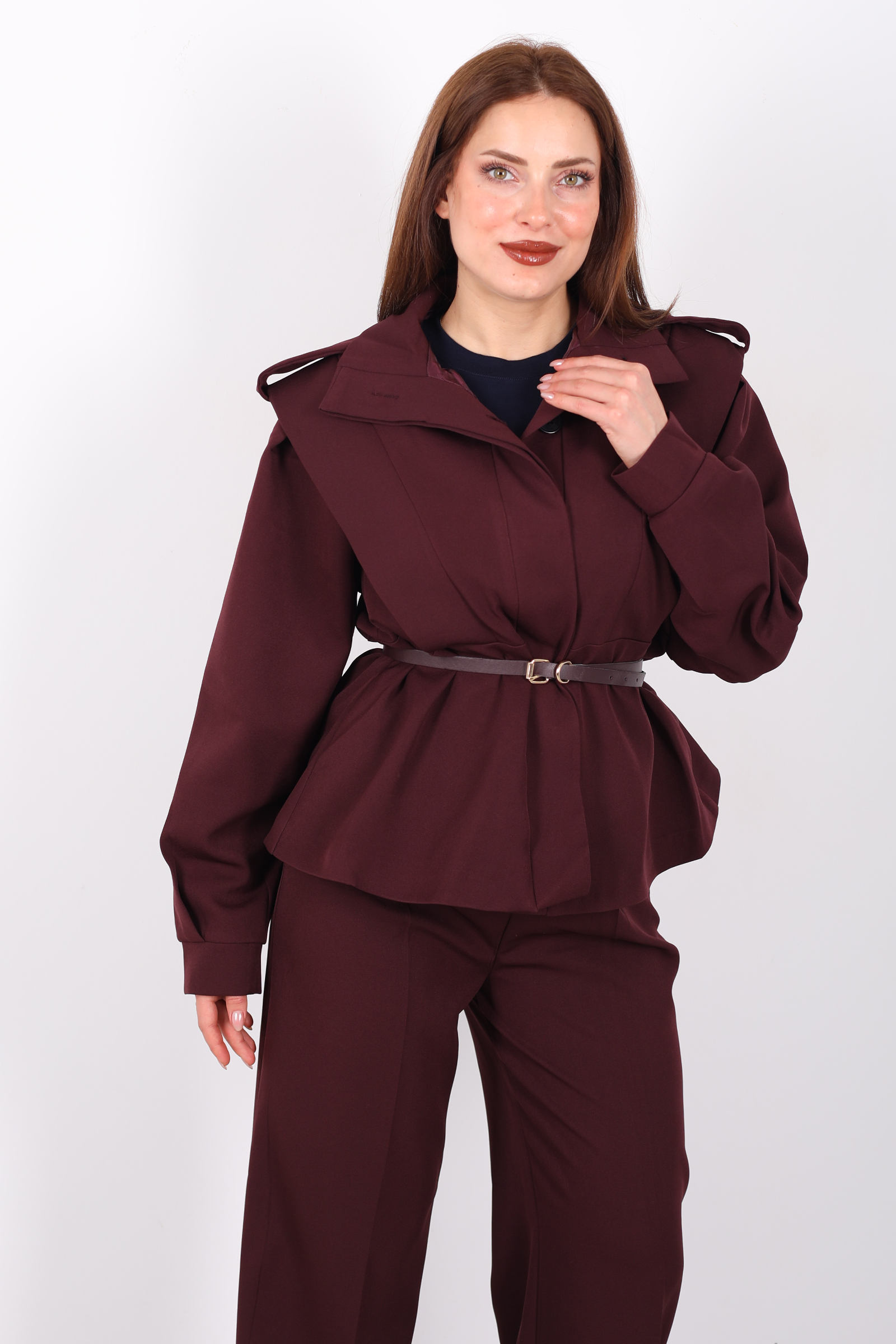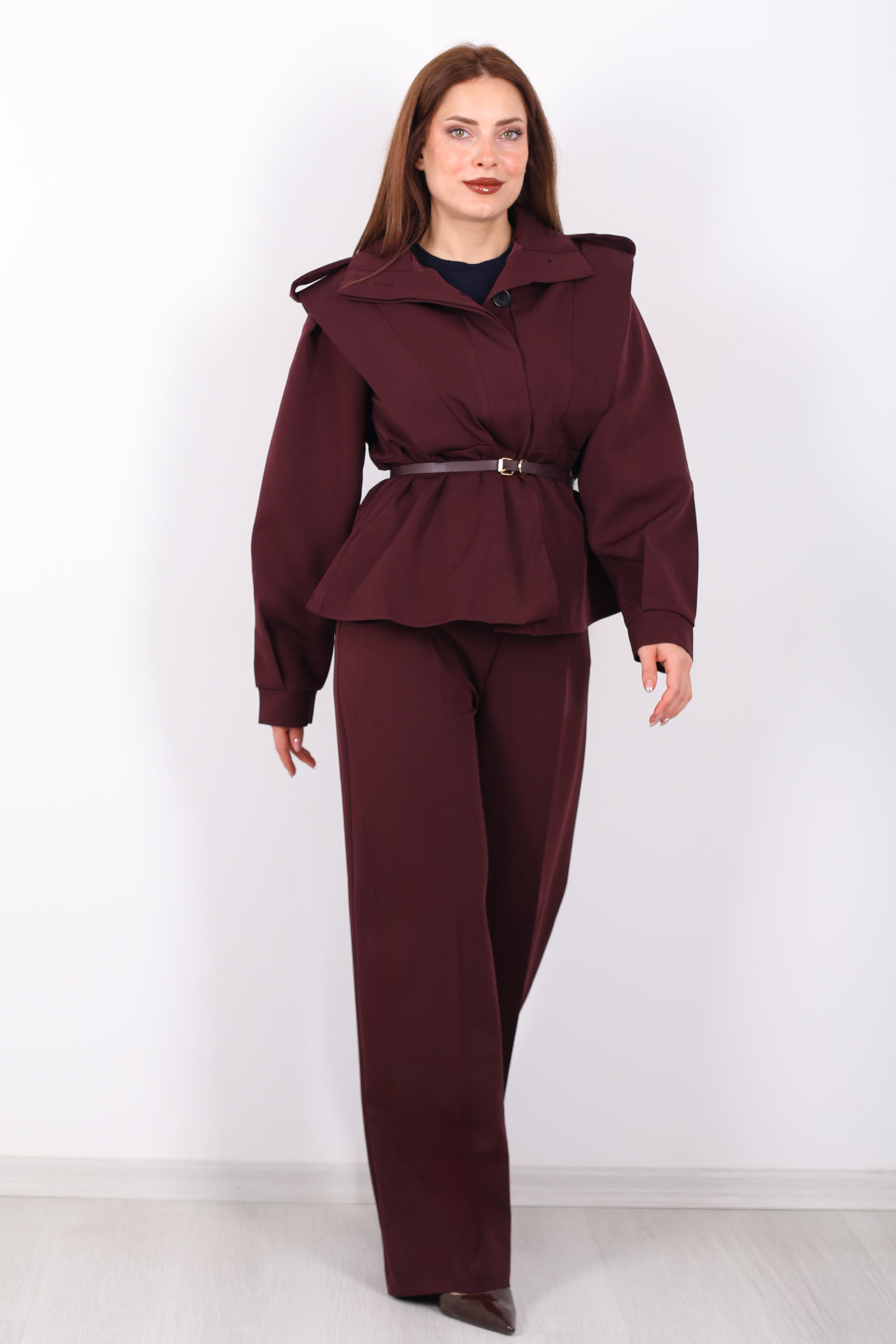 Bu kemer detaylı apoletli bordo ceket, güçlü tasarımı ve sofistike kesimiyle stilinizi tamamlar. Kemer detayı, belinizi vurgularken, apoletli omuz tasarımı ceketinizin güçlü duruşunu pekiştirir. Bordo rengi, şıklığı ve enerjik havasıyla her tür alt giyimle mükemmel uyum sağlar. Hem günlük kullanımda hem de özel davetlerde şıklığınızı ortaya çıkaran bu ceket, gardırobunuzda vazgeçilmez bir parça olmaya aday. Modern ve zarif çizgileriyle her ortamda göz kamaştırıcı bir stil oluşturur.