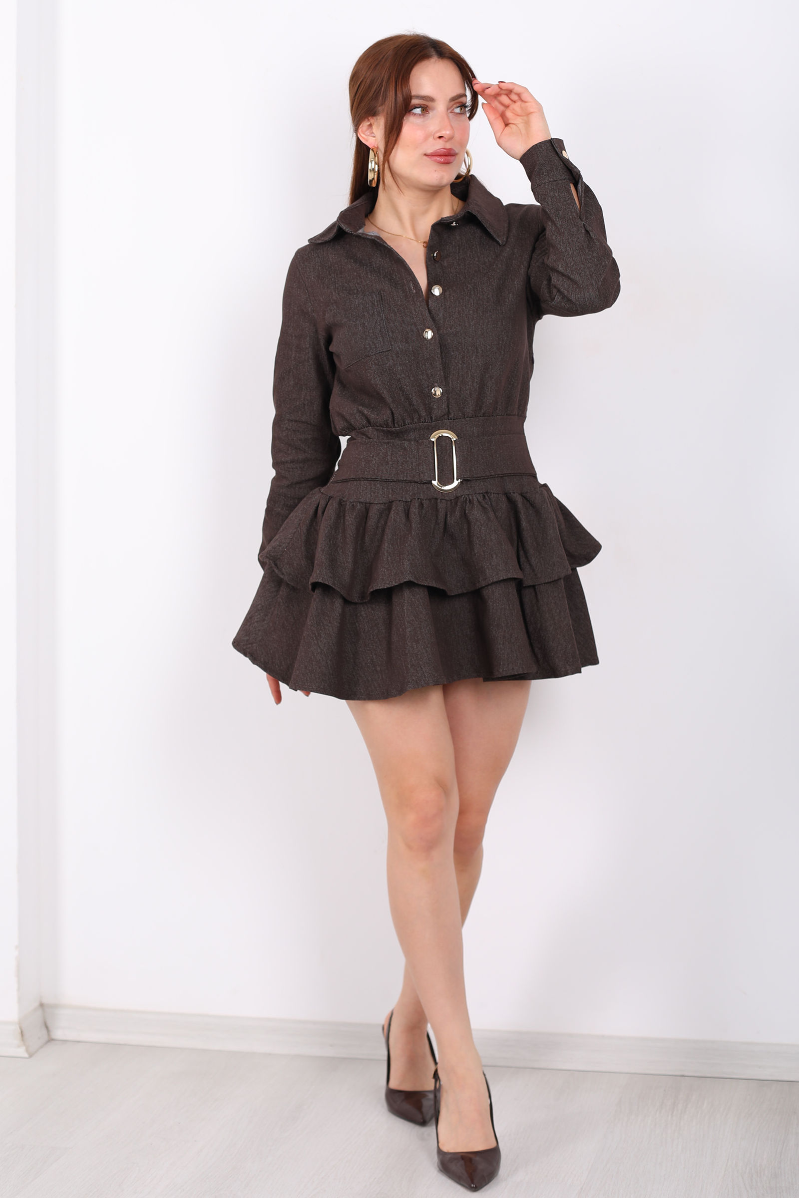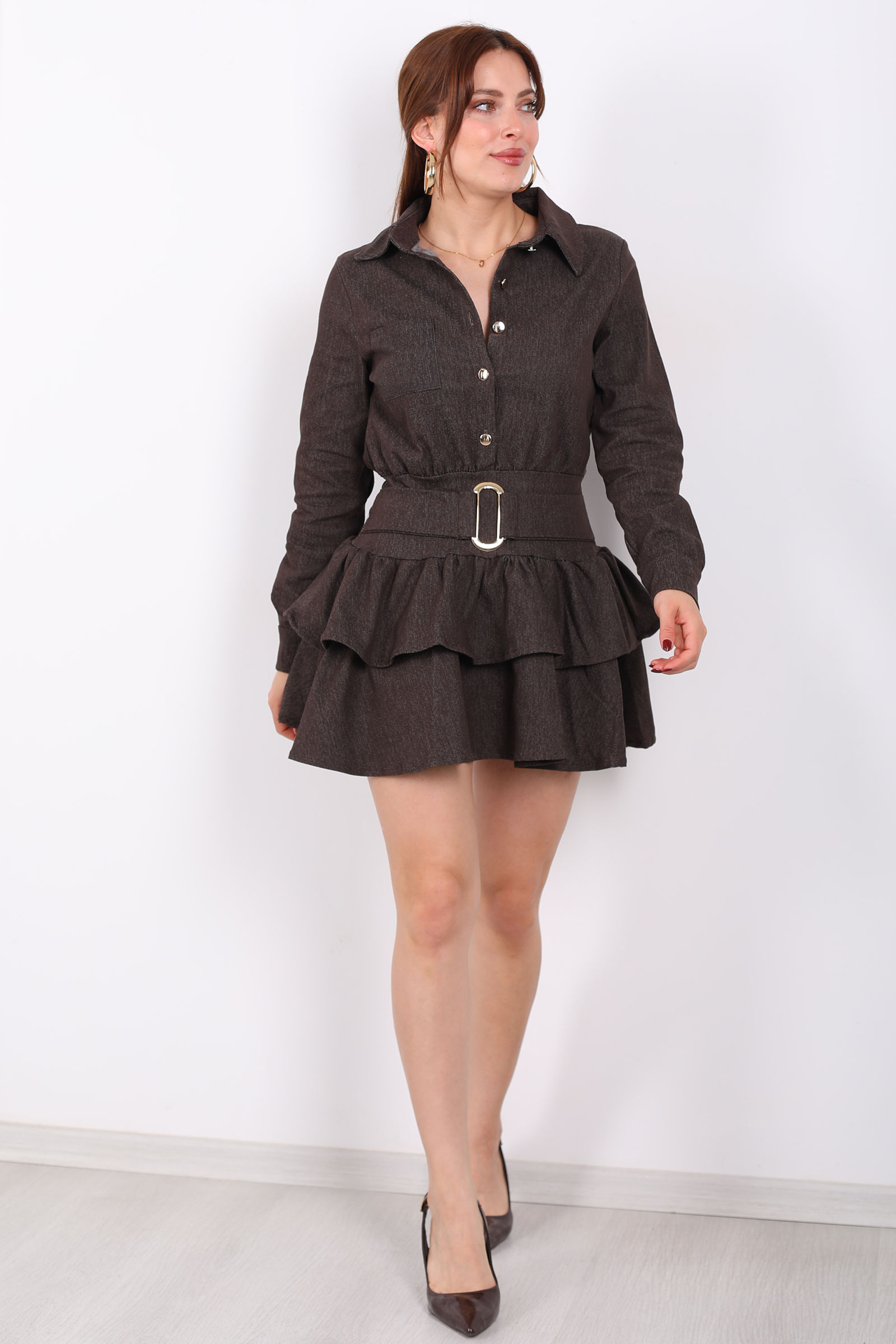 Kemer Detaylı Denim Fırfırlı Kahverengi Kadın Mini Elbise